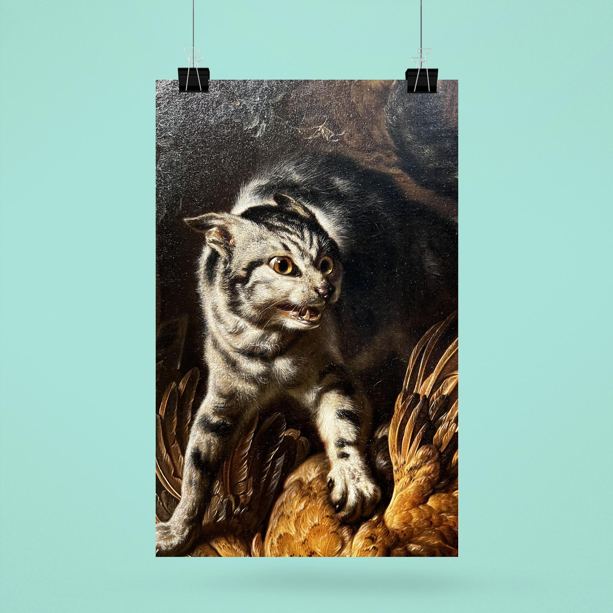 Bring home the charming scene of a cat standing guard over its spoils, captured with exquisite detail by Dirk Valkenburg. This poster transforms any space with a touch of whimsical tension and timeless artistry, celebrating the spirited bond—and rivalry—between these familiar companions. Perfect for animal lovers and art enthusiasts alike, it invites you to savor a moment frozen in playful defense.