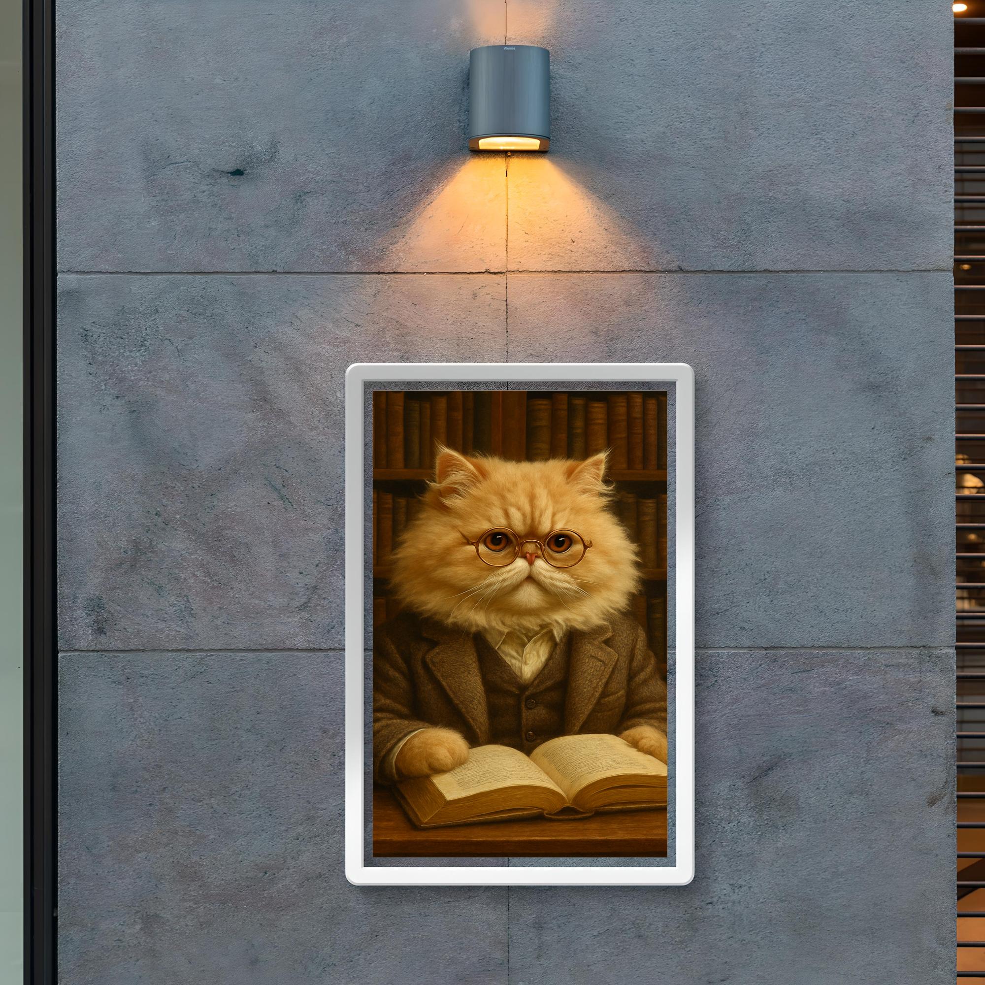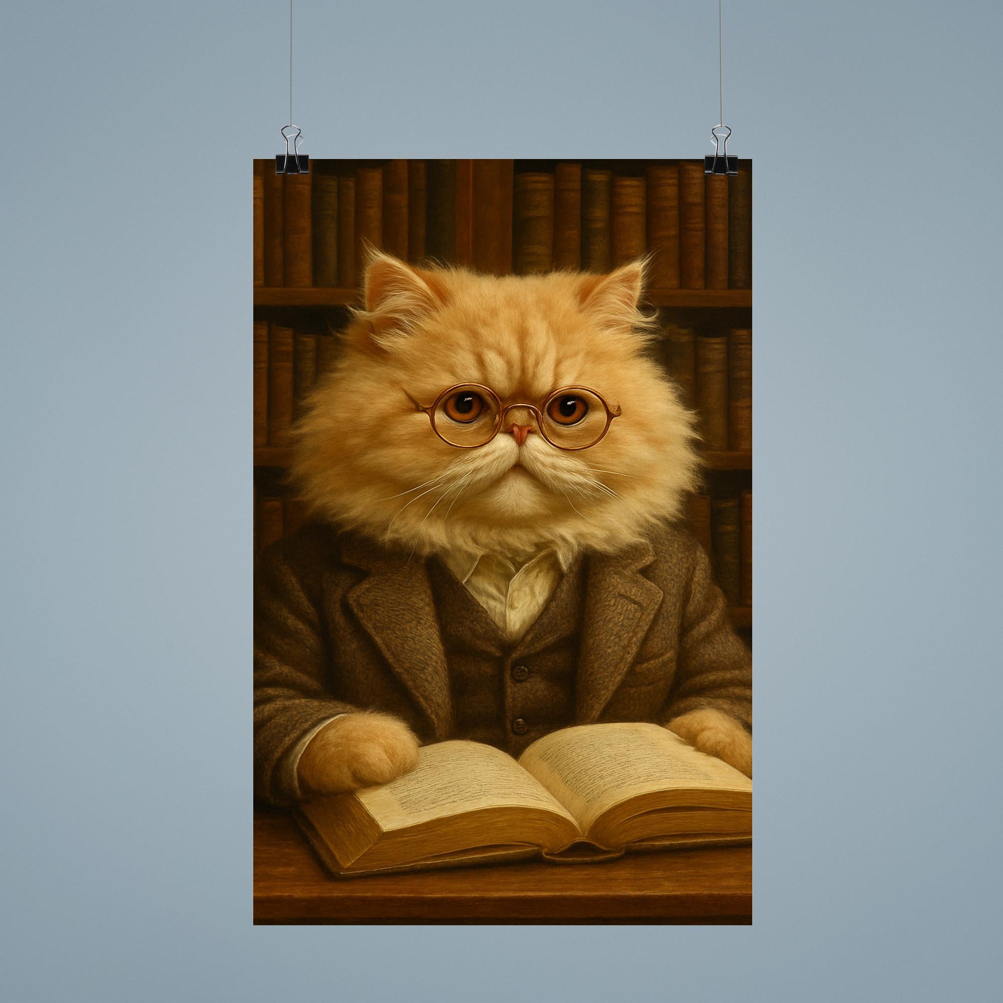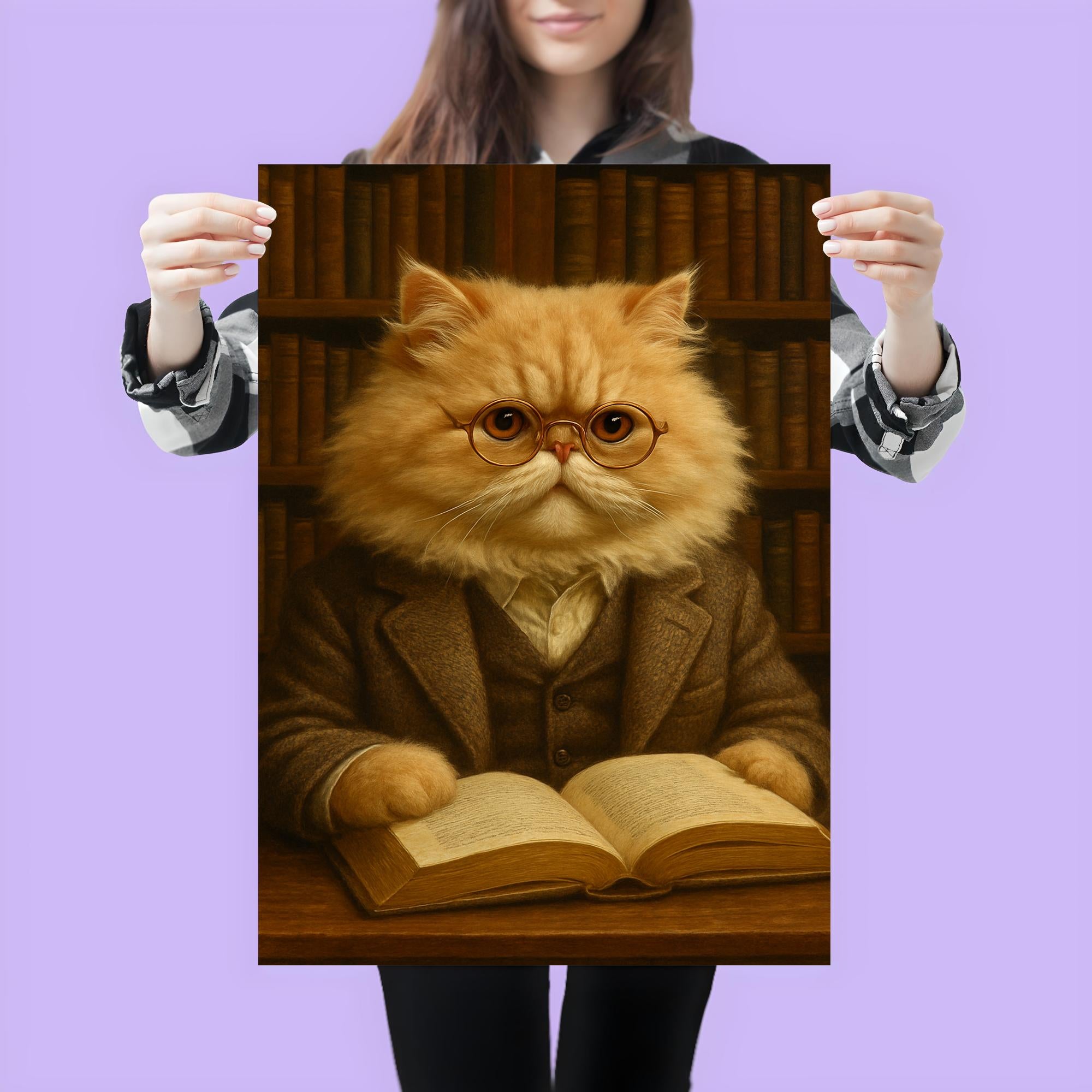 Bring a touch of whimsical charm and cozy sophistication to your space with this poster featuring a fluffy Persian cat engrossed in a book. Dressed in a tweed jacket and spectacles, the cat exudes an air of timeless intellect amidst a classic library setting—perfect for book lovers and cat enthusiasts alike. This unique piece invites you to unwind and embrace the quiet joy of a well-read moment.