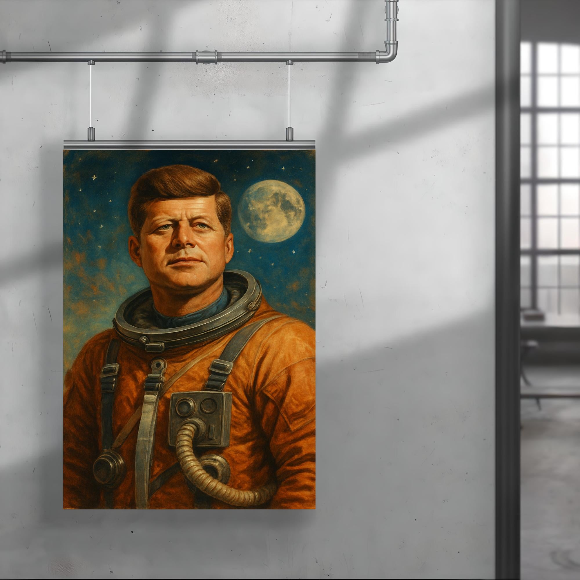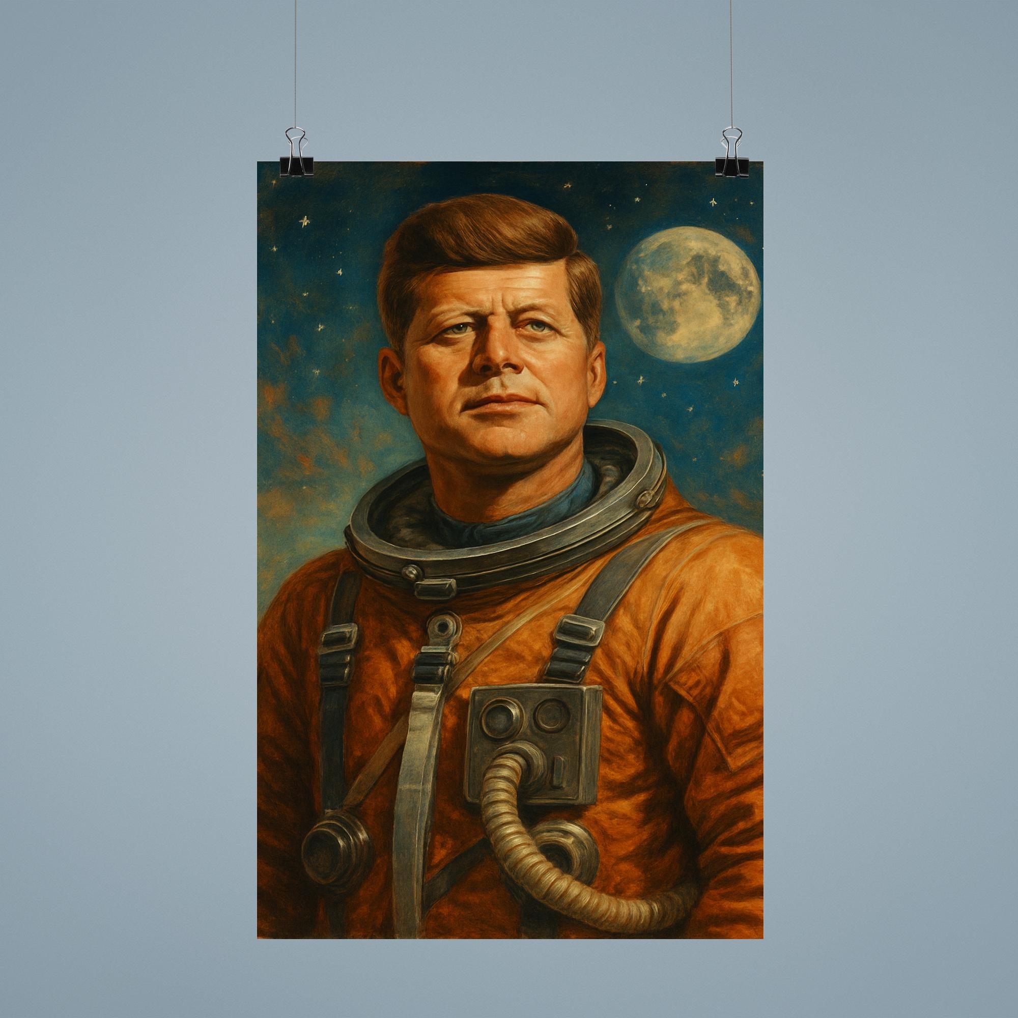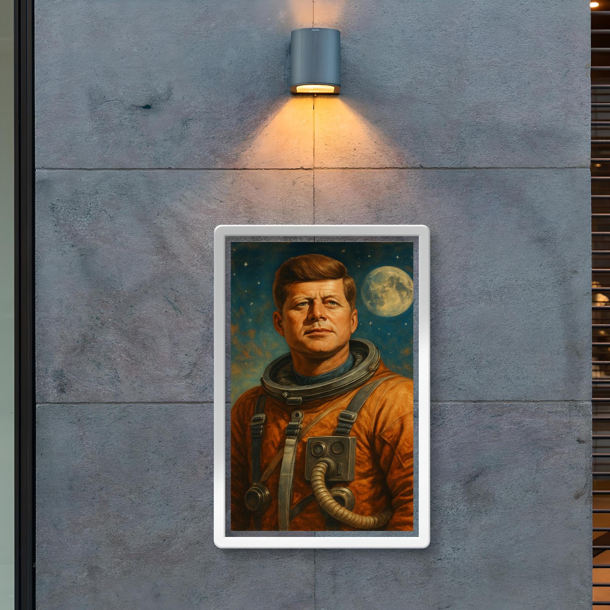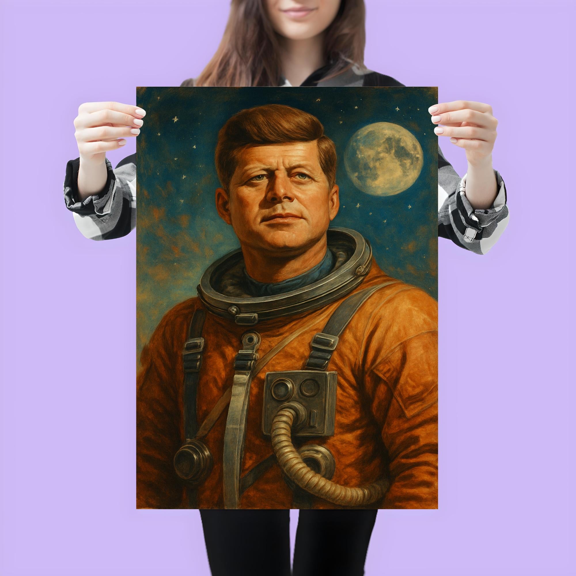 Elevate your space with a striking tribute to history and ambition: a bold portrait of John F. Kennedy clad in a retro astronaut suit. This captivating poster merges timeless leadership with visionary exploration, inspiring you to reach for the stars while honoring a true icon. Perfect for sparking conversation and adding a heroic touch to any room.