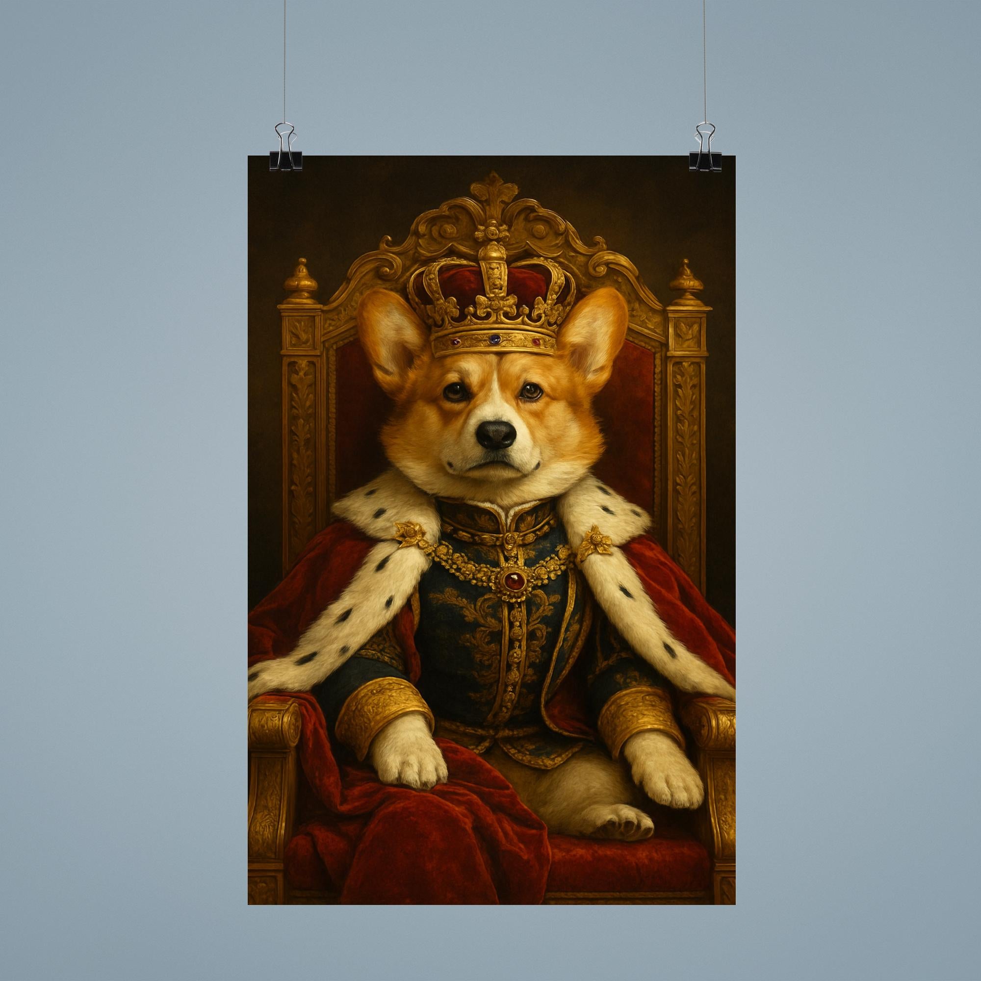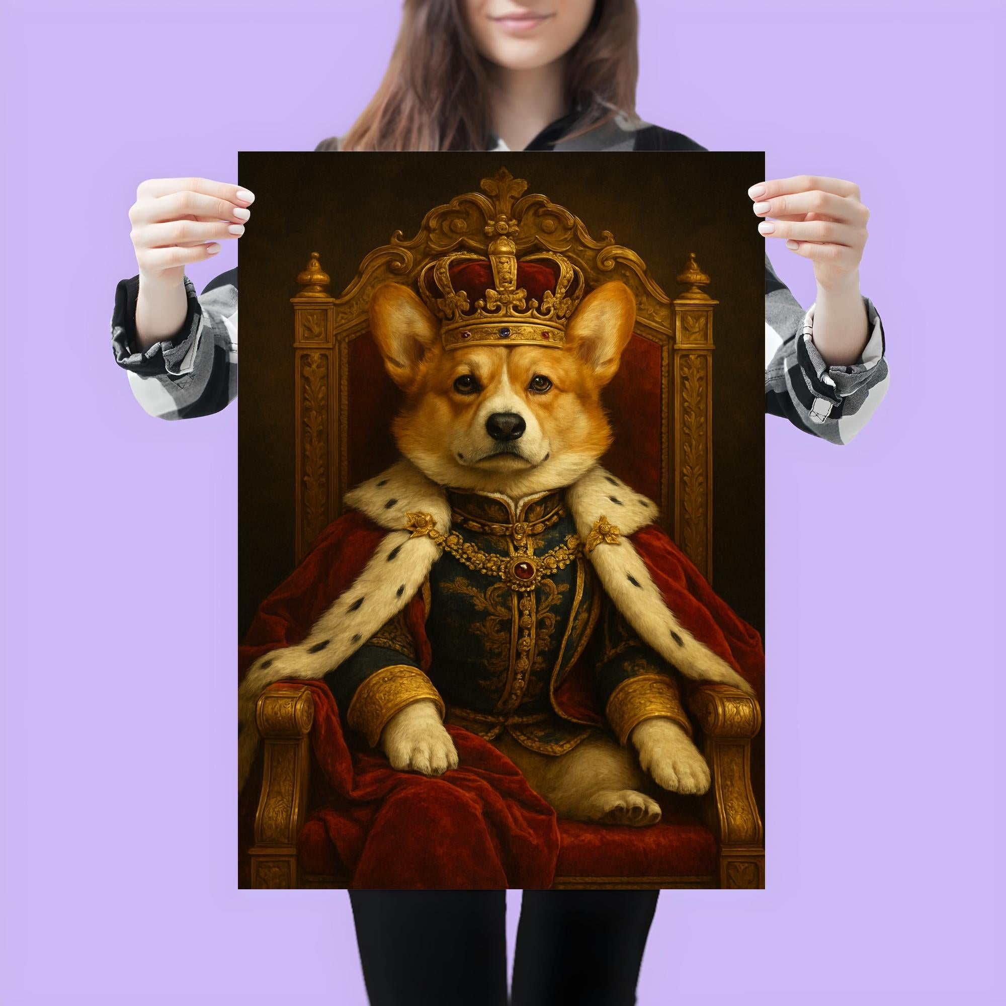 Elevate your space with the majestic charm of this regal Corgi poster, featuring the beloved pup adorned in full royal regalia and a crown, seated proudly on an ornate throne. This captivating artwork blends dignity and whimsy, making it the perfect statement piece for any room that craves a touch of noble flair. Celebrate canine royalty in style and let this distinguished Corgi reign supreme on your wall.