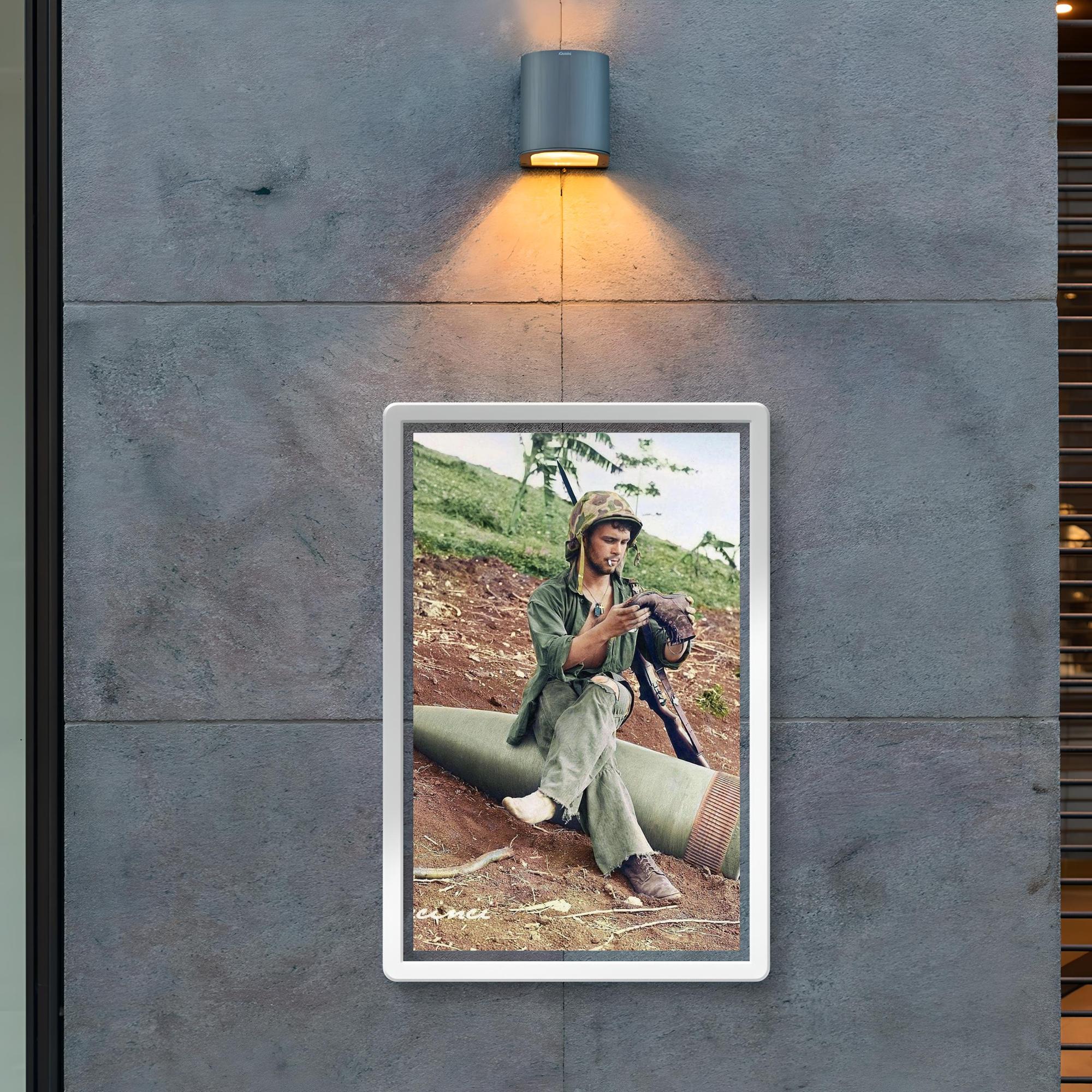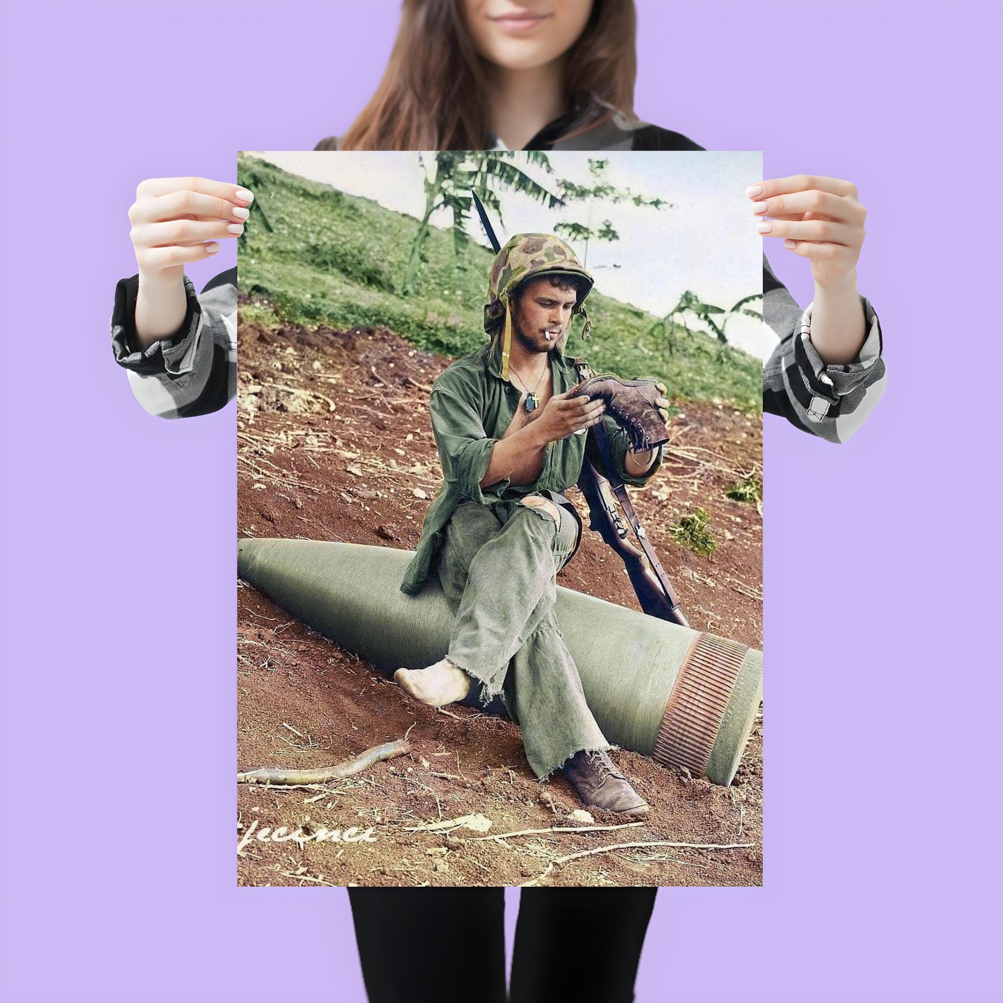 Capture a powerful moment in history with this striking poster of a US Marine clearing his boot on a 16” Naval Artillery Shell during the fierce battles of Saipan, June 1944. This evocative image conveys raw determination and resilience, embodying the grit of those who fought in one of World War II’s pivotal campaigns. Perfect for history enthusiasts or anyone inspired by courage under fire.