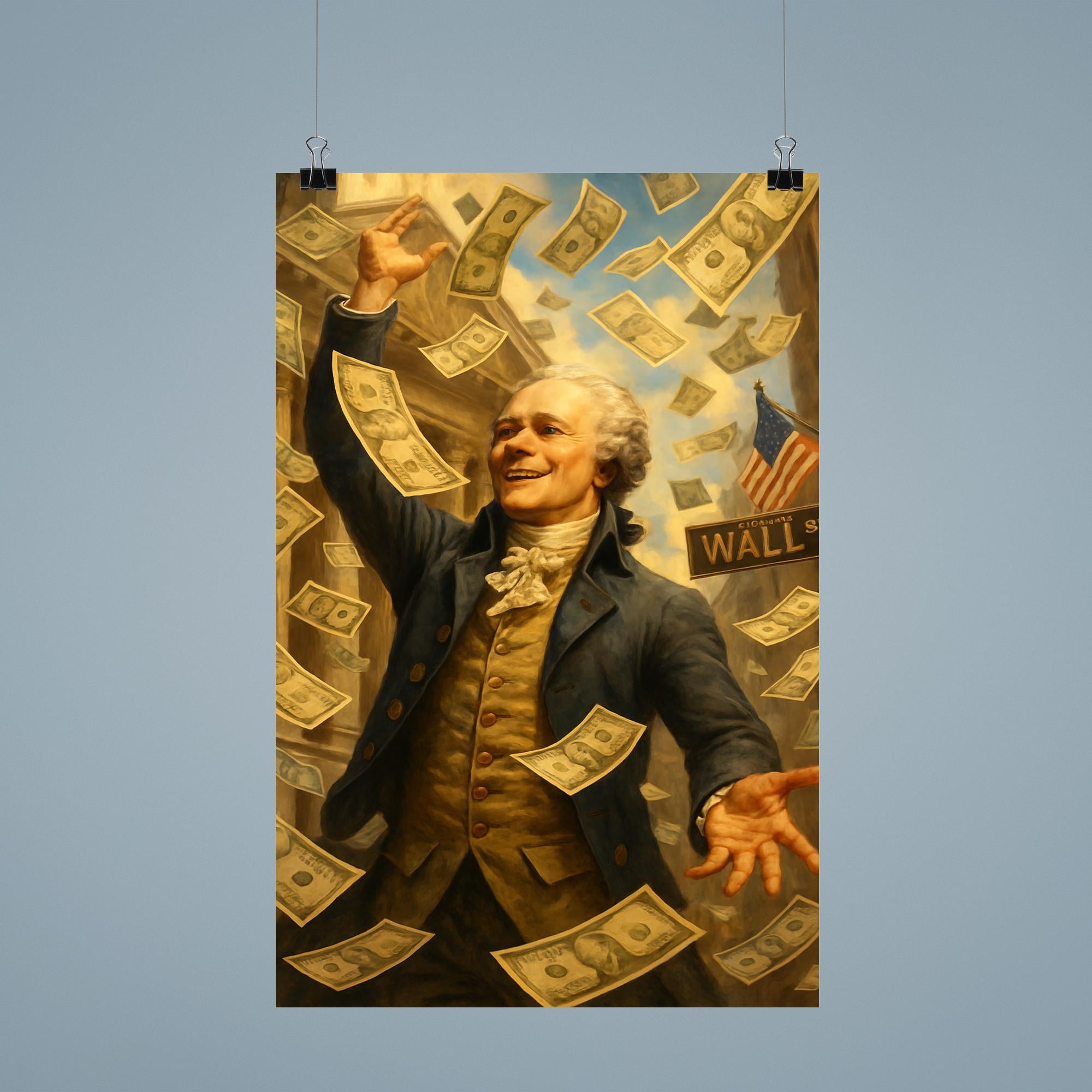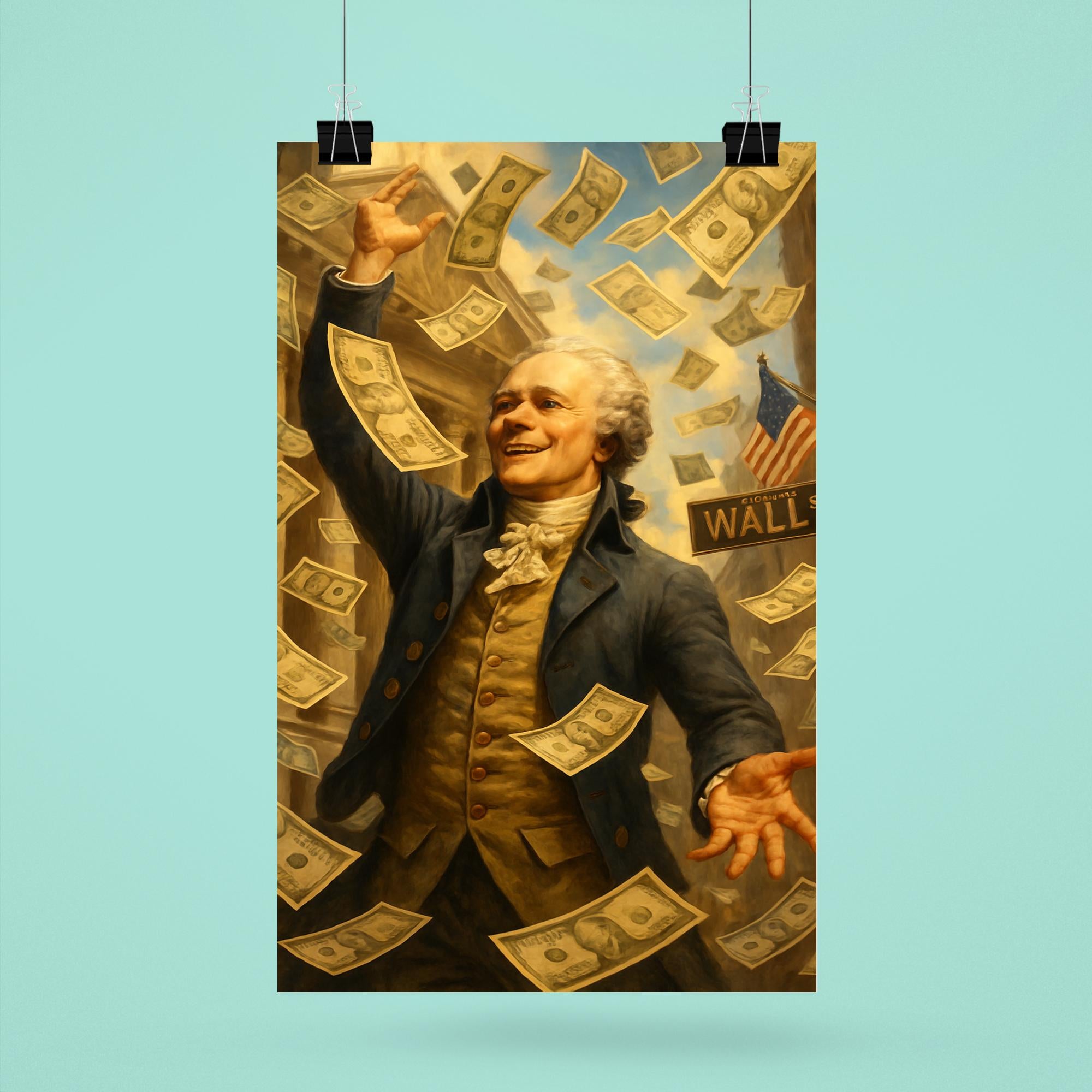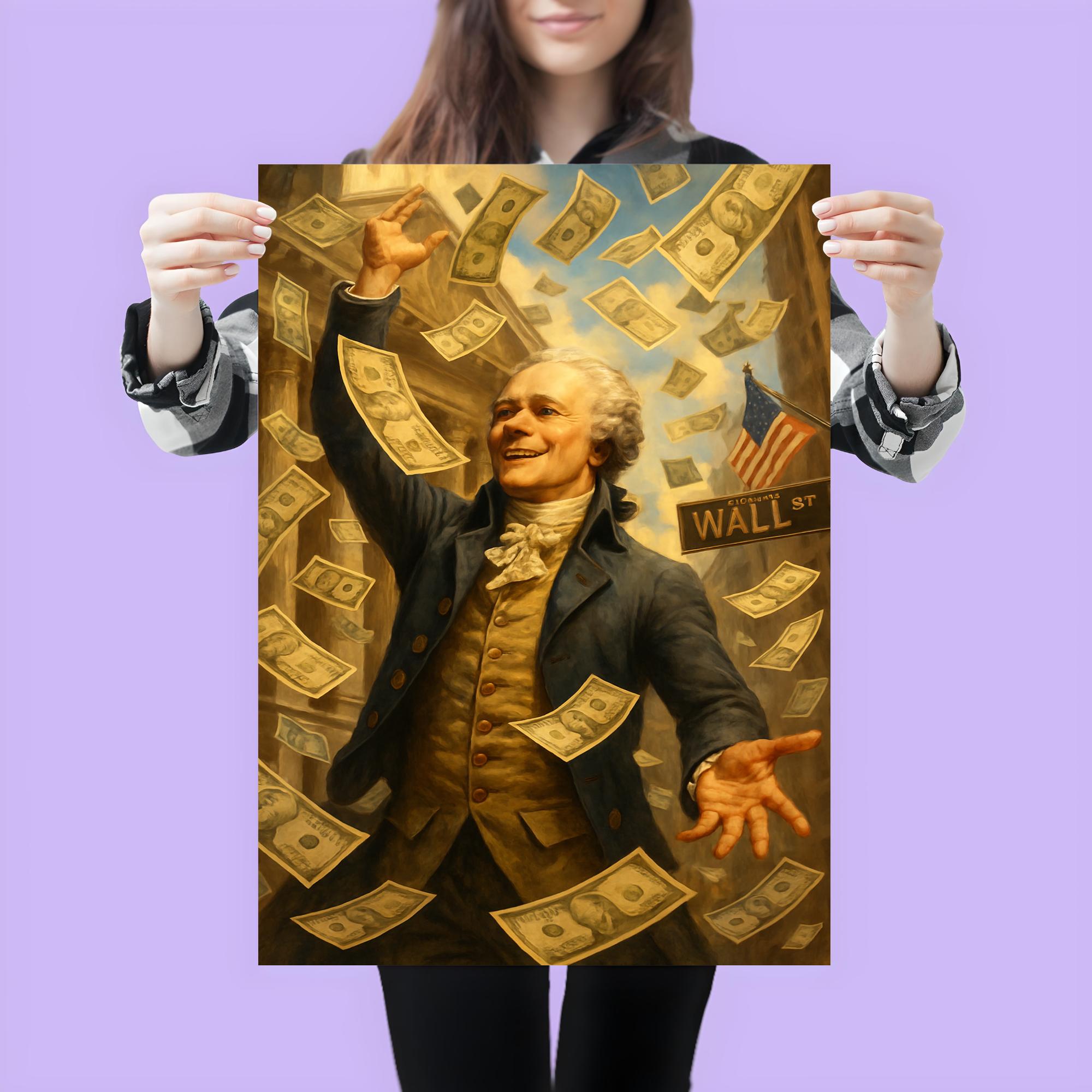 Bring energy and audacity to your space with this striking poster of Alexander Hamilton tossing paper money like confetti on Wall Street. This bold artwork captures the spirit of finance and ambition, making it a perfect statement piece for any office, study, or living room. Celebrate the thrill of the marketplace and the hustle of America's founding finance mastermind with a design that commands attention and inspires drive.