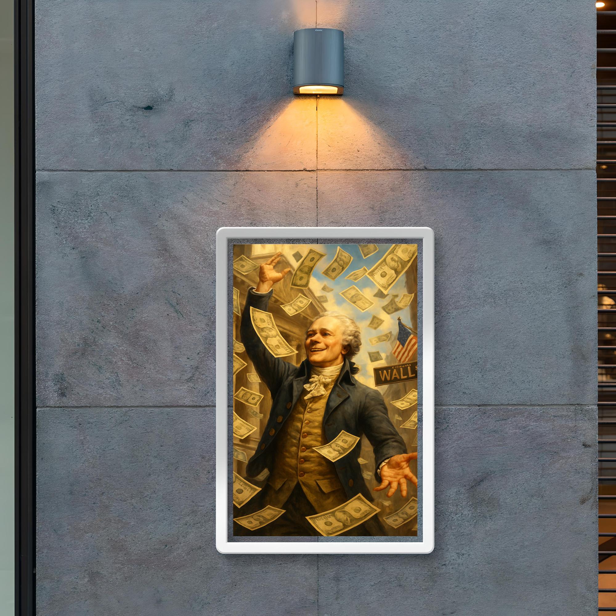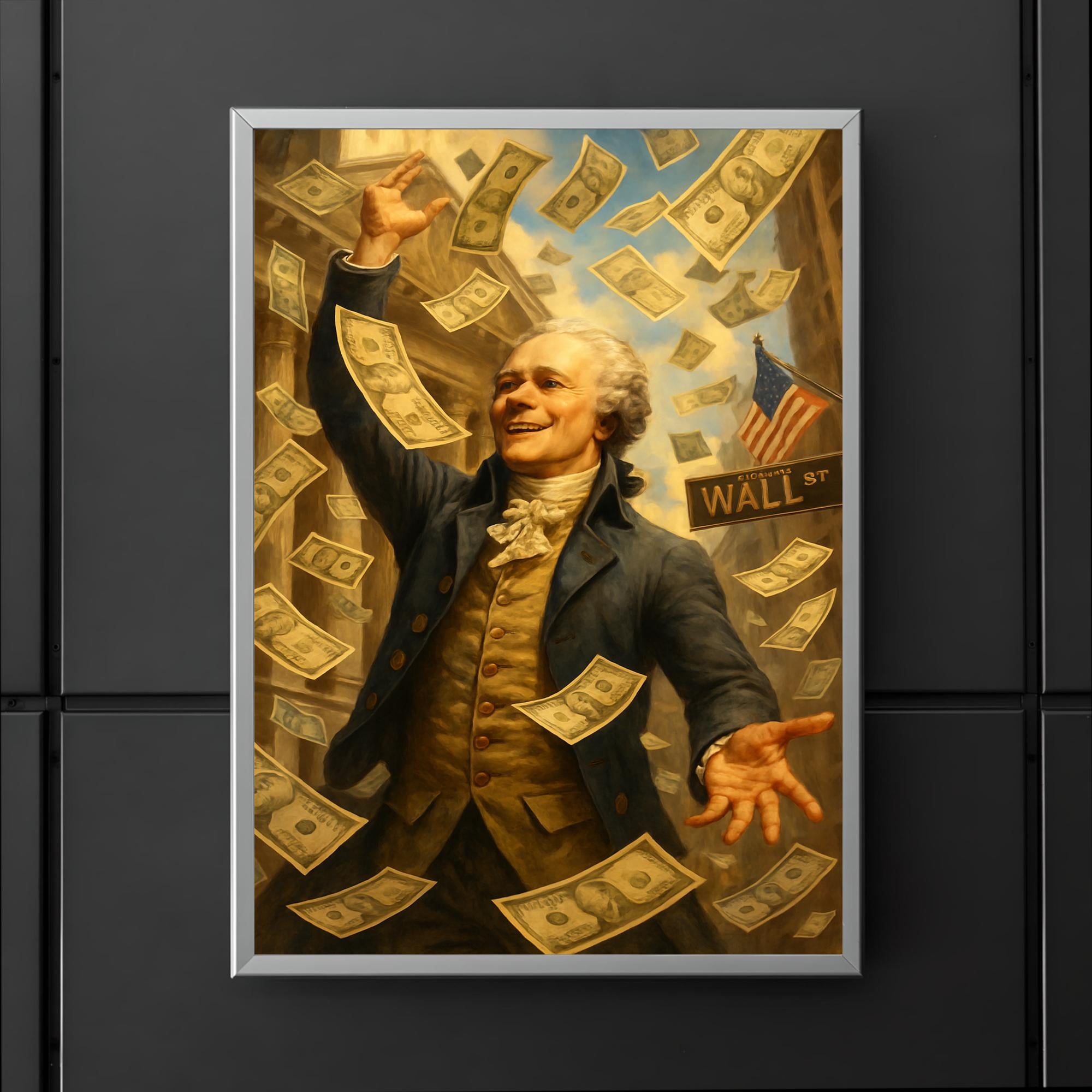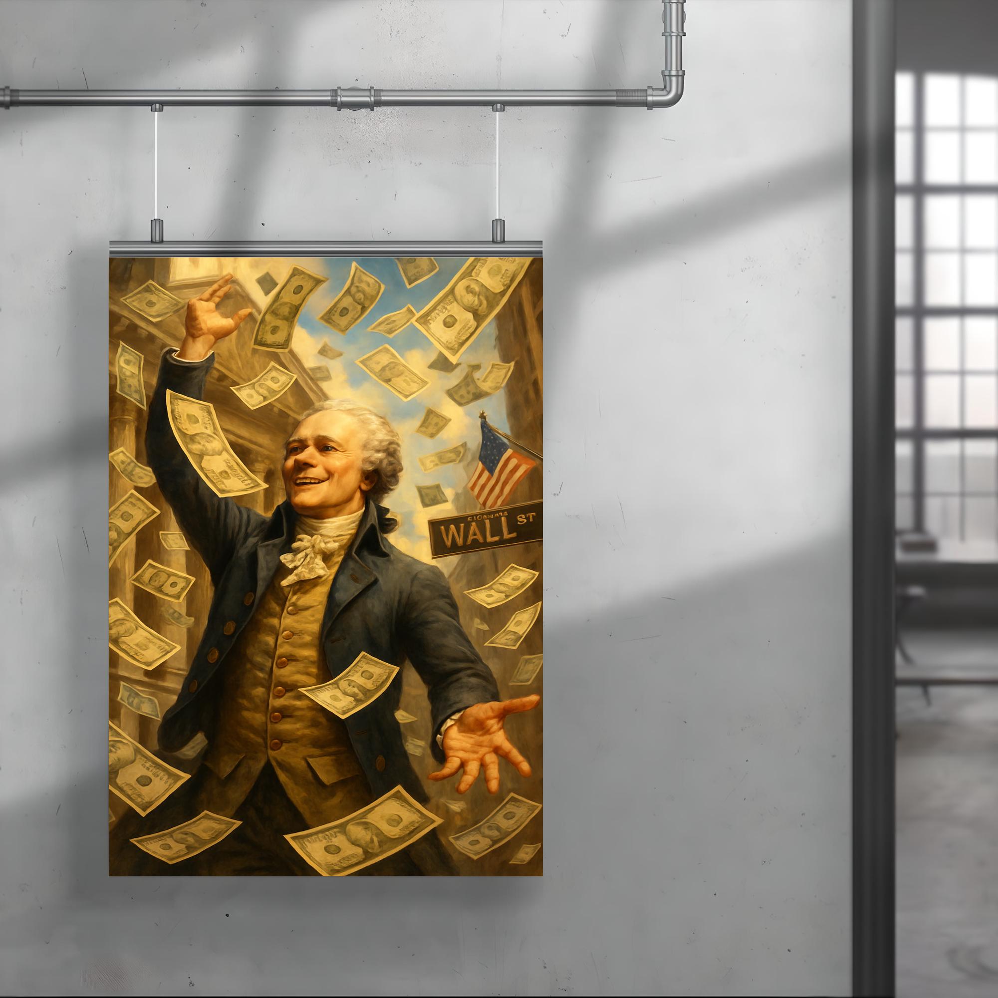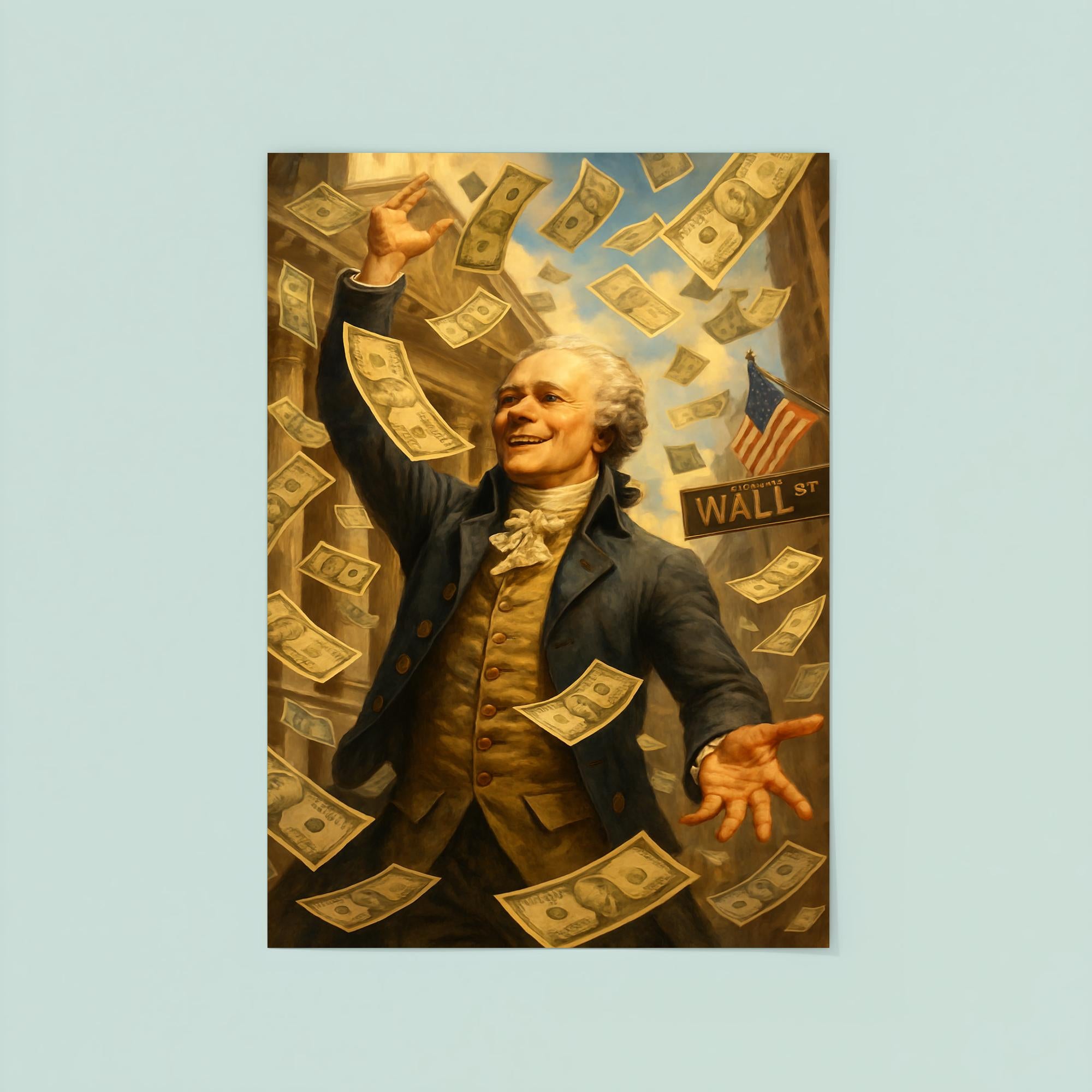 Bring energy and audacity to your space with this striking poster of Alexander Hamilton tossing paper money like confetti on Wall Street. This bold artwork captures the spirit of finance and ambition, making it a perfect statement piece for any office, study, or living room. Celebrate the thrill of the marketplace and the hustle of America's founding finance mastermind with a design that commands attention and inspires drive.