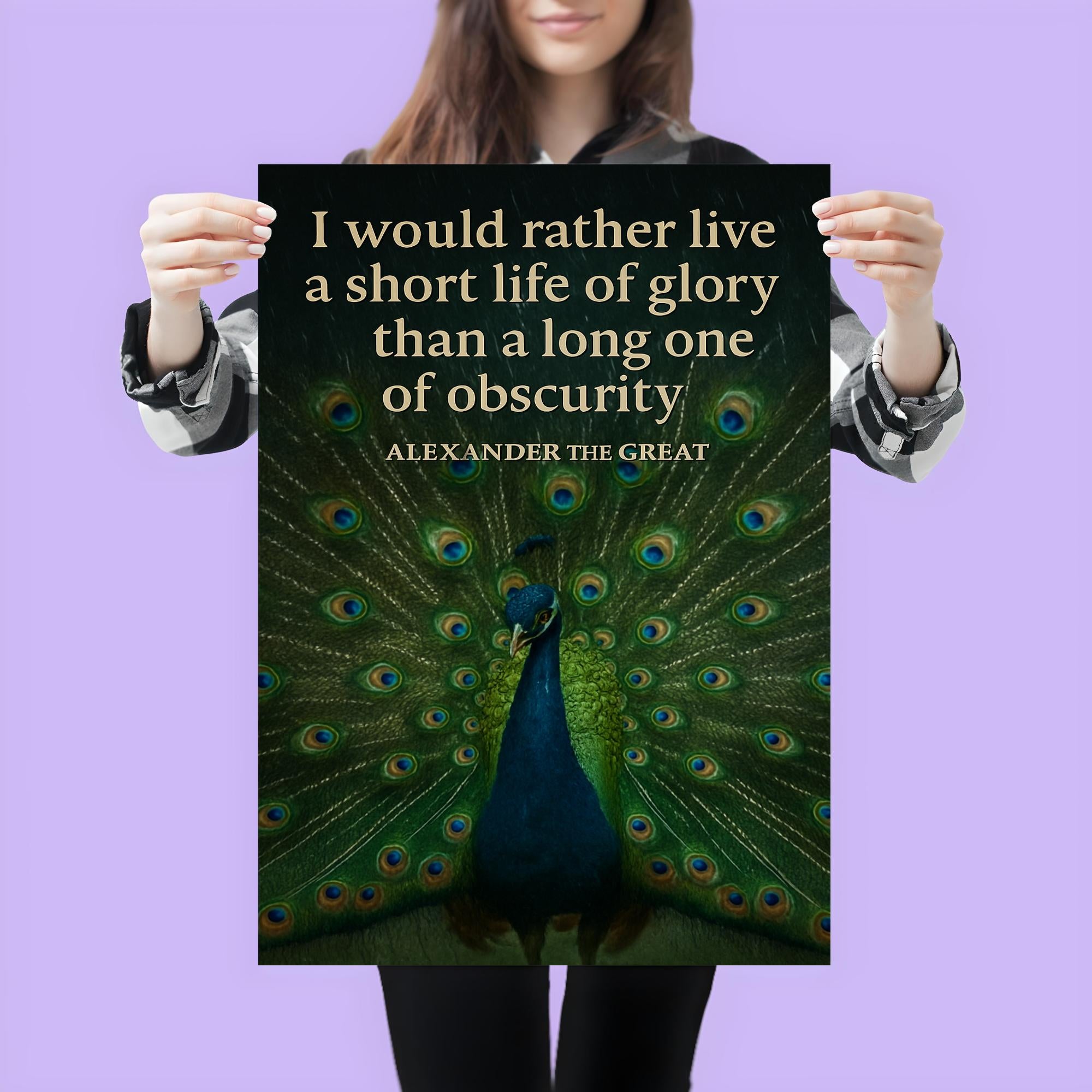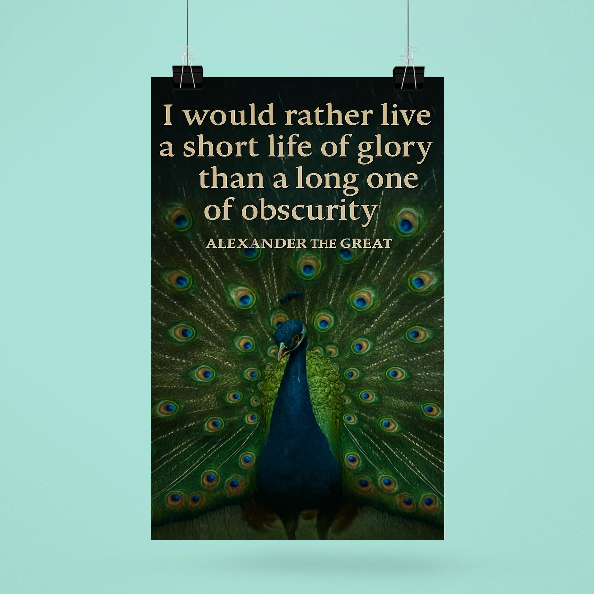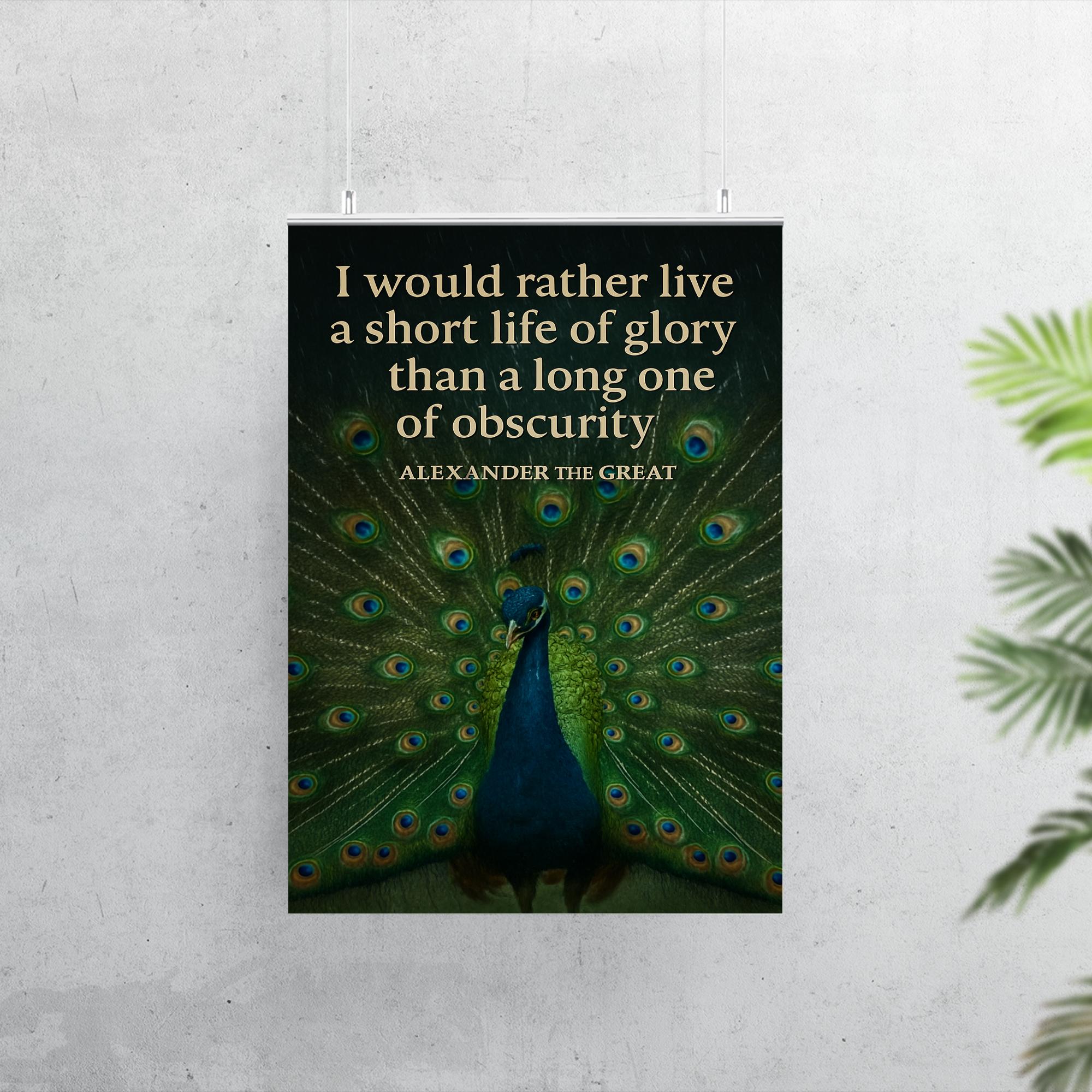 Celebrate the timeless spirit of ambition with this striking poster featuring Alexander the Great’s powerful "short life of glory" quote alongside a majestic peacock. It’s a bold tribute to living boldly and leaving a legacy that shines brilliantly, inspiring every room with courage and greatness.