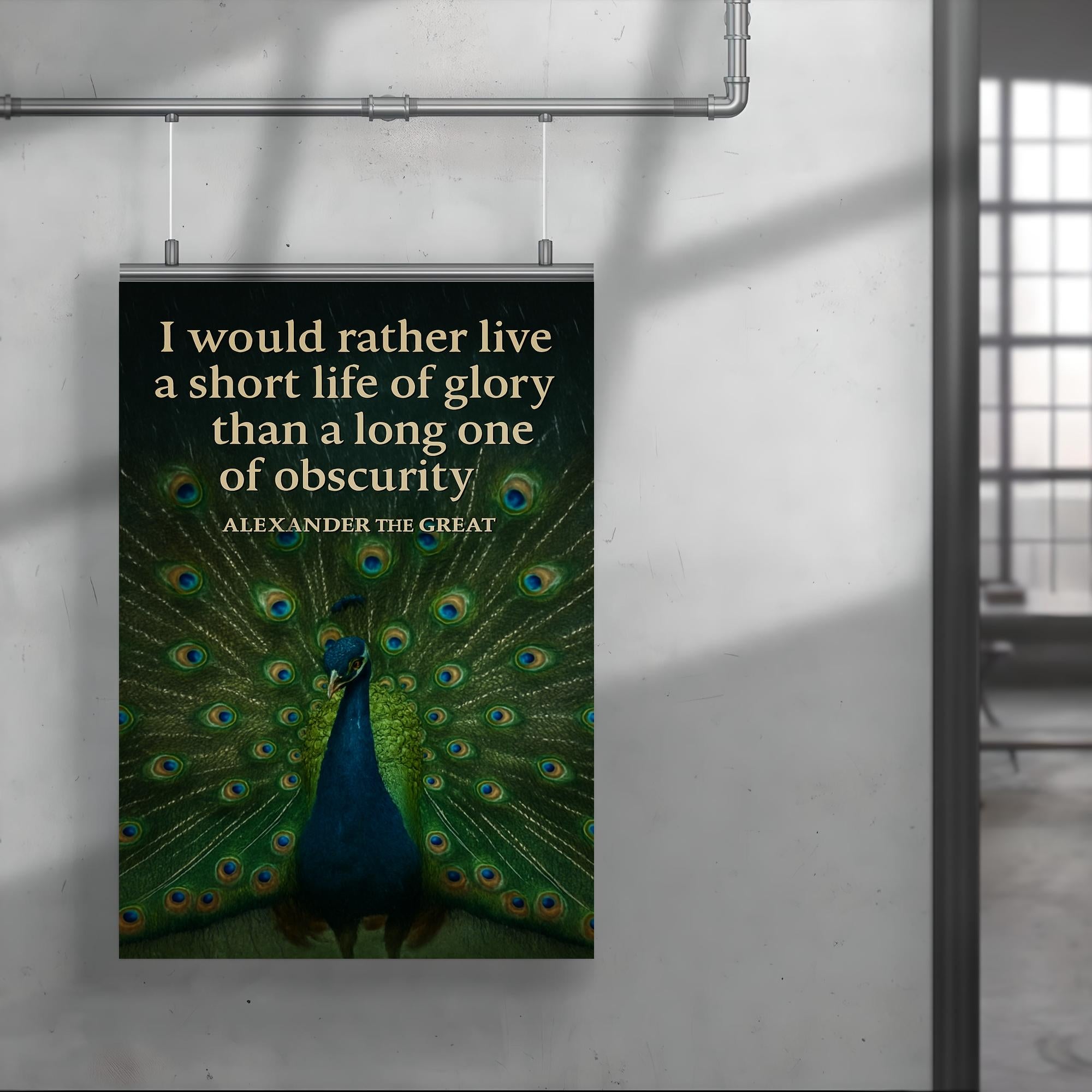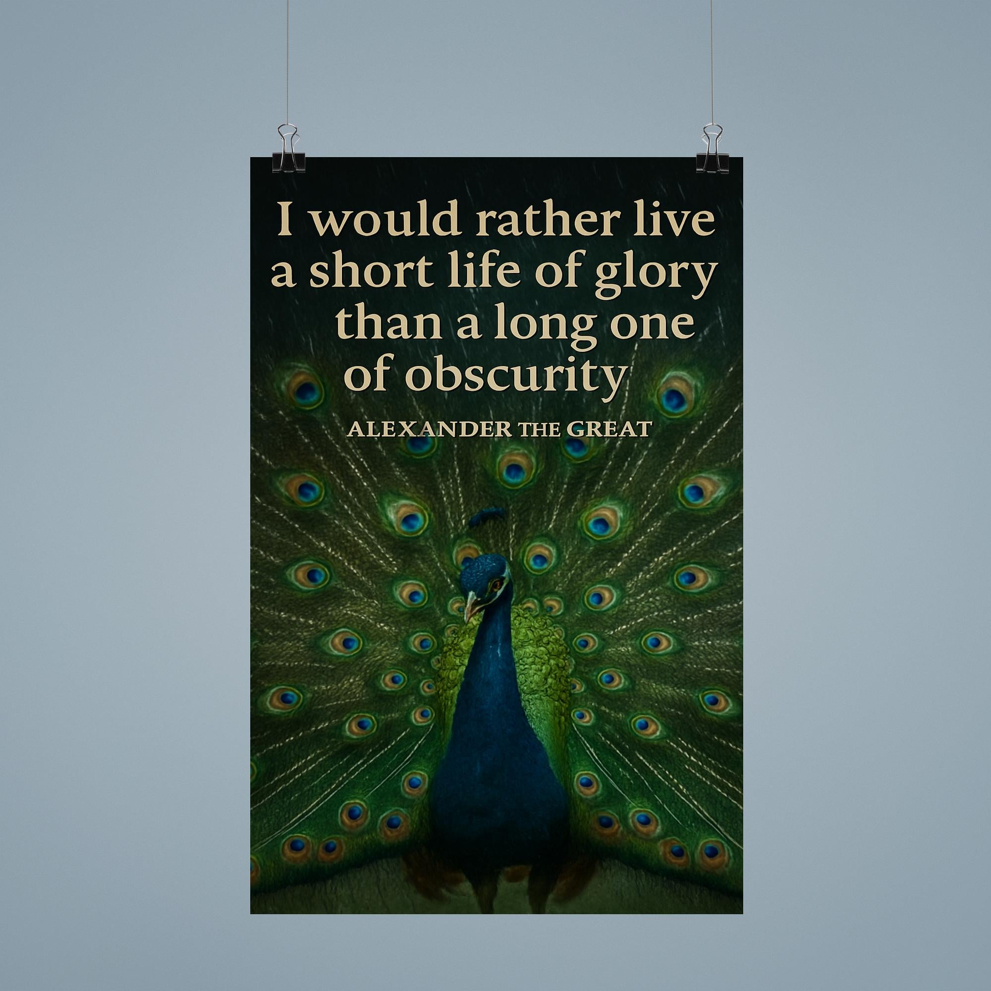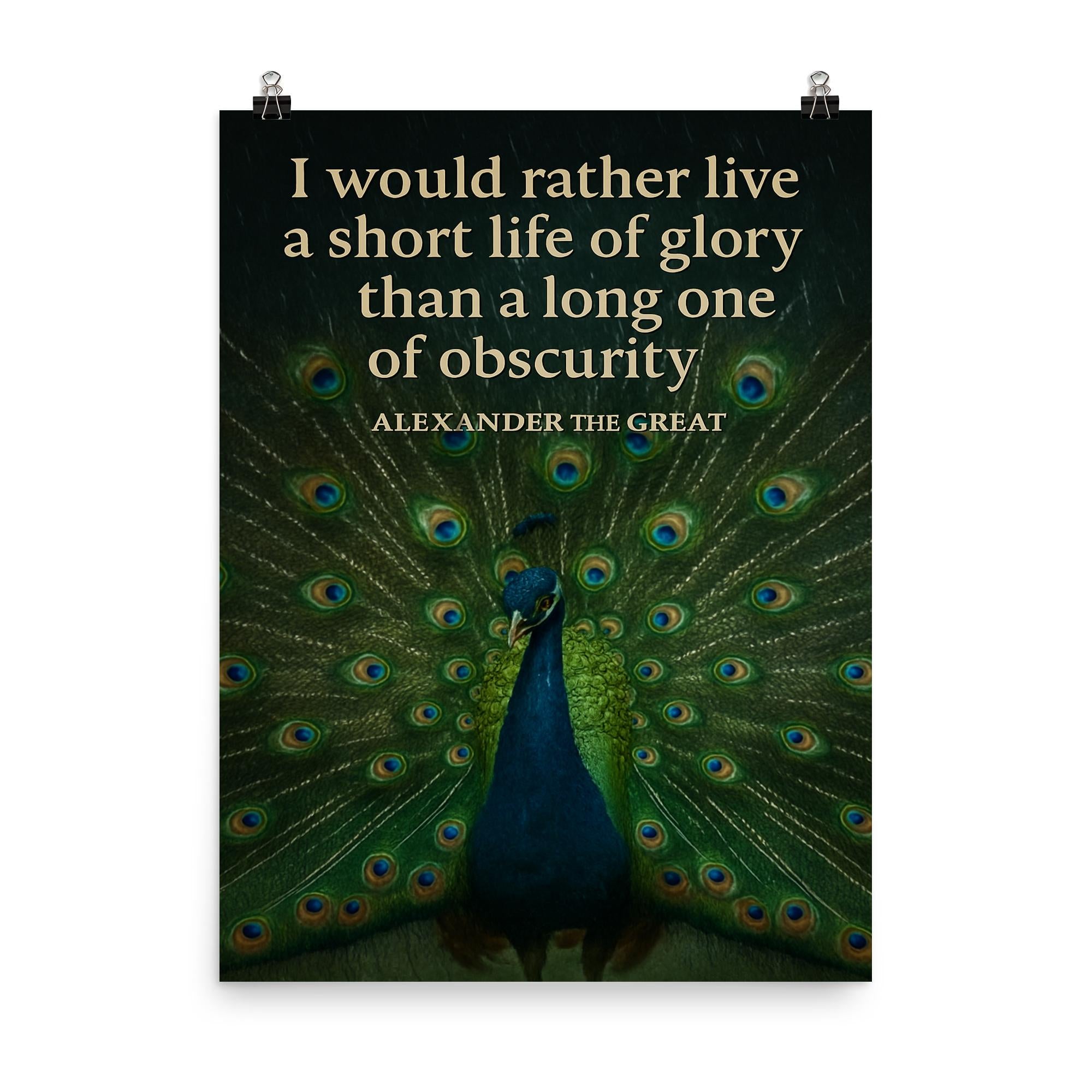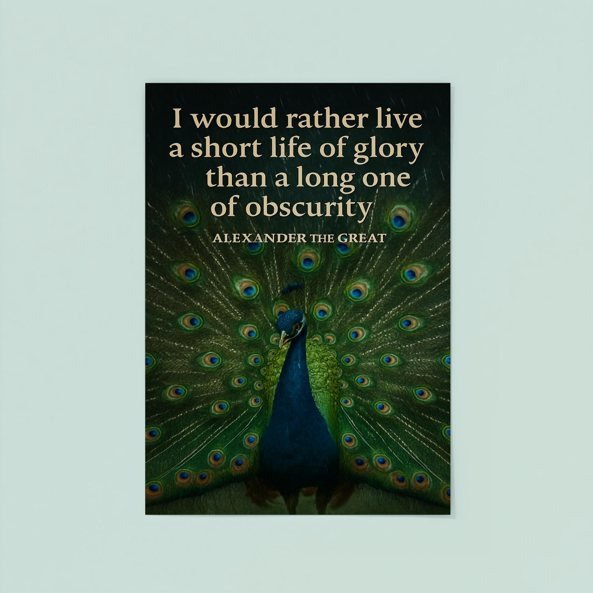 Celebrate the timeless spirit of ambition with this striking poster featuring Alexander the Great’s powerful "short life of glory" quote alongside a majestic peacock. It’s a bold tribute to living boldly and leaving a legacy that shines brilliantly, inspiring every room with courage and greatness.