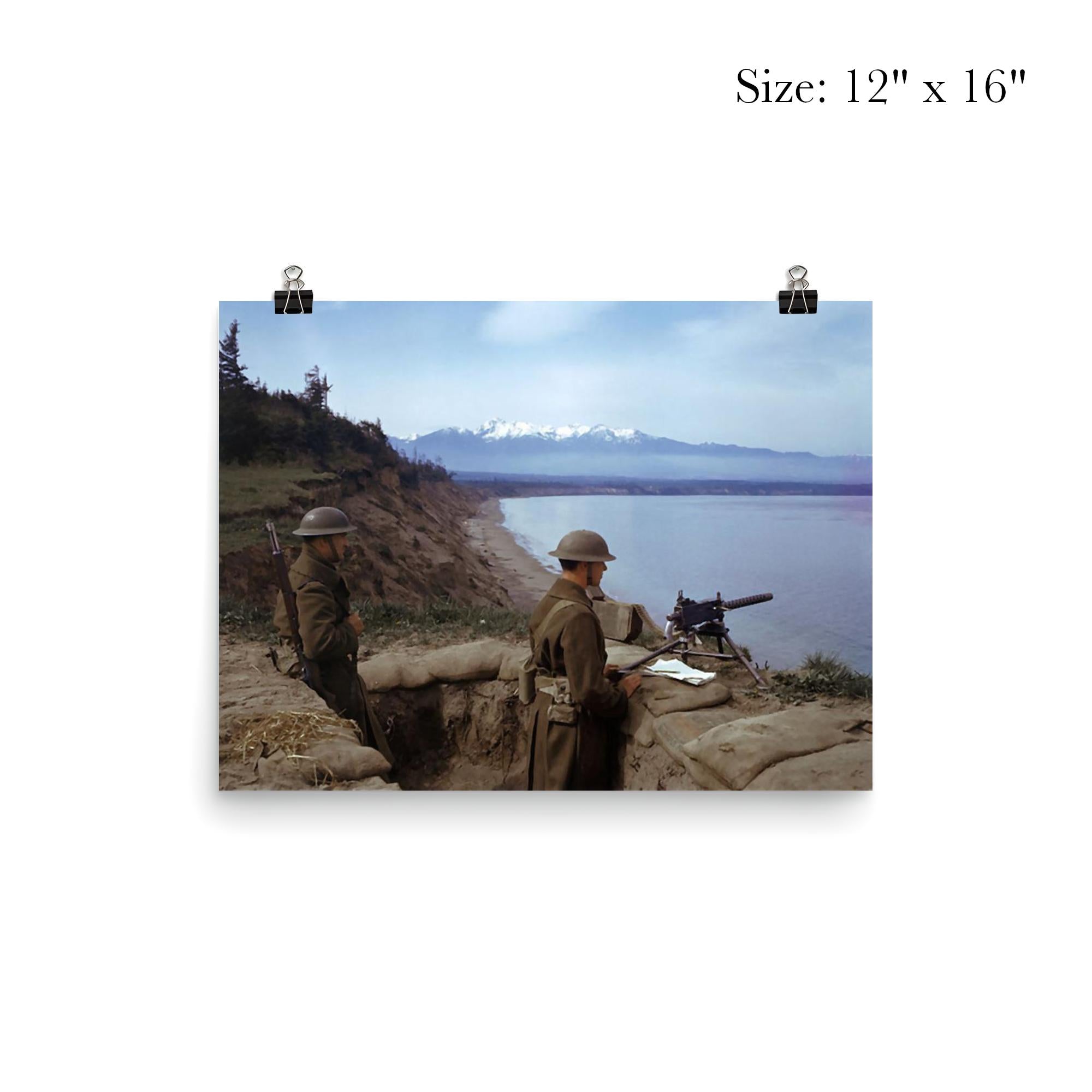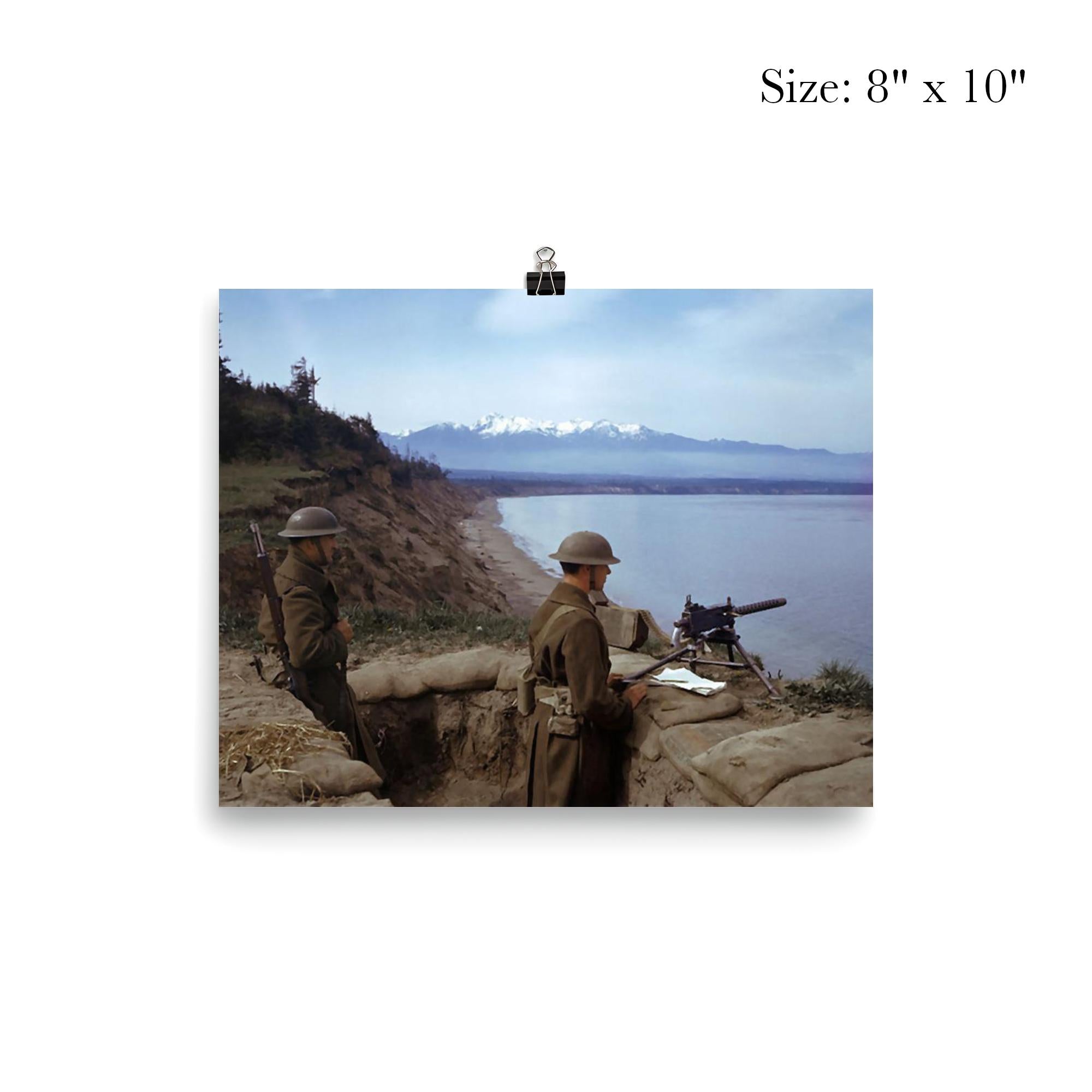 Step back to a pivotal moment in history with this striking poster capturing American soldiers vigilantly guarding the Oregon coast in 1942. Featuring the steadfast M1919 machine gun positioned from a trench in Astoria, this image embodies courage and resilience on the home front during World War II. Perfect for history enthusiasts and collectors, it’s a powerful reminder of the bravery that stood watch over the nation’s shores.