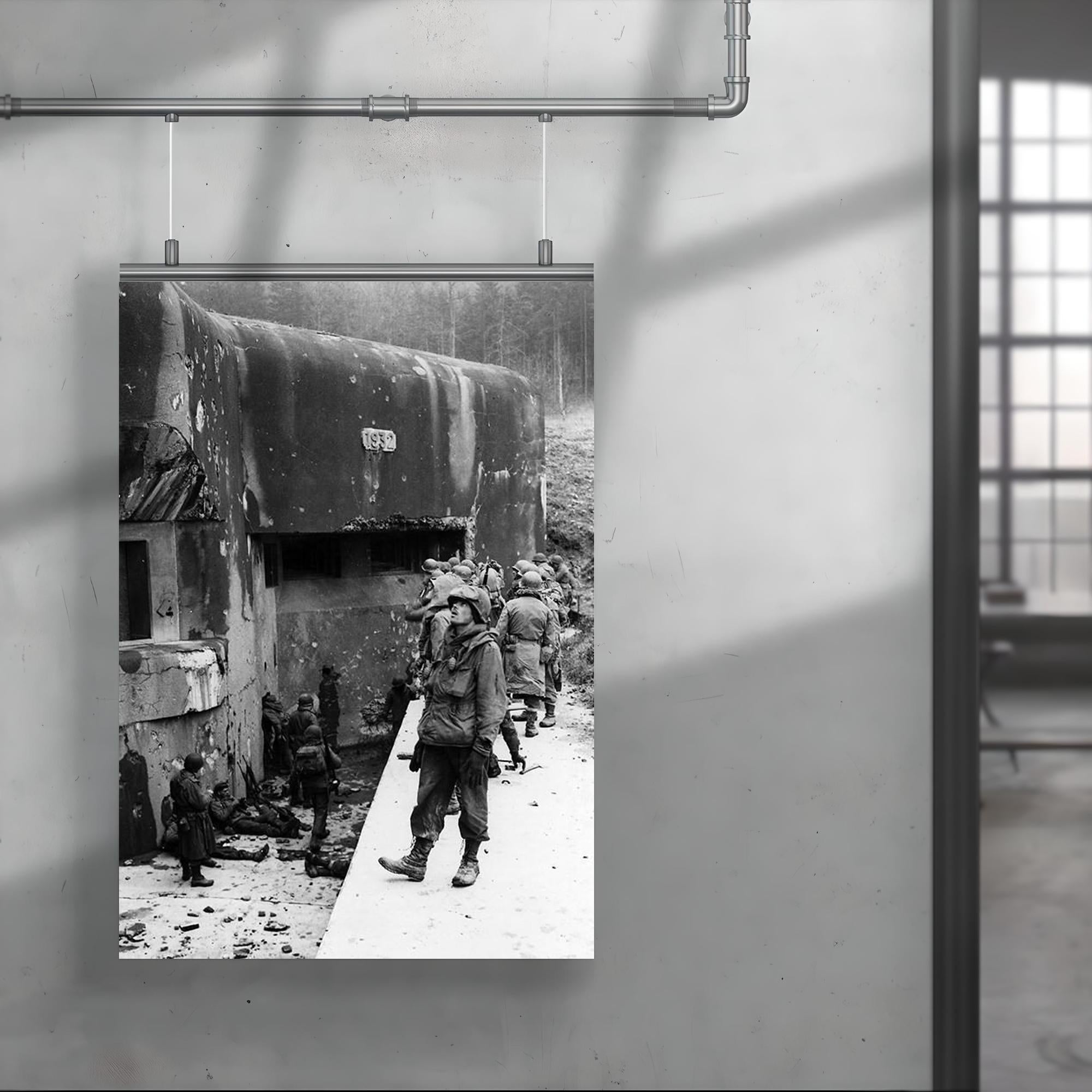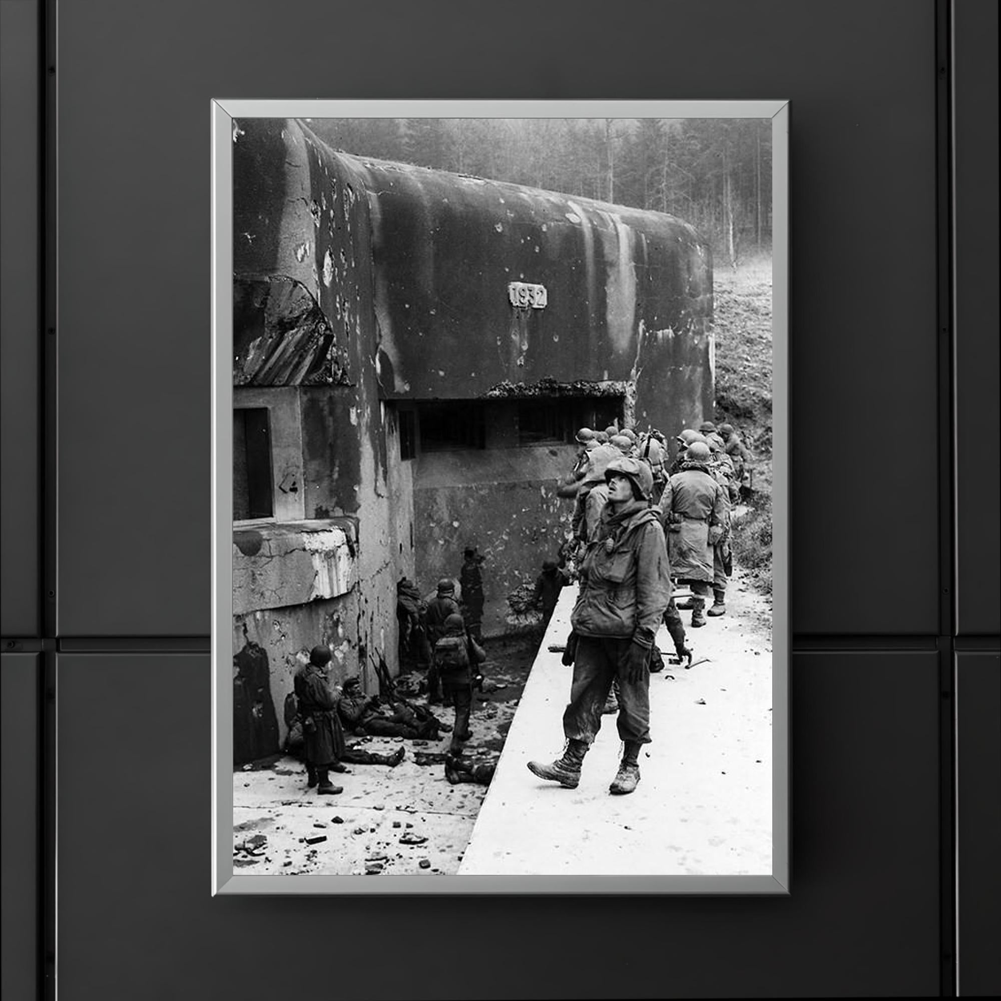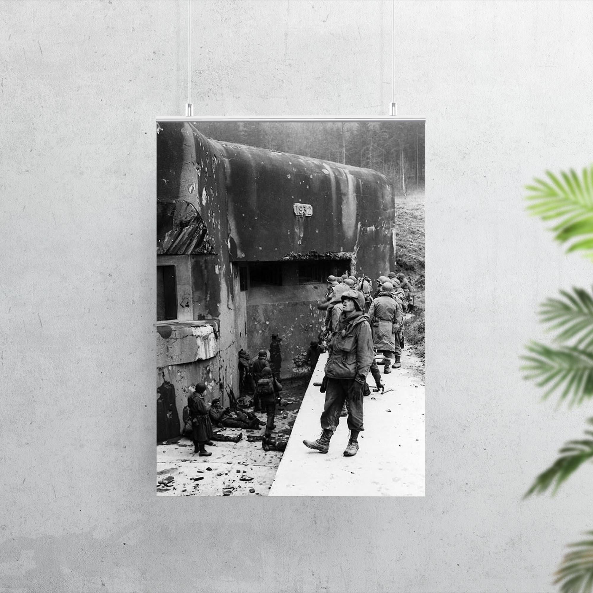 Capture a powerful slice of history with this striking poster depicting American soldiers inspecting the Maginot Line in early 1945. This image offers a rare glimpse into a pivotal moment as Allied forces advanced through Europe, blending military resolve with historic significance. Perfect for history enthusiasts and collectors, it brings the intensity and gravity of World War II right to your wall.