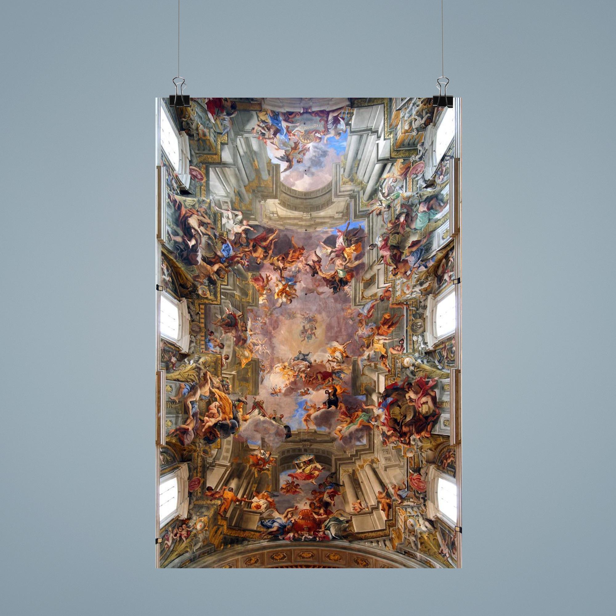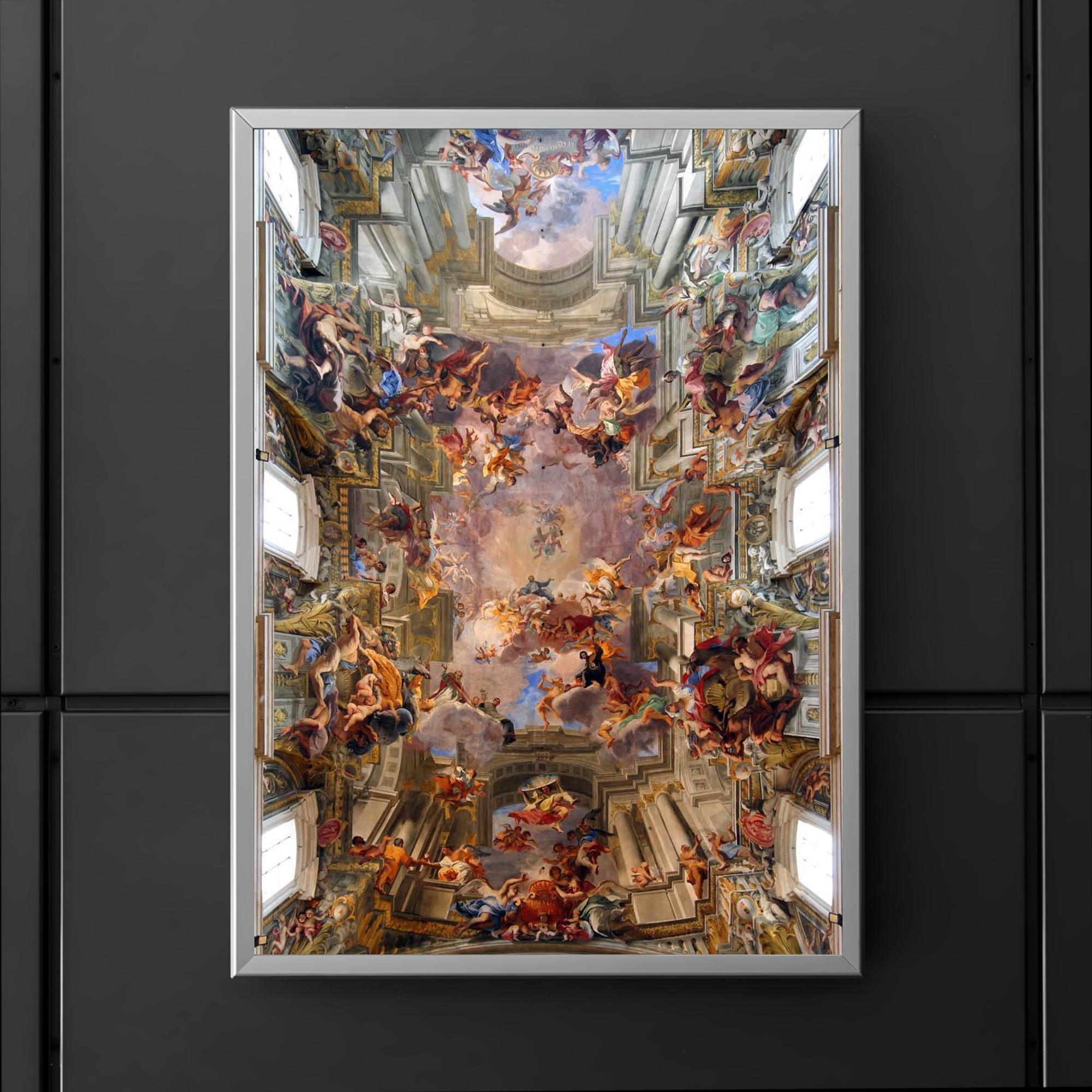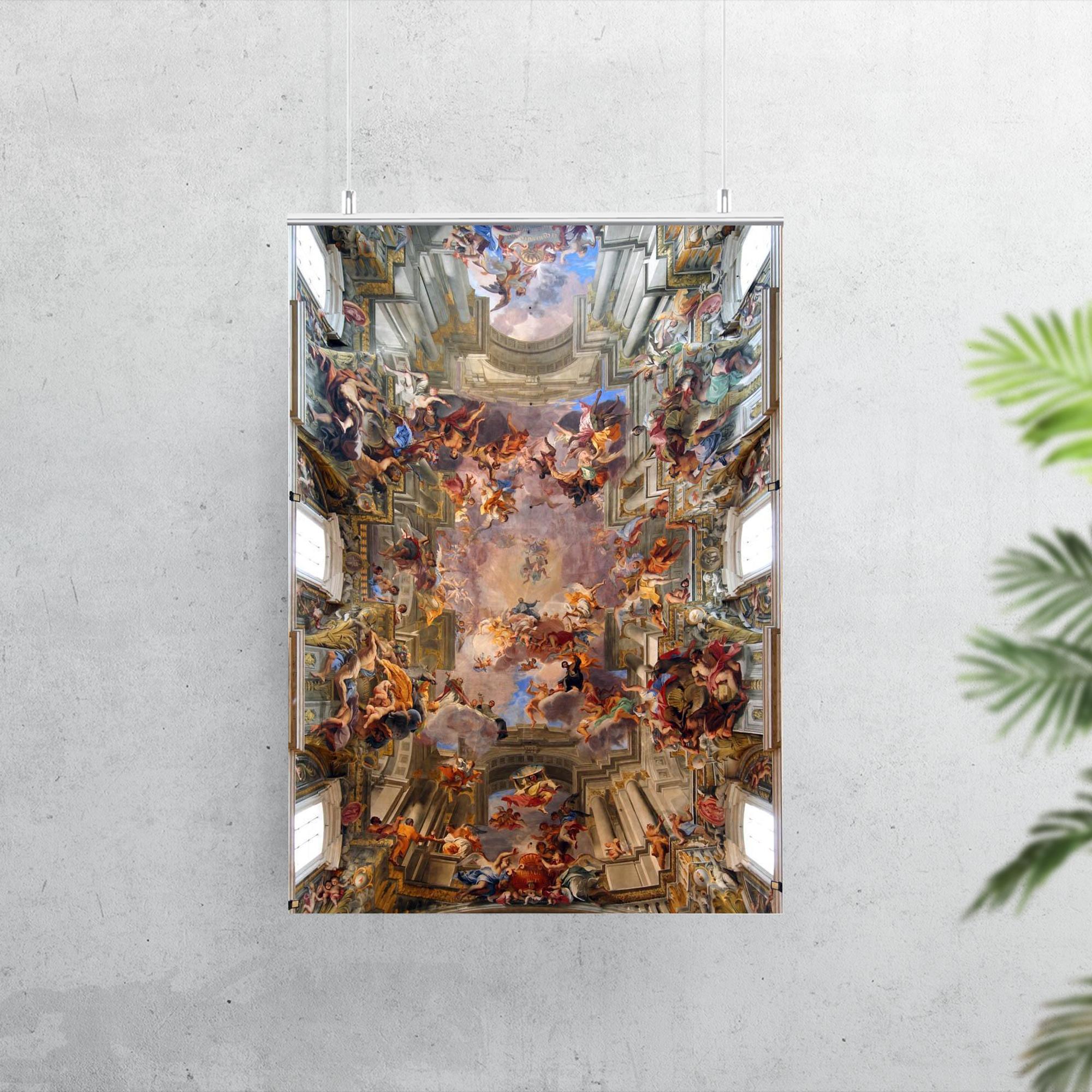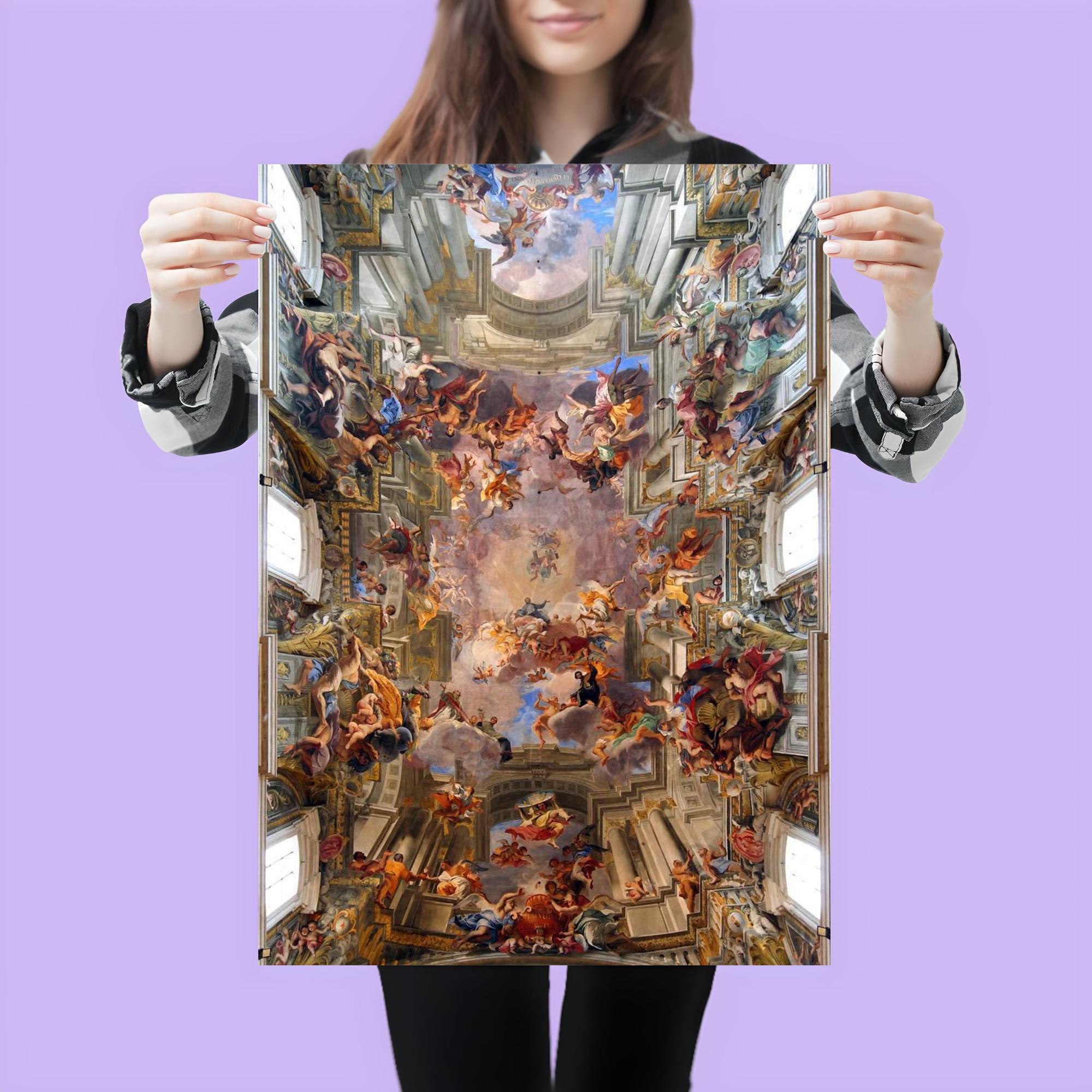 Elevate your space with the timeless grandeur of Andrea Pozzo’s *Apotheosis of S. Ignatius*, a stunning poster capturing the essence of this 300-year-old fresco. Experience the masterful Baroque illusionism and sacred beauty that has inspired awe for centuries, now artfully reproduced to bring history and divine artistry into your home.