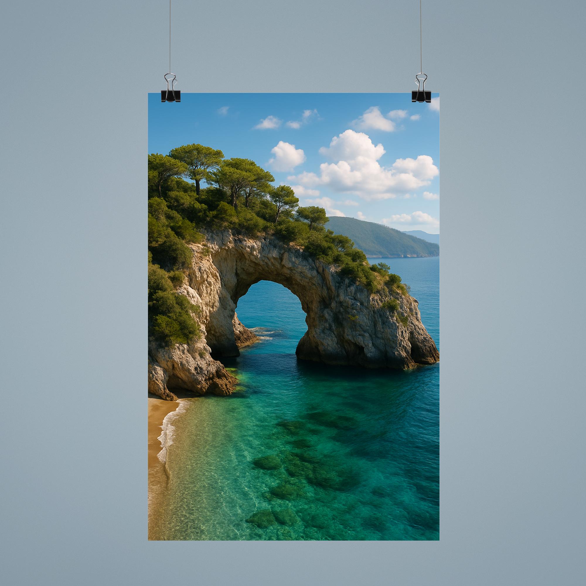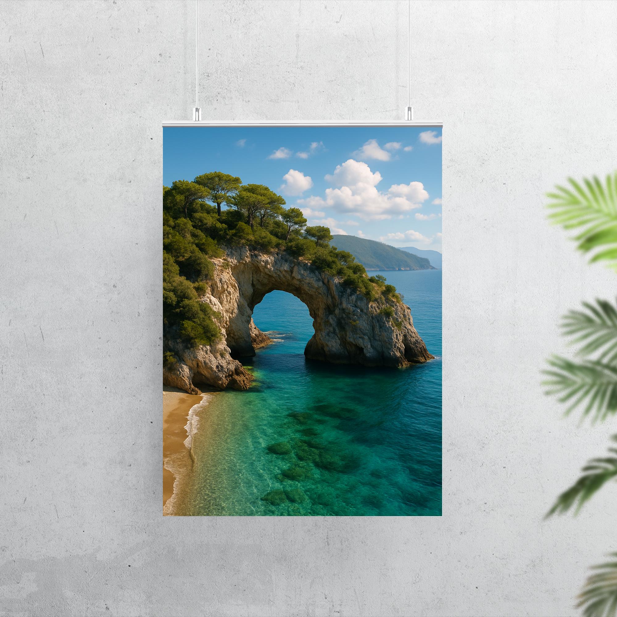 Bring the breathtaking beauty of Italy’s Cilento coast into your space with this stunning poster of Arco Naturale di Palinuro. Showcasing the natural limestone arch that gracefully meets the sparkling Mediterranean waters, this artwork captures a serene moment of timeless coastal wonder. Perfect for those who cherish nature’s artistry and the magic of the Italian seascape.