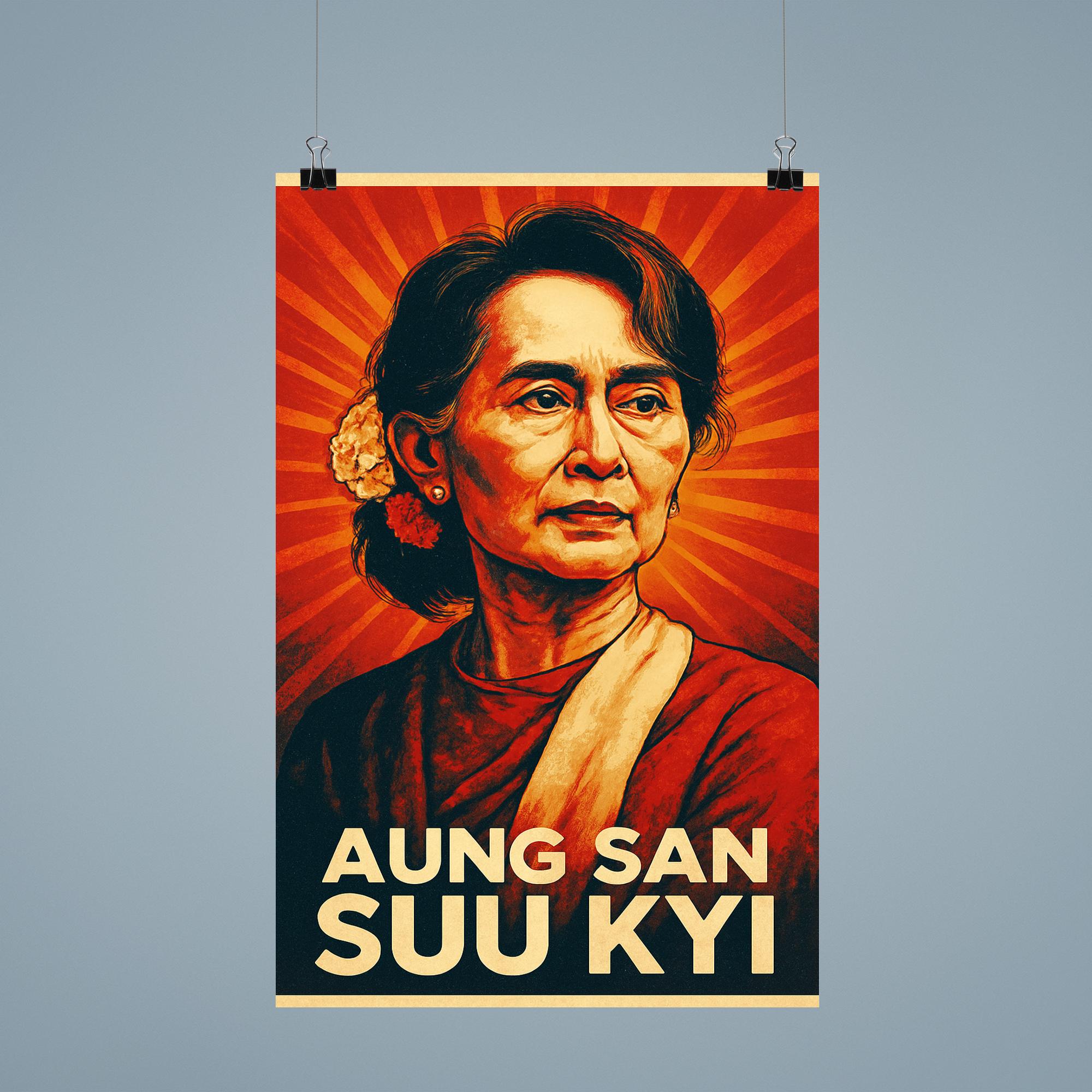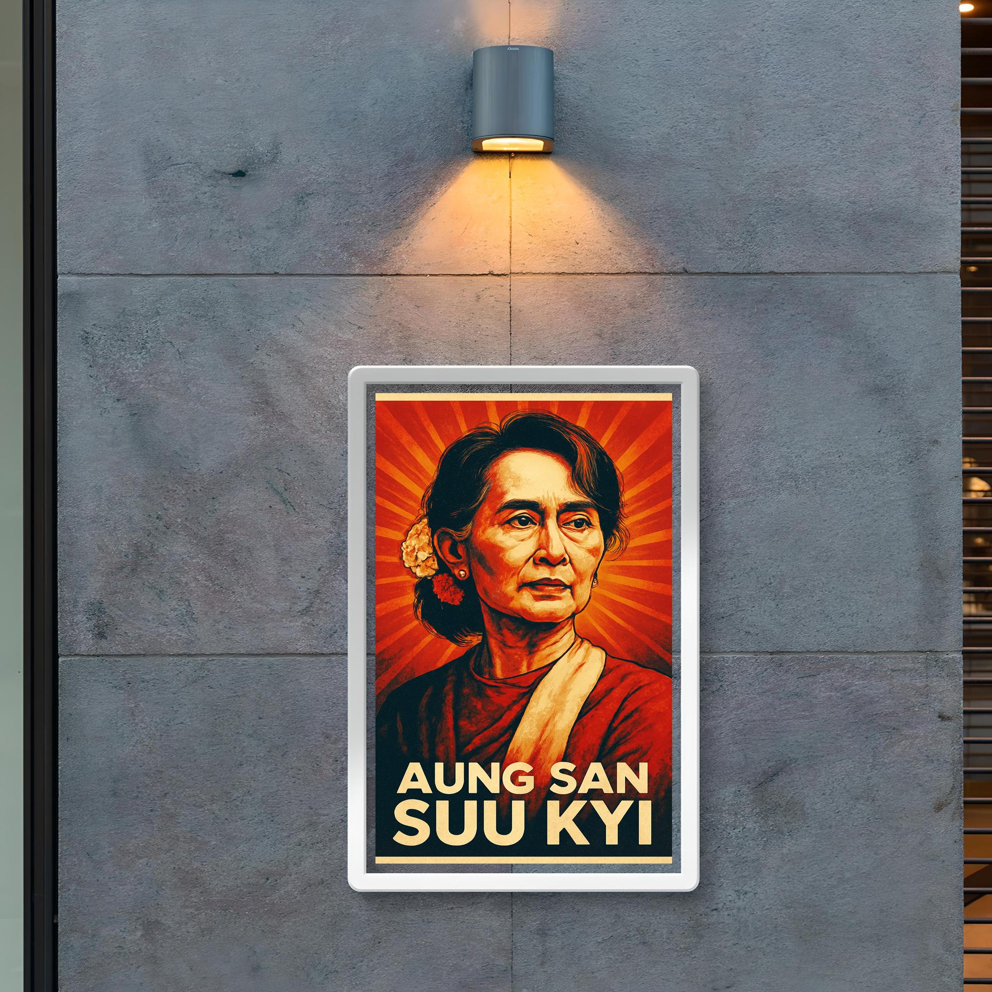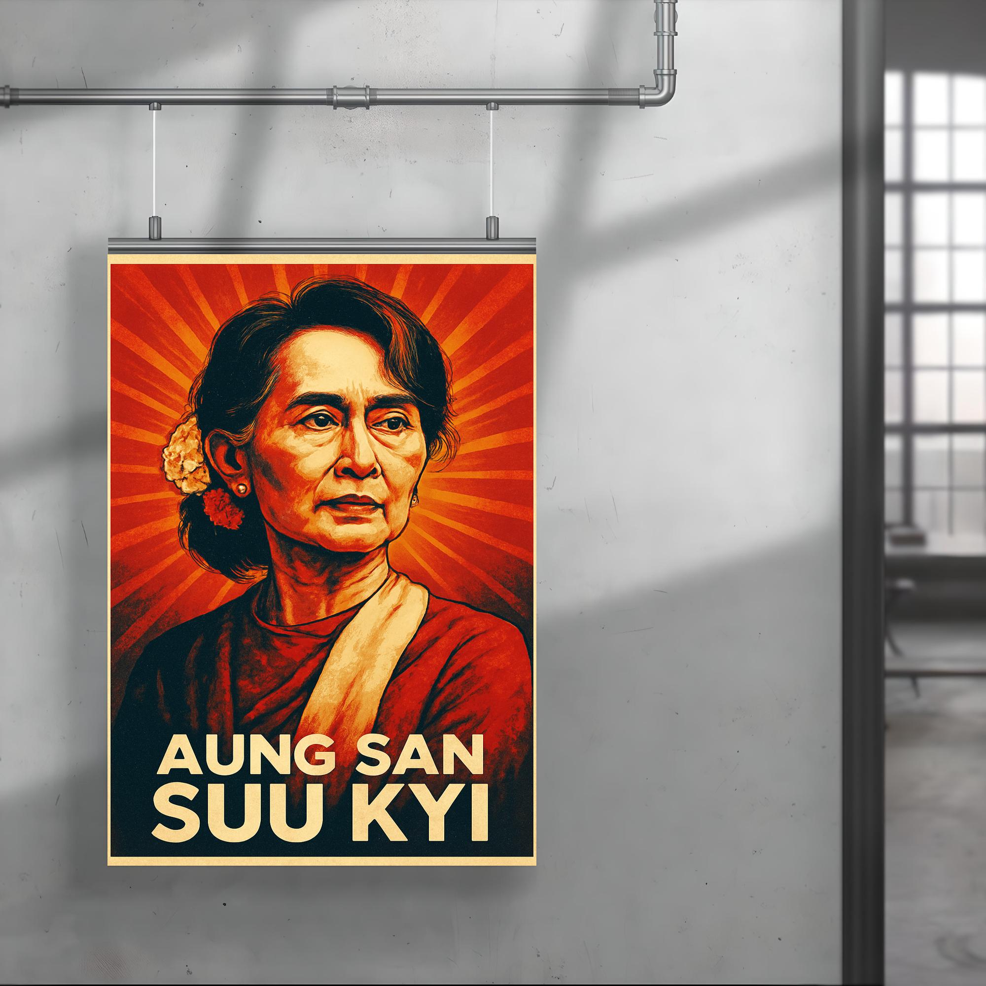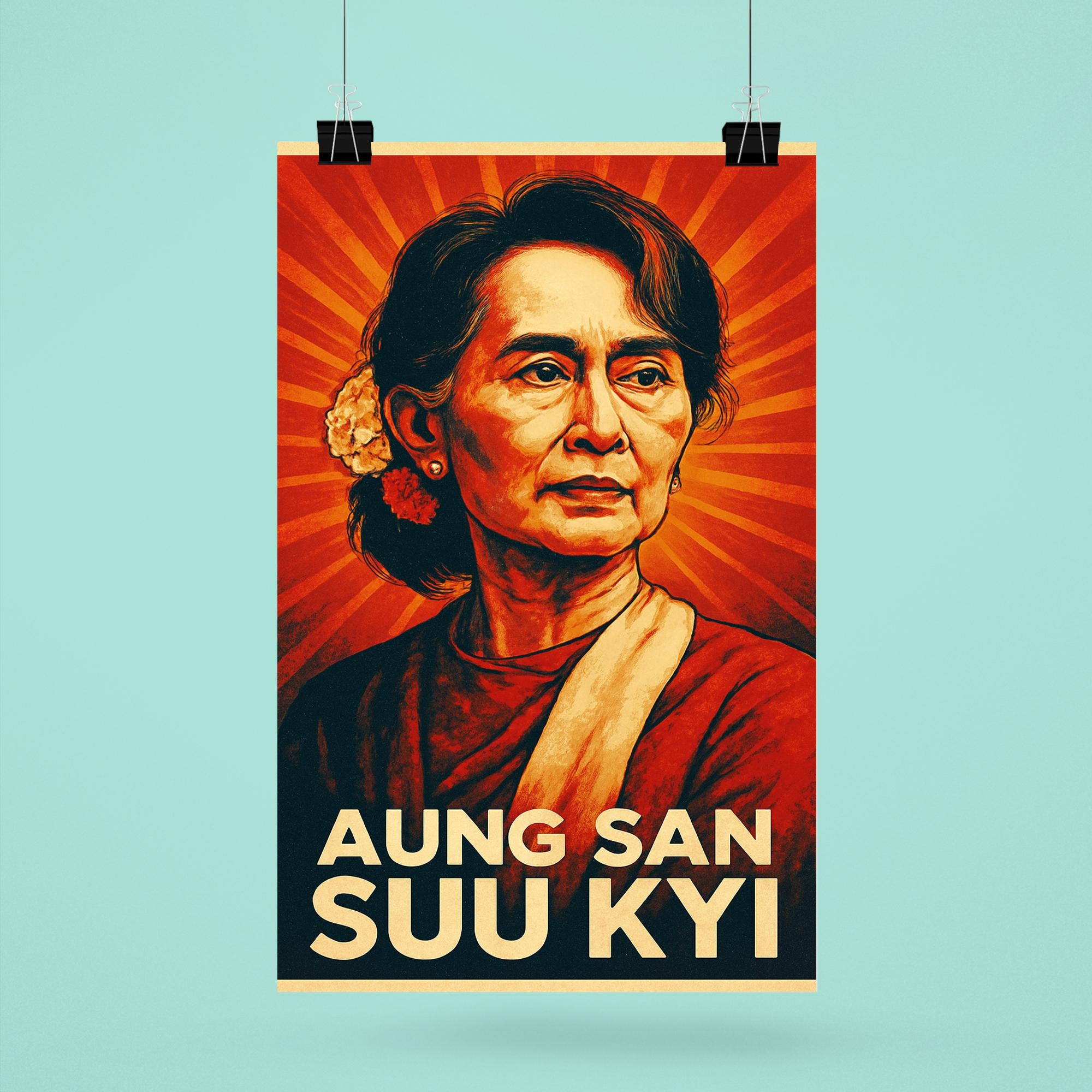 Celebrate the enduring spirit of resilience and hope with this striking poster of Aung San Suu Kyi. A powerful symbol of courage and dedication to democracy, this poster makes an inspiring addition to any space, reminding us all of the strength it takes to stand for what is right. Perfect for those who admire leadership and the pursuit of freedom.