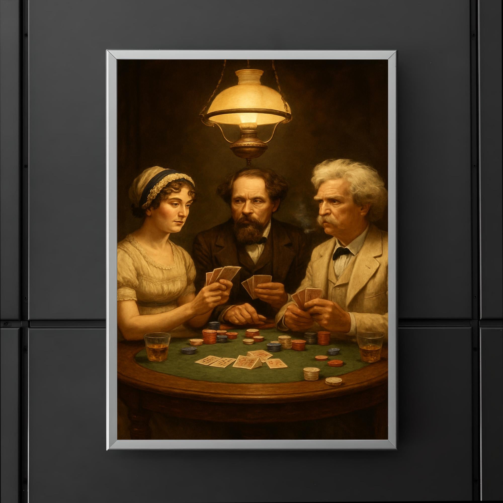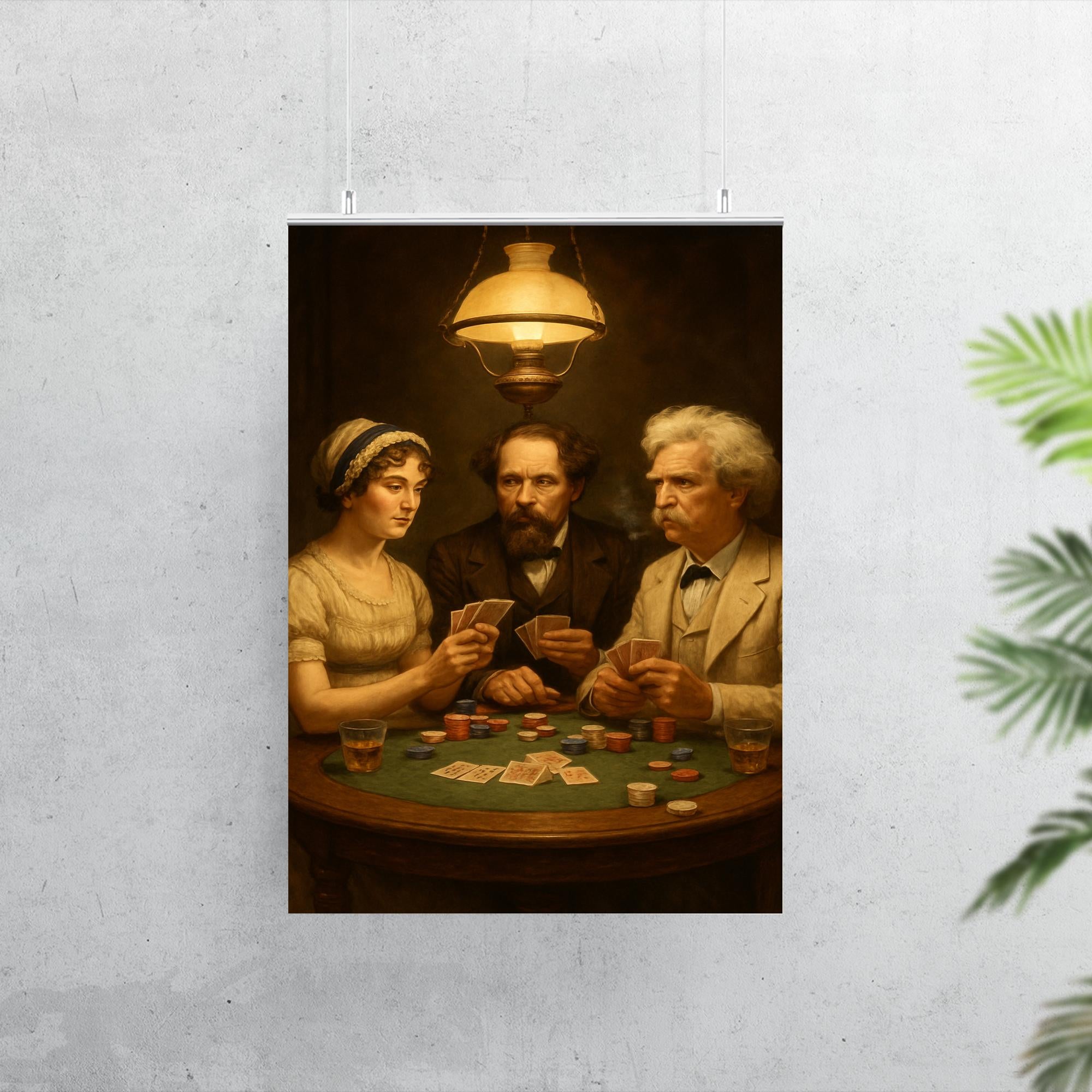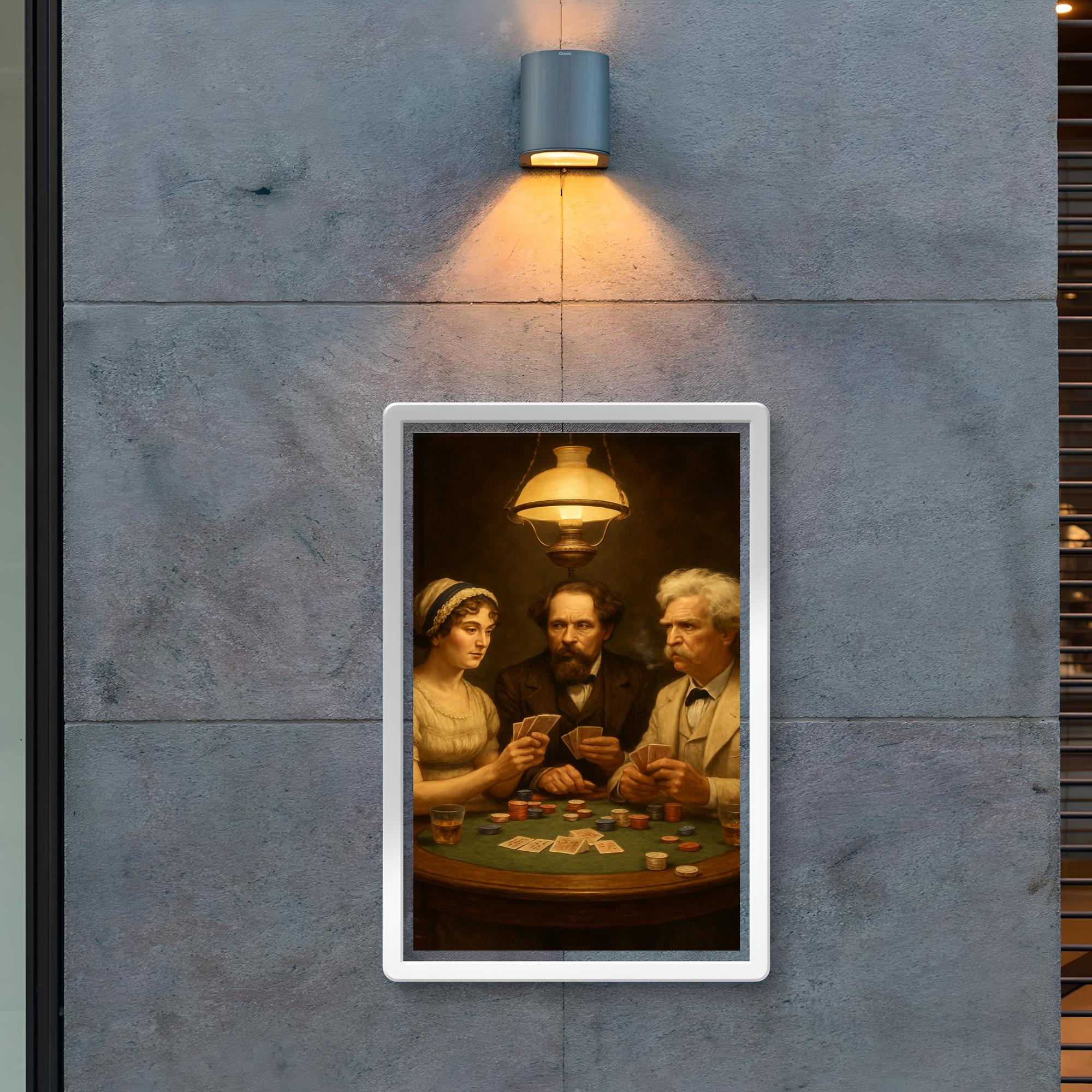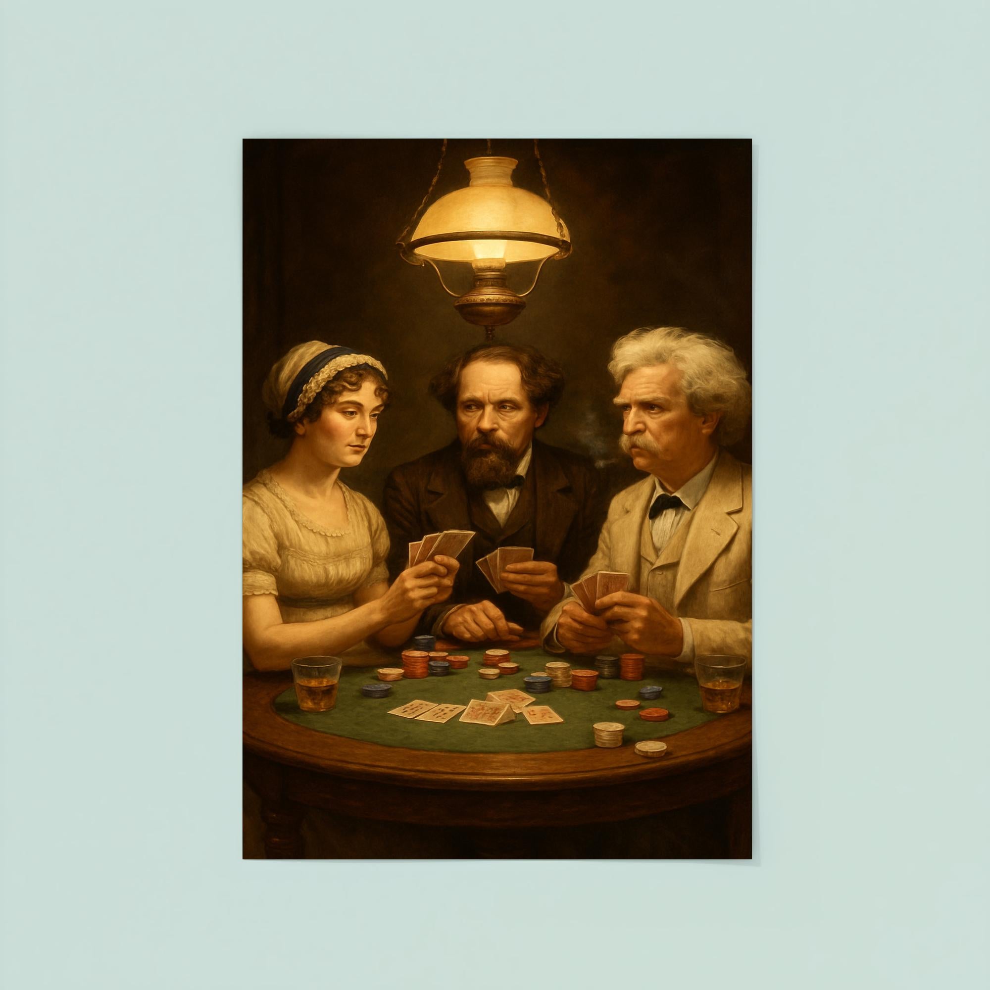 Step into a timeless gathering where literary legends converge in a game of wits and chance. This striking poster captures Austen, Dickens, and Twain seated around a poker table, inviting you to imagine the stories and strategies unfolding beyond the cards. A perfect conversation starter and a tribute to the masters of storytelling, it’s an inspiring addition to any space that celebrates creativity and classic literature.