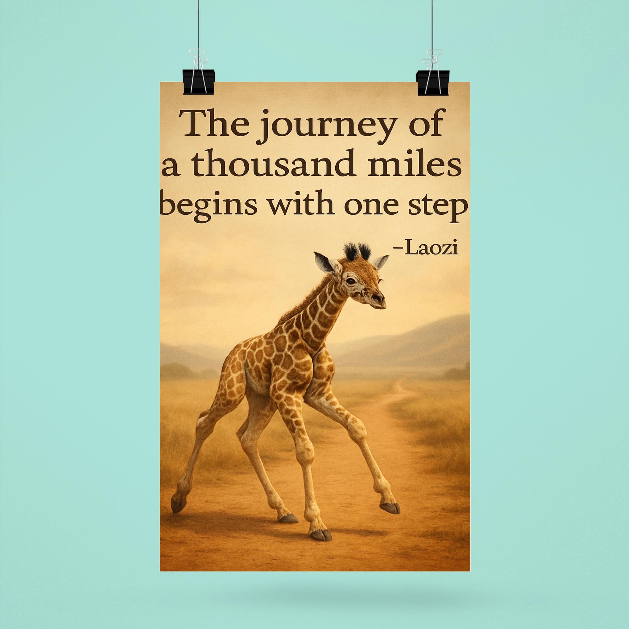 Celebrate every small beginning with this inspiring poster featuring the powerful Laozi quote, "The journey of a thousand miles begins with a single step." Emblazoned alongside a heartwarming image of a baby giraffe taking its first steps, this piece beautifully captures the courage and hope found in every new adventure. Perfect for inspiring determination and reminding us that every great journey starts with a brave first move.