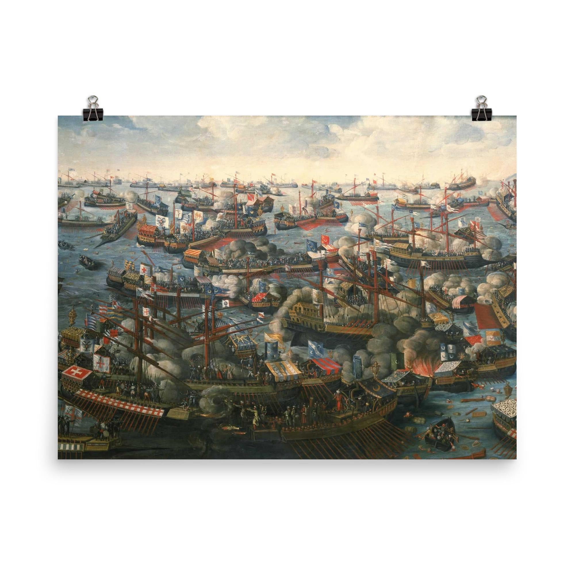 Immerse yourself in a pivotal moment of history with this striking poster of the Battle of Lepanto by HLetter, c. 1572. Capturing the fierce maritime clash that shaped the course of empires, this artwork brings centuries-old valor and strategy to life. Perfect for history enthusiasts and art lovers alike, it transforms any space into a tribute to courage and naval mastery.
