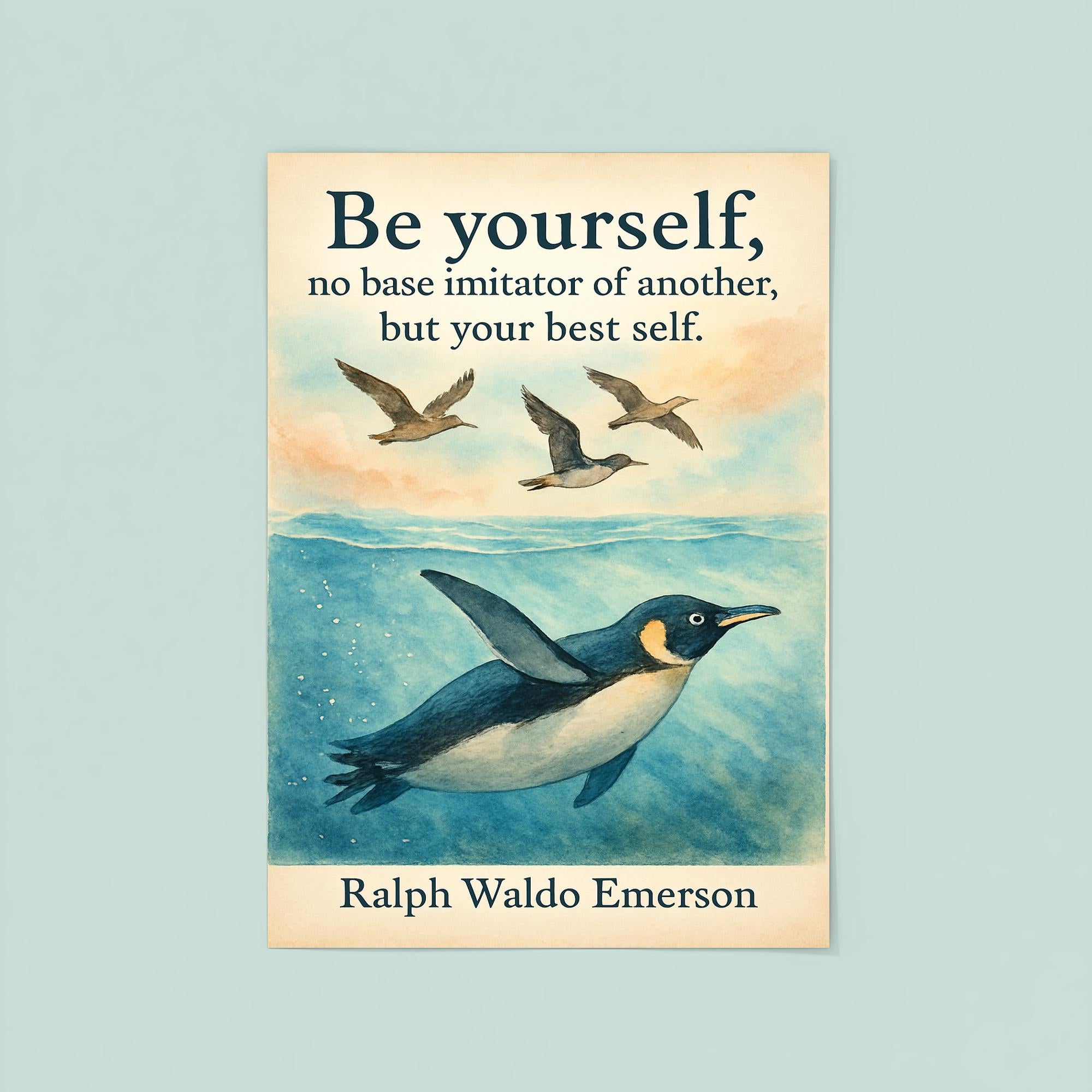 Inspire daily courage with this striking poster featuring Ralph Waldo Emerson’s timeless quote, "Be Yourself." Accompanied by a penguin embracing its unique path through swimming and striving to fly, this artwork celebrates individuality and fearless determination. Perfect for any space craving a motivational boost, it reminds you that true strength comes from staying authentic no matter the challenge.