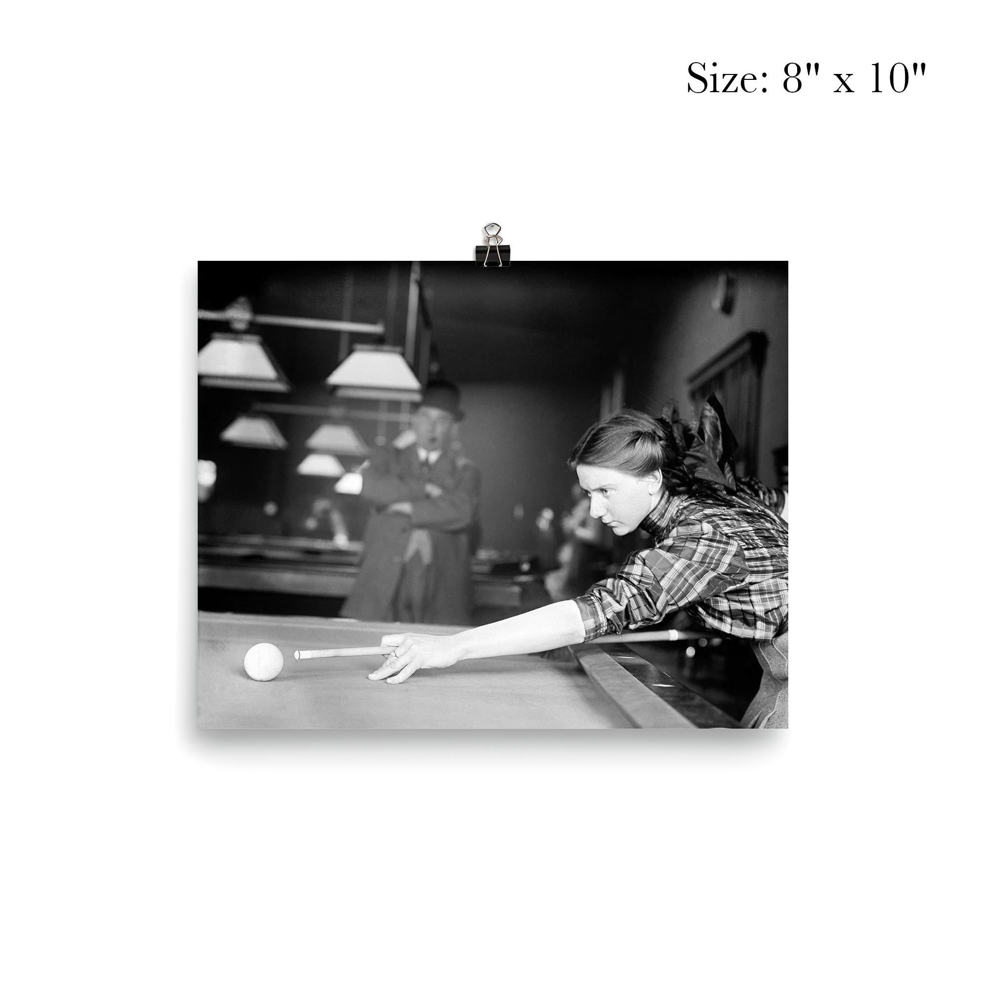 Step back in time with this striking 1910 poster featuring a female billiards champion poised to take her shot. Capturing a moment of focus and finesse, this vintage artwork celebrates the skill and grace of early women athletes in a classic sport. Perfect for enthusiasts of billiards history and timeless inspiration alike.