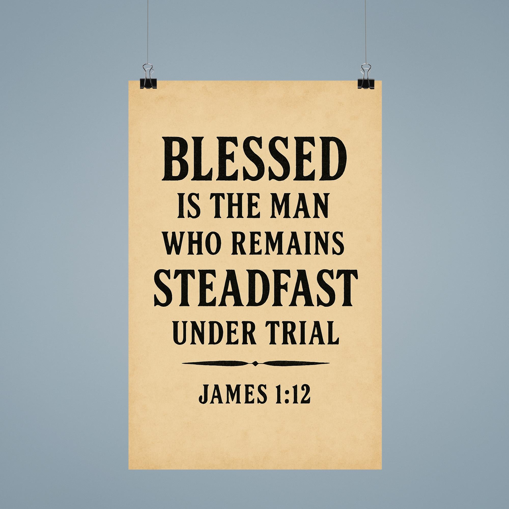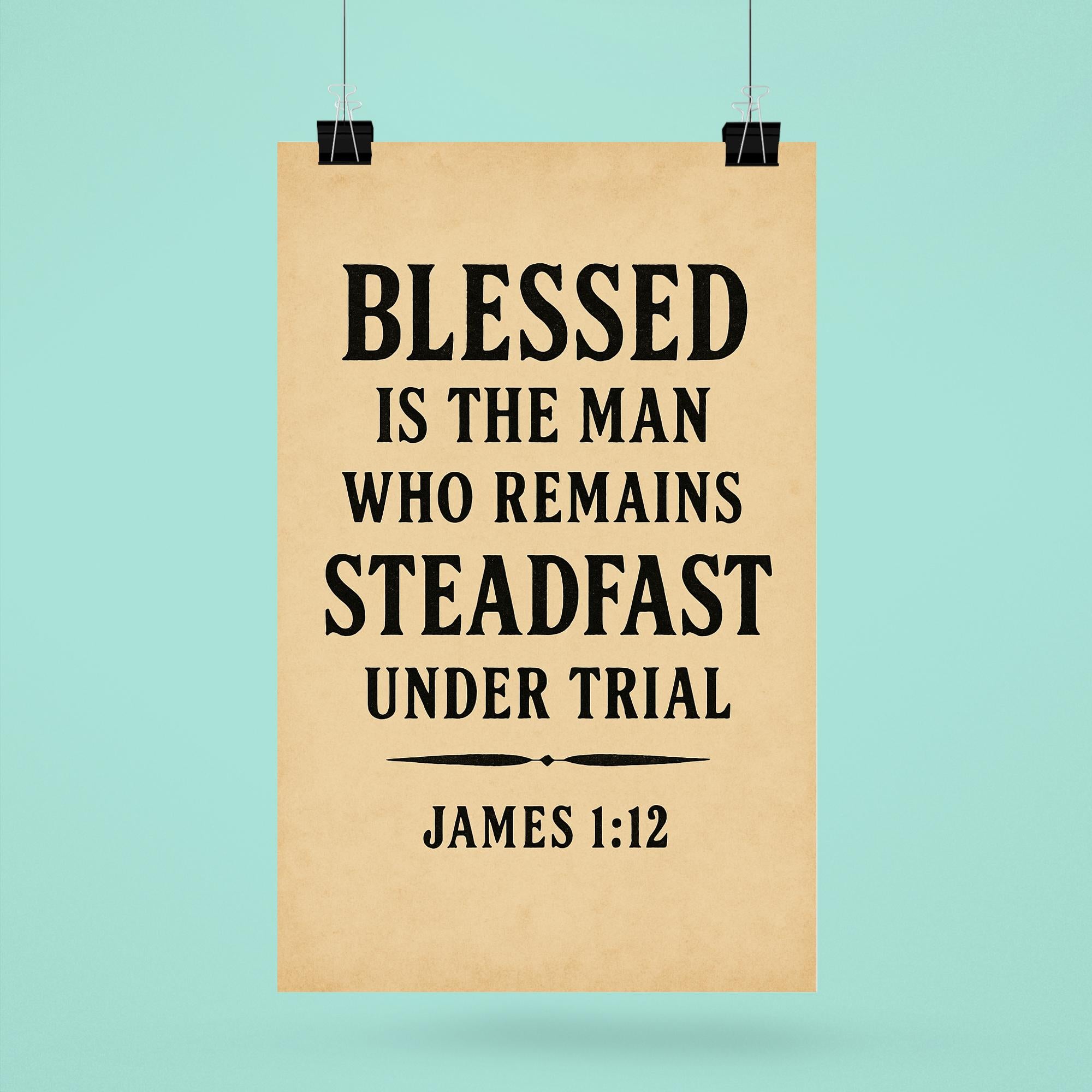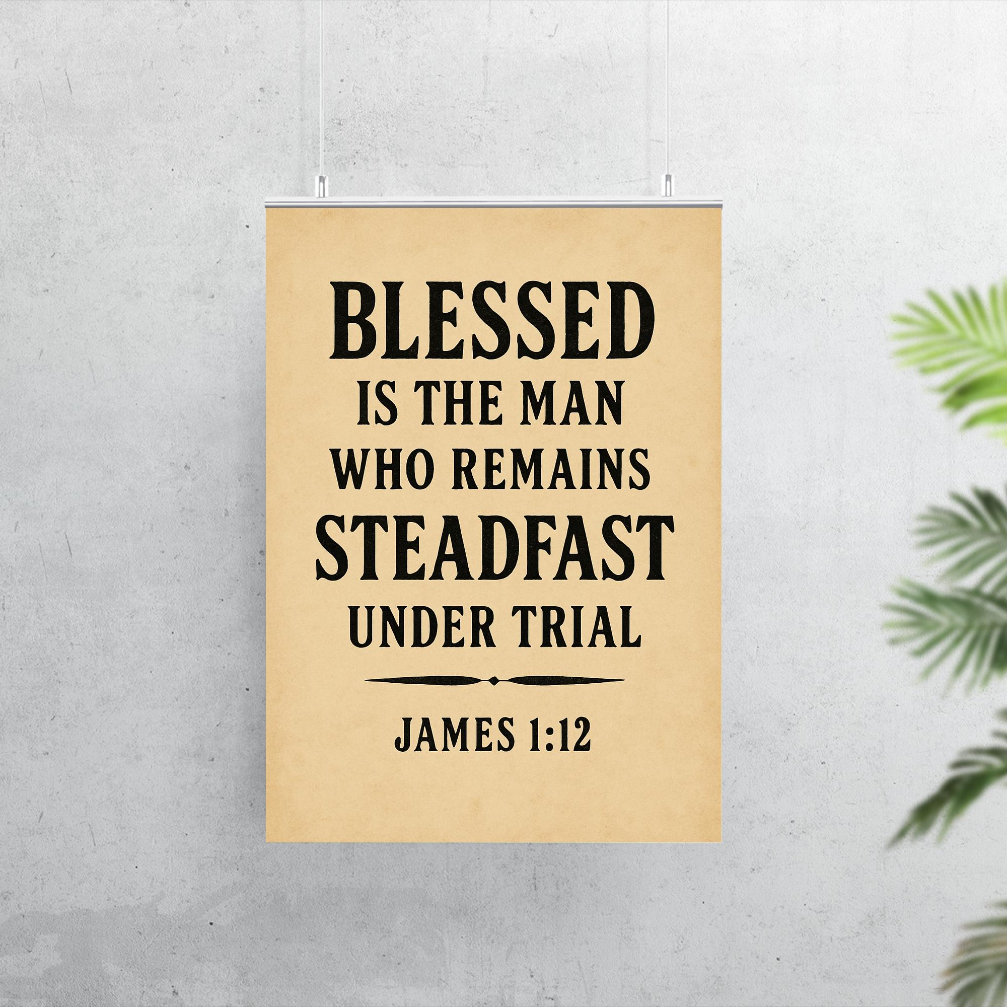 Inspire resilience and faith with this powerful reminder from James 1:12—"Blessed is the man who remains steadfast under trial." Perfect for any space where strength and perseverance are needed, this poster encourages you to stand firm through life’s challenges and embrace the blessings that follow. Let this timeless message uplift your spirit every day.