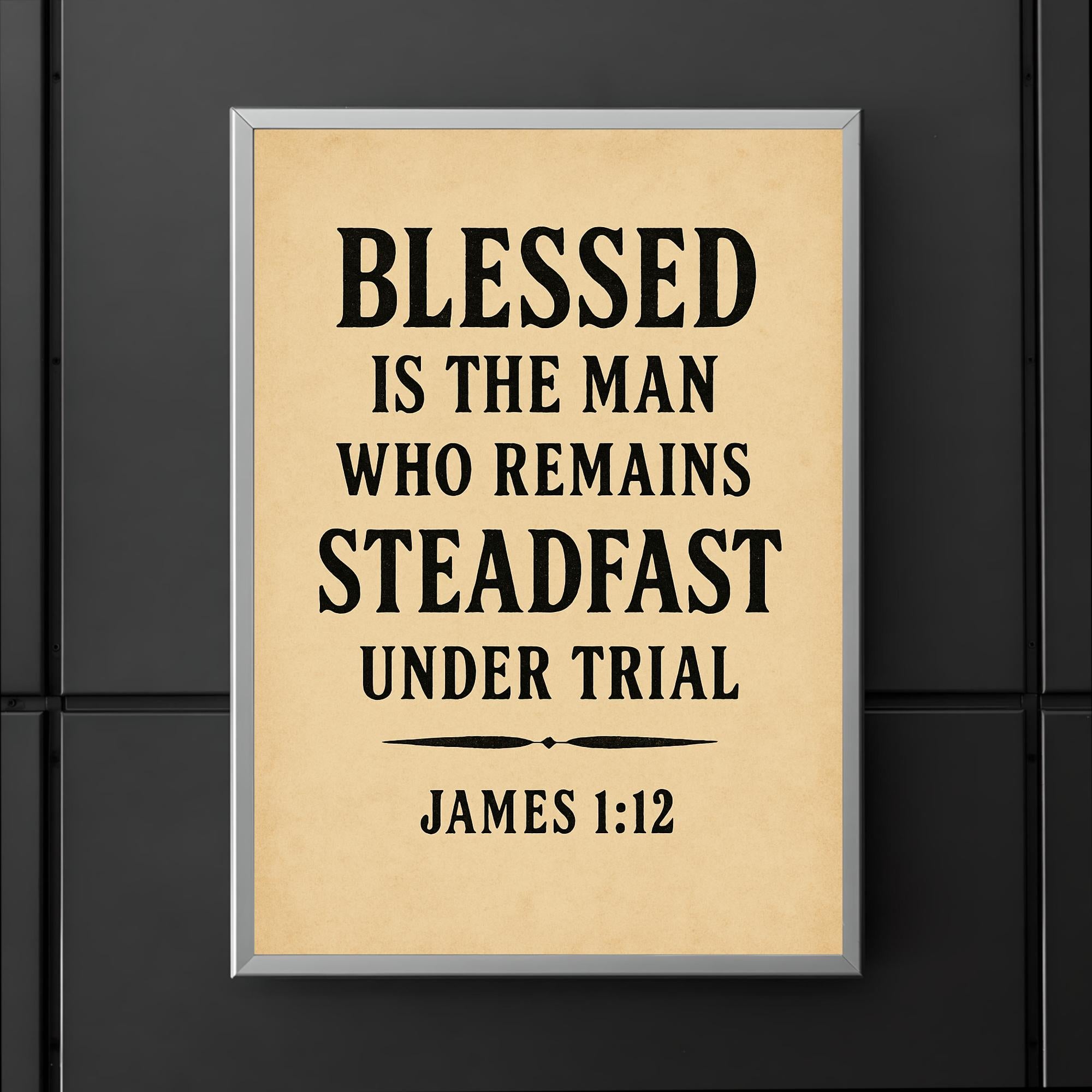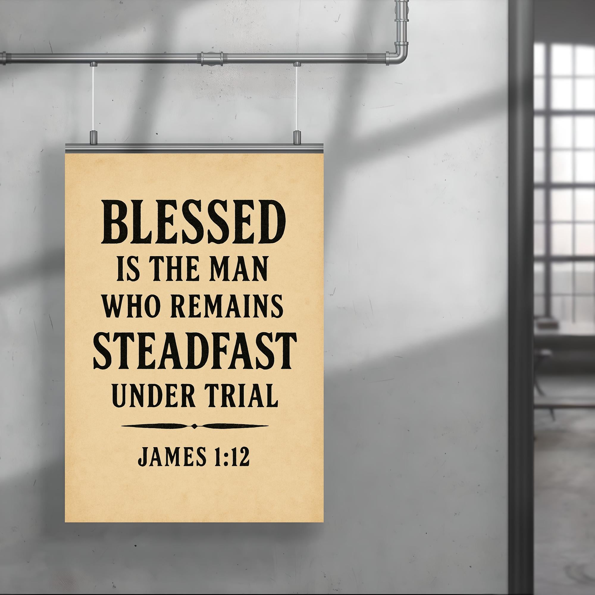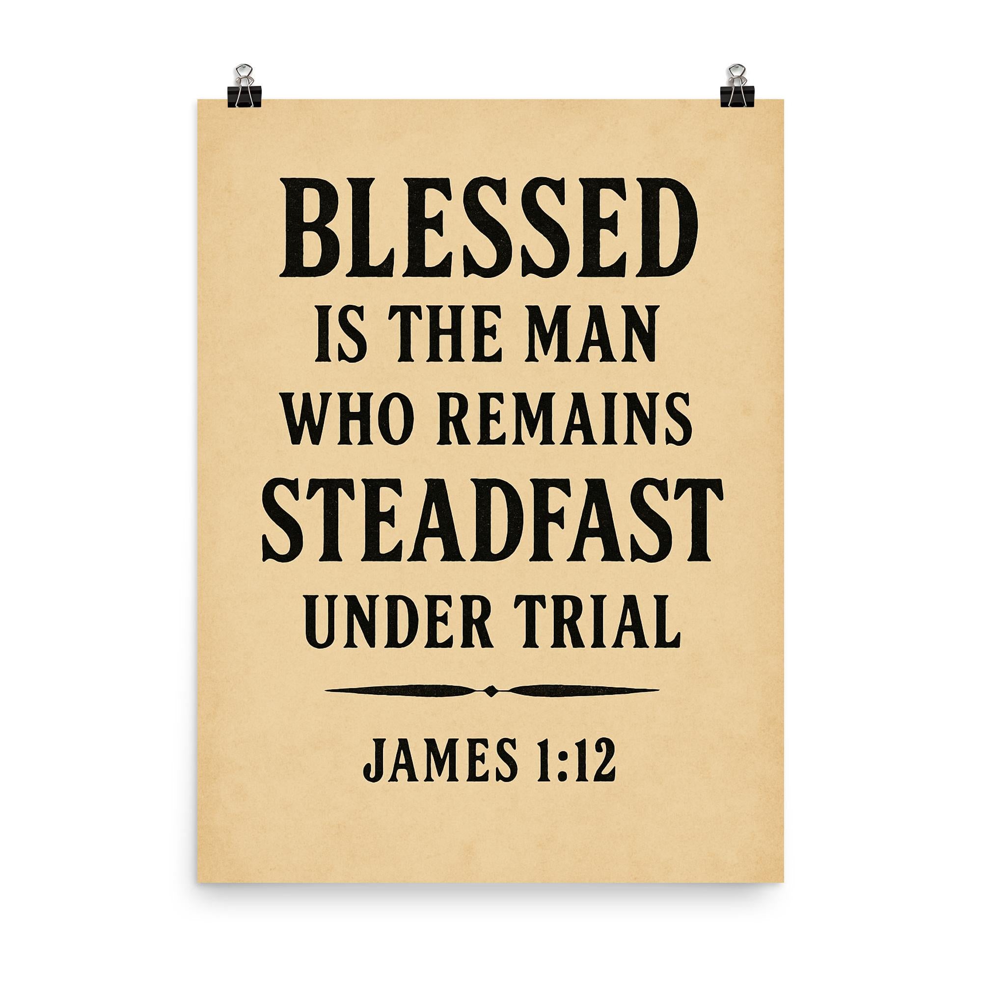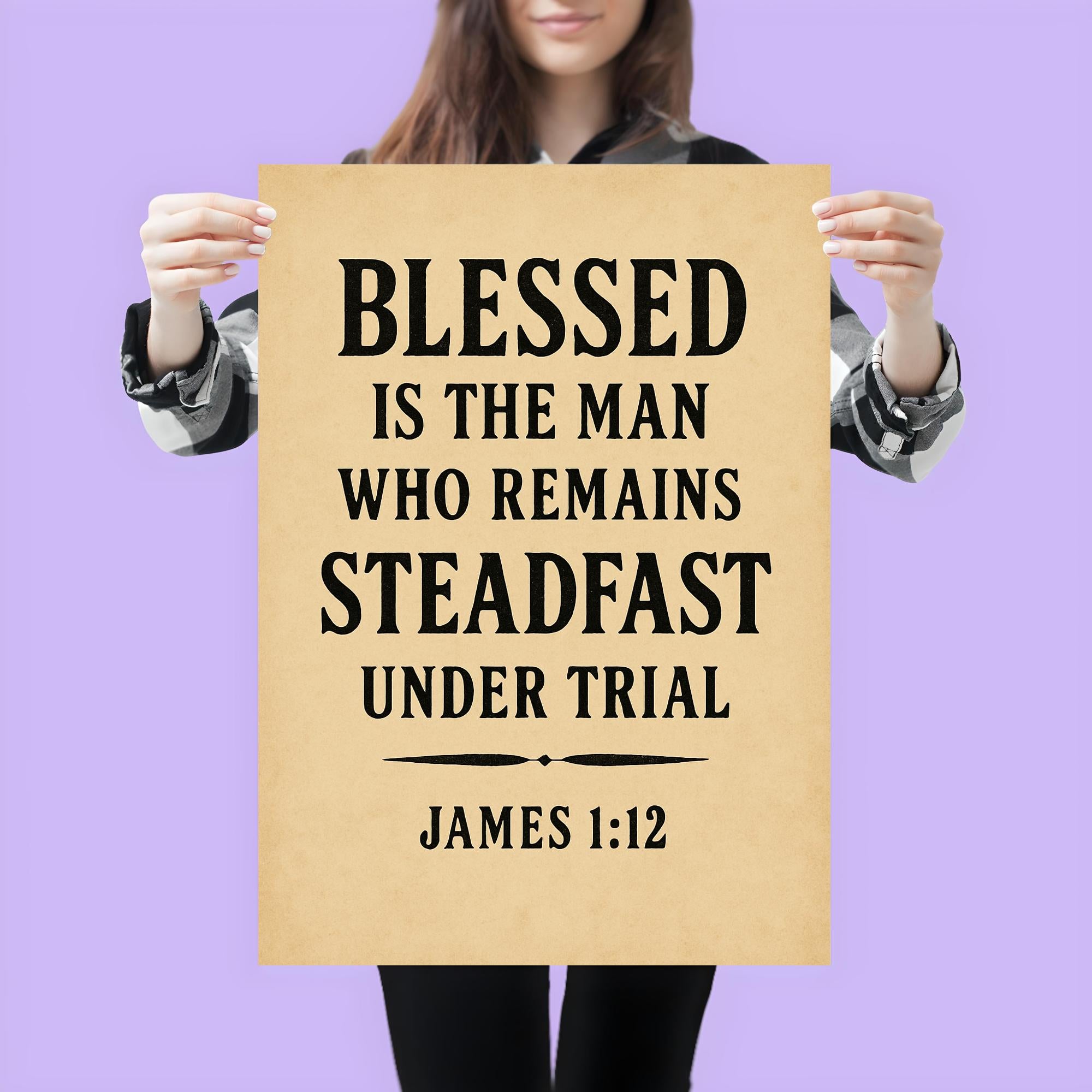 Inspire resilience and faith with this powerful reminder from James 1:12—"Blessed is the man who remains steadfast under trial." Perfect for any space where strength and perseverance are needed, this poster encourages you to stand firm through life’s challenges and embrace the blessings that follow. Let this timeless message uplift your spirit every day.
