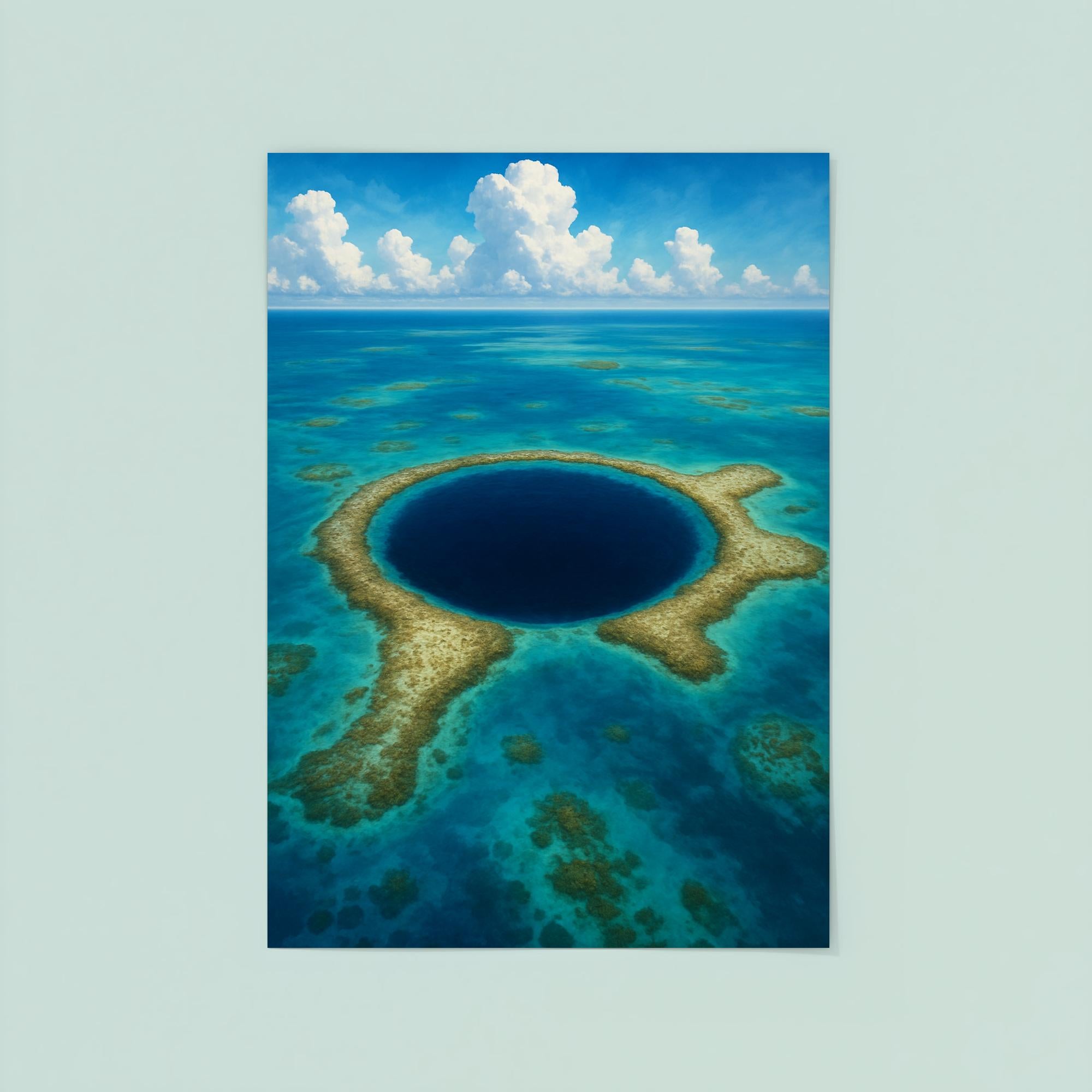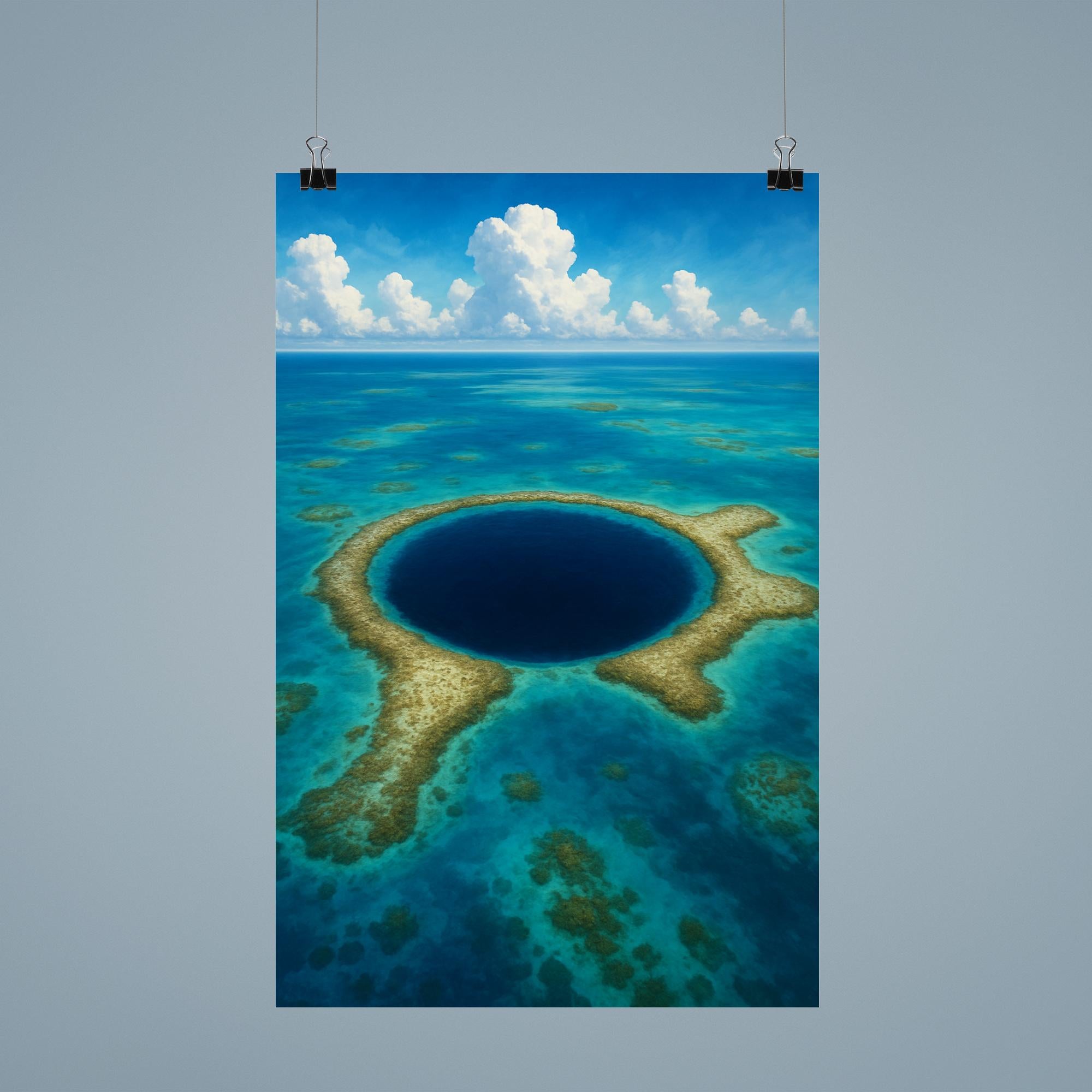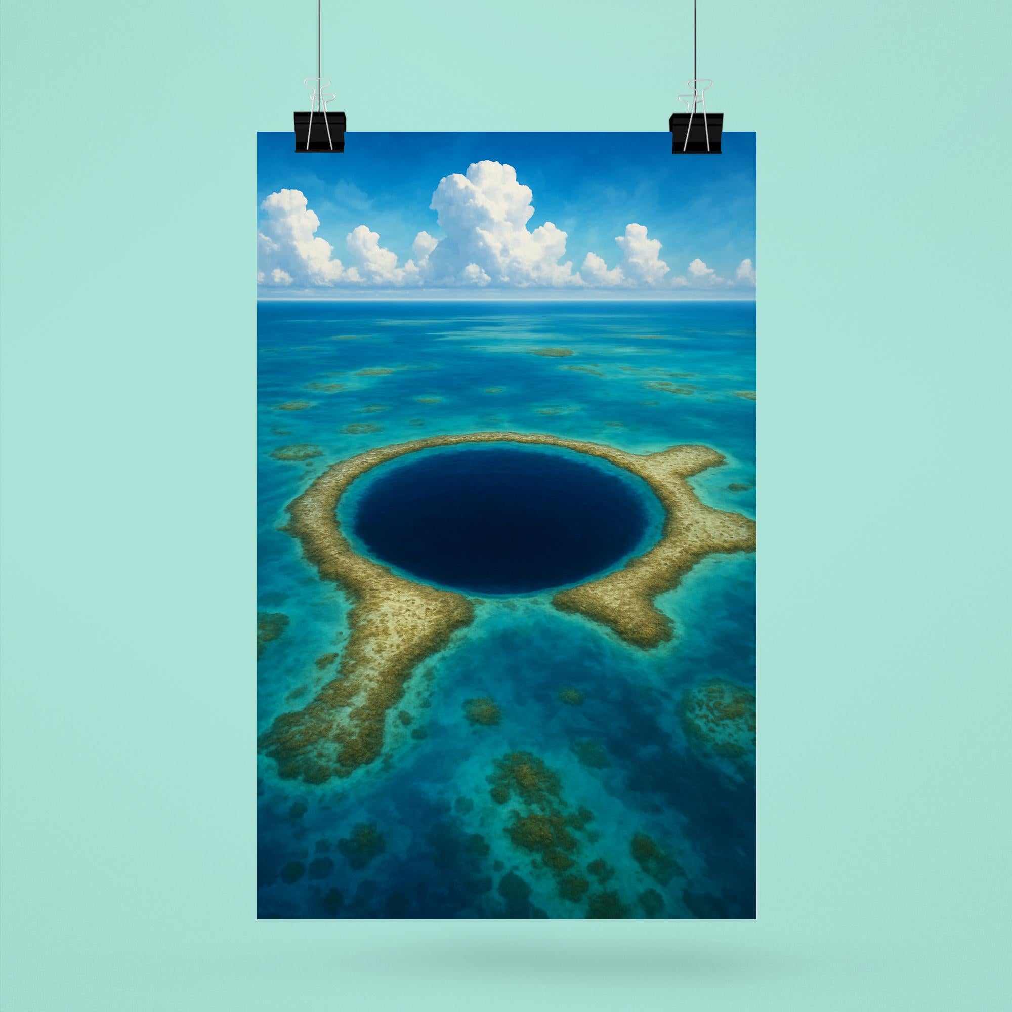 Bring the awe-inspiring beauty of Blue Hole Belize into your space with this stunning poster. Showcasing the iconic underwater sinkhole’s deep blue hues and natural wonder, it’s a perfect tribute to adventure and the extraordinary power of nature. Whether for your home or office, this poster invites you to explore the depths of the world’s most captivating marine marvel every day.