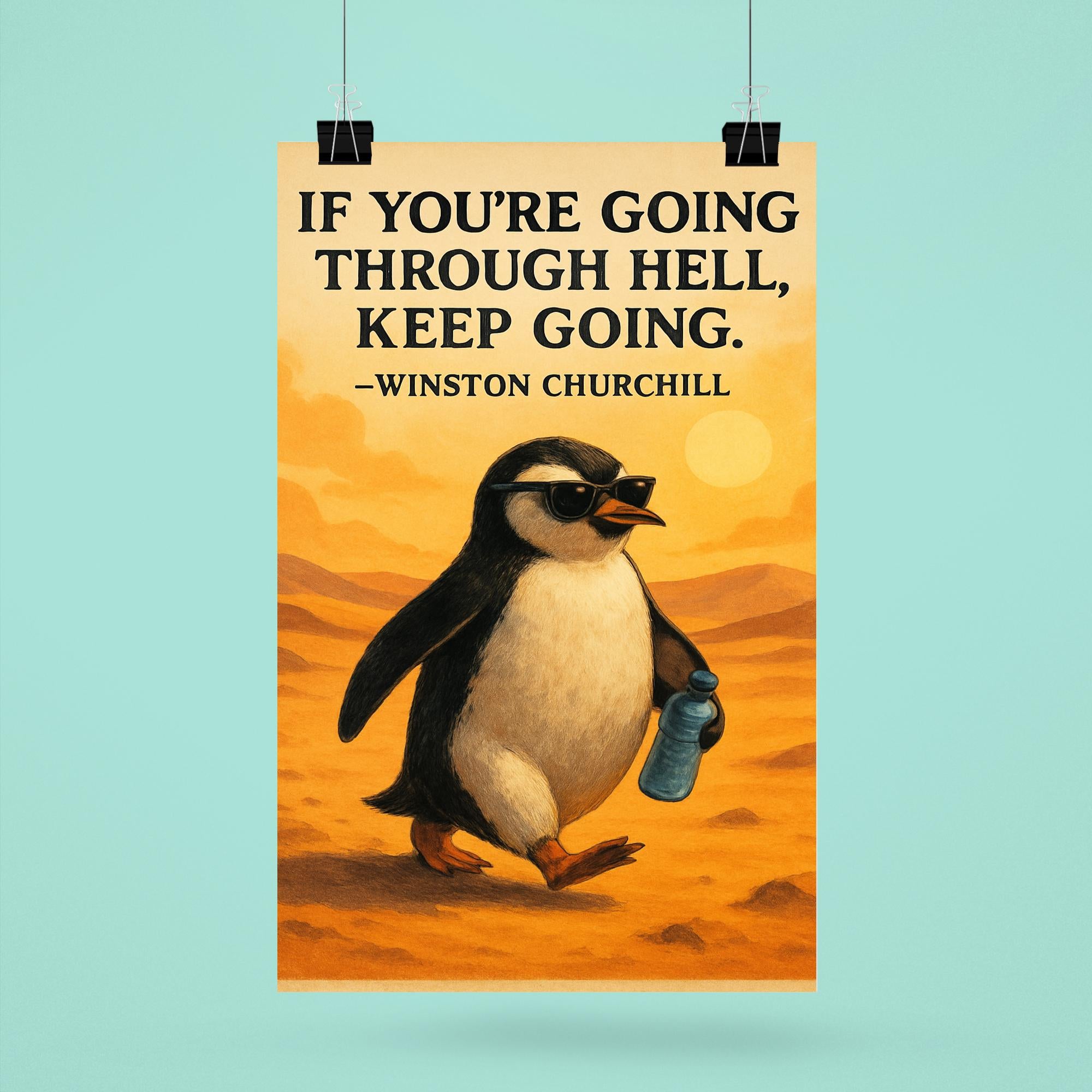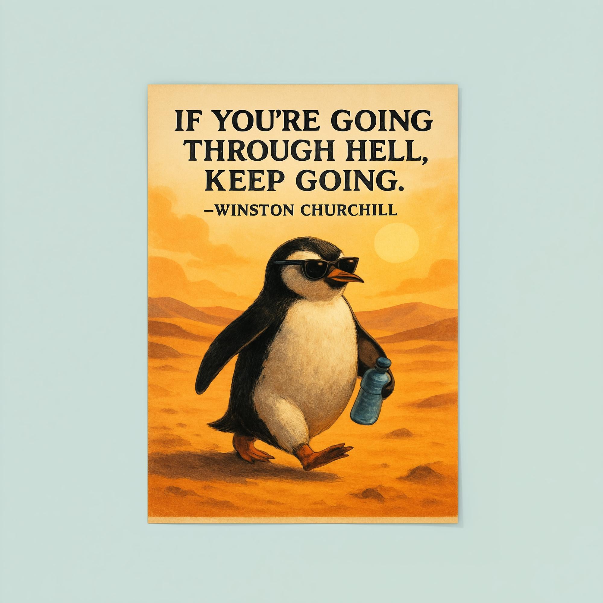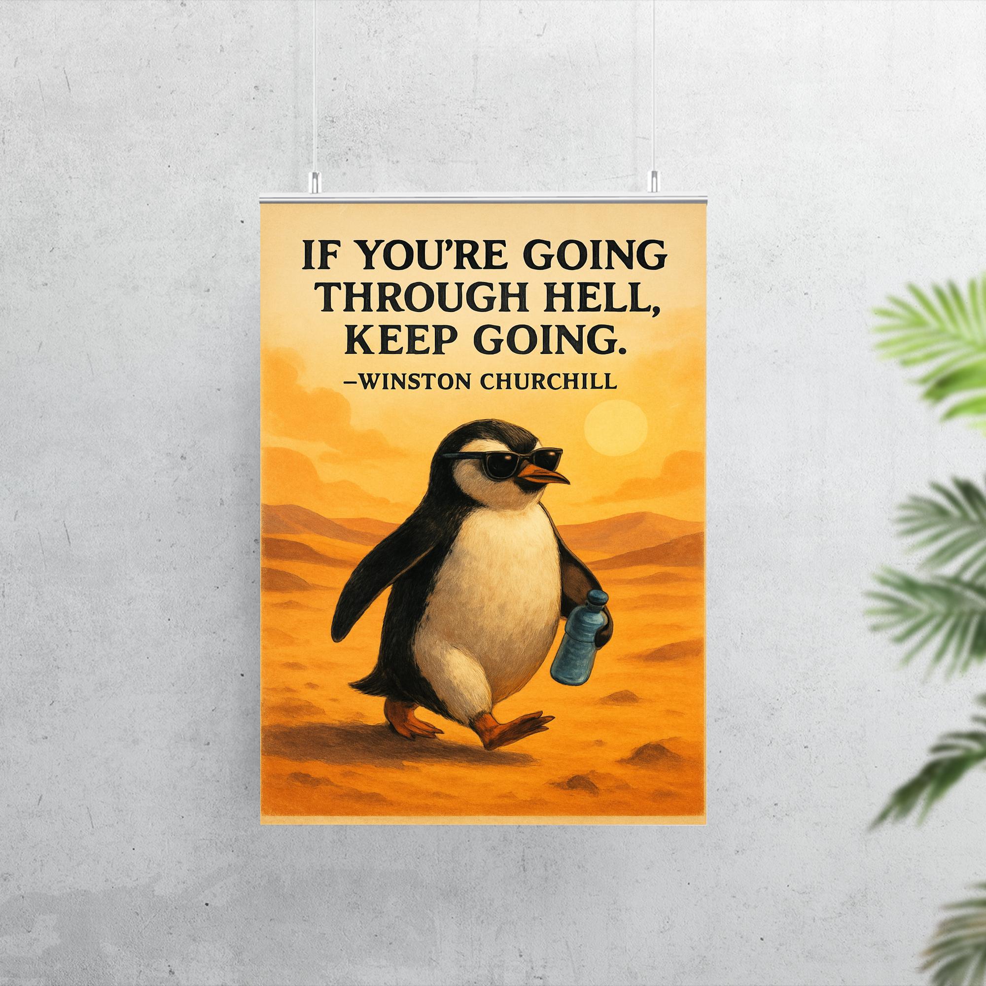 Inspire every day with this bold poster featuring Churchill’s timeless call to "Keep Going." Paired with a determined penguin donning sunglasses and clutching a water bottle, it’s a quirky reminder to face challenges with confidence and resilience. Perfect for any space that needs a boost of motivation and a touch of playful spirit.