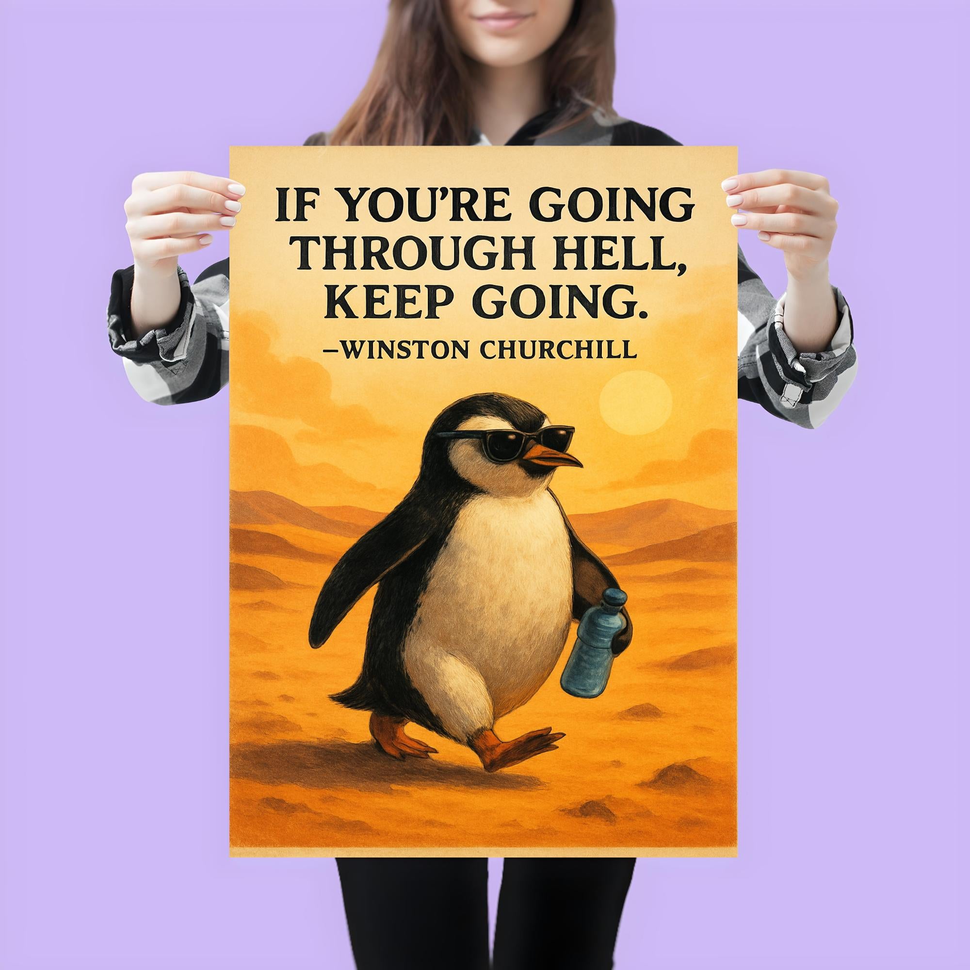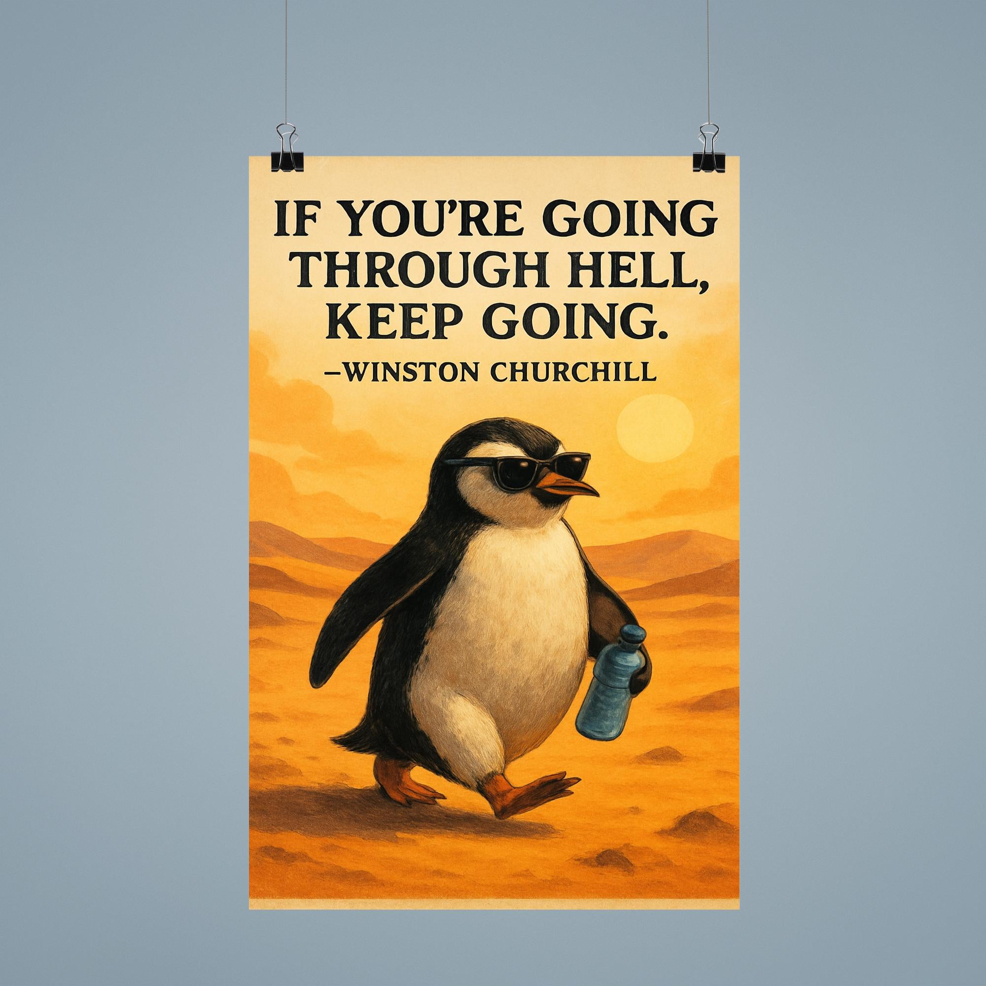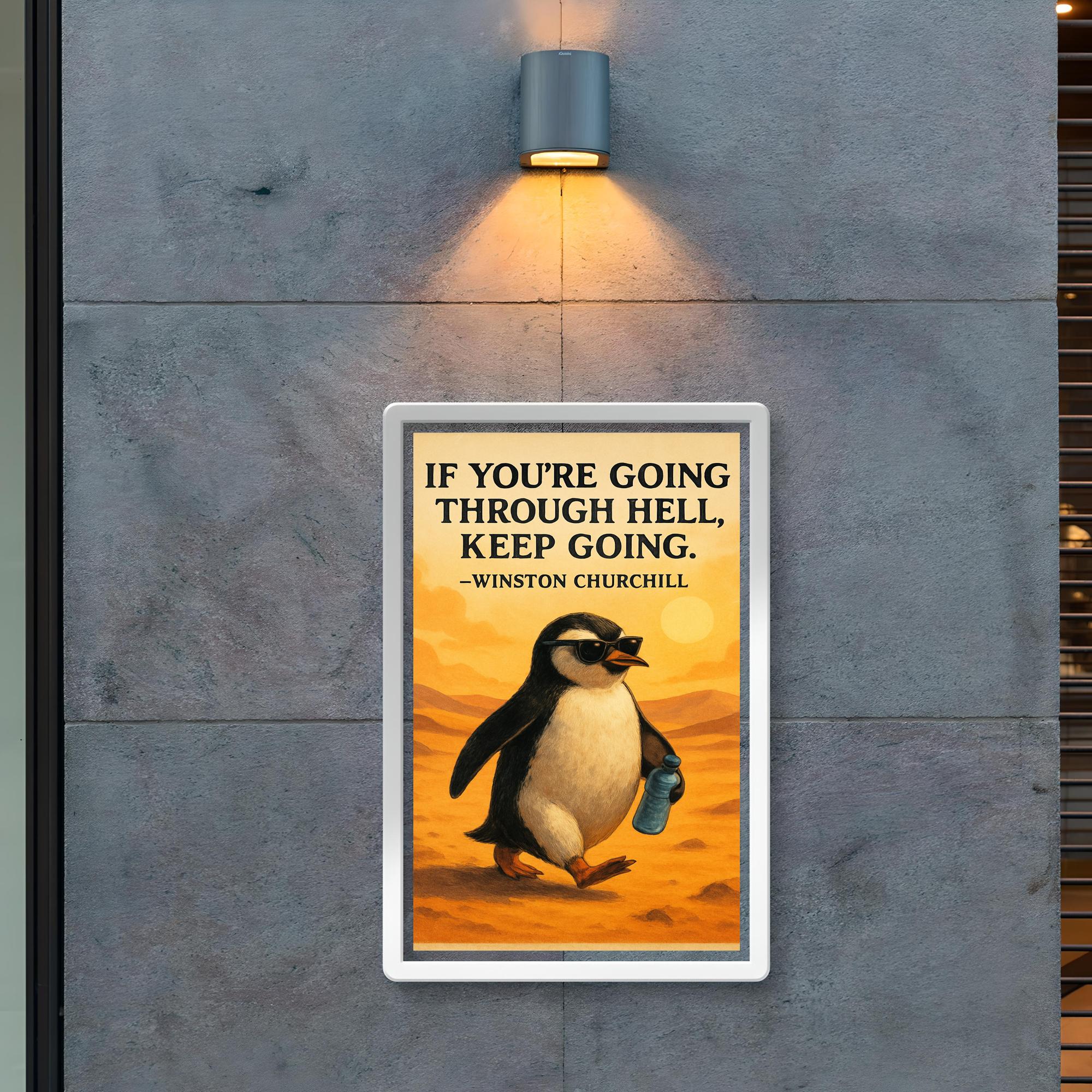 Inspire every day with this bold poster featuring Churchill’s timeless call to "Keep Going." Paired with a determined penguin donning sunglasses and clutching a water bottle, it’s a quirky reminder to face challenges with confidence and resilience. Perfect for any space that needs a boost of motivation and a touch of playful spirit.