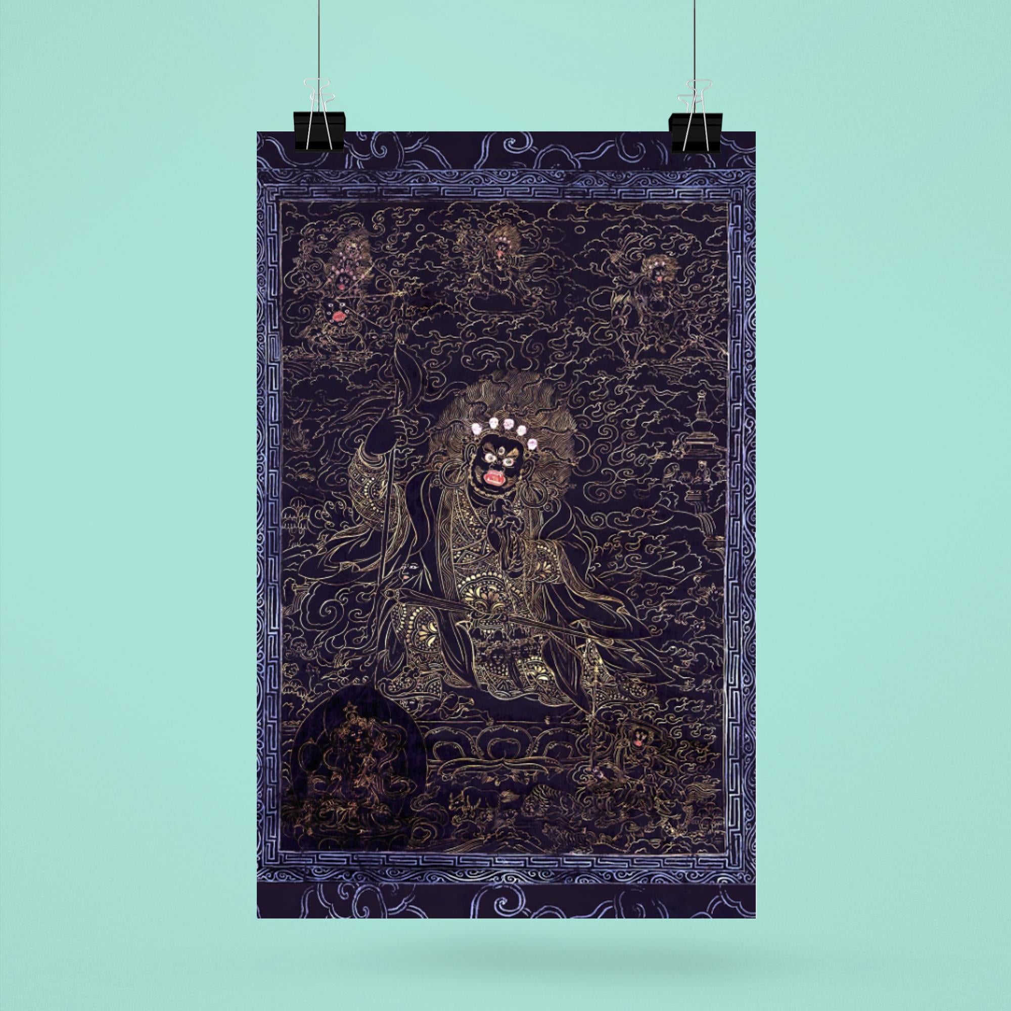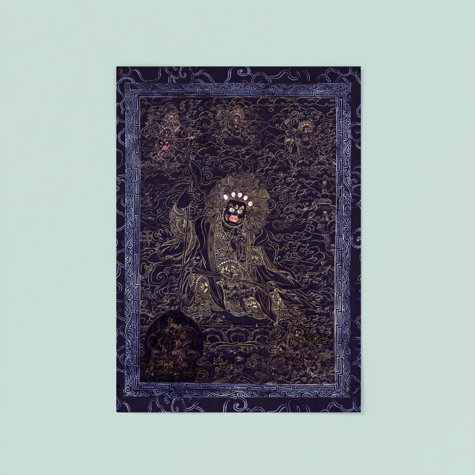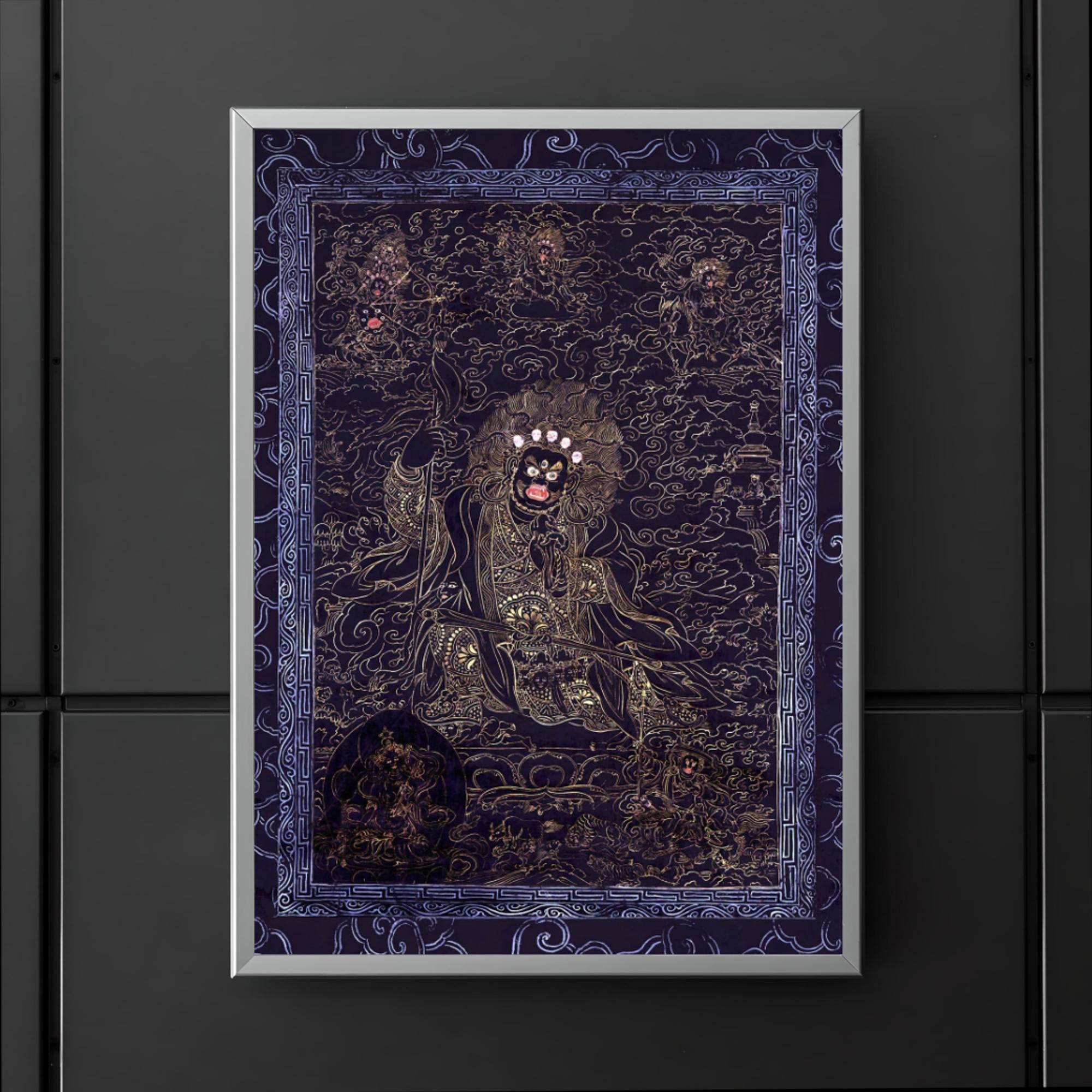 Elevate your space with the serene power of the Cobalt and Gold Mahakala - Avalokiteshvara Abitabha poster. This exquisite Tibetan Buddhist artwork captures the compassionate spirit of the Bodhisattva of Compassion, blending rich cobalt hues with radiant gold accents to inspire peace and protection. A timeless piece that invites mindfulness and spiritual calm into any environment.
