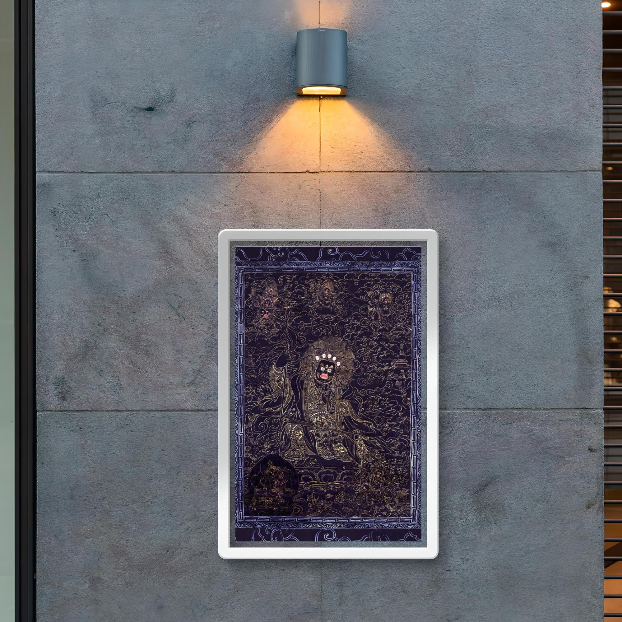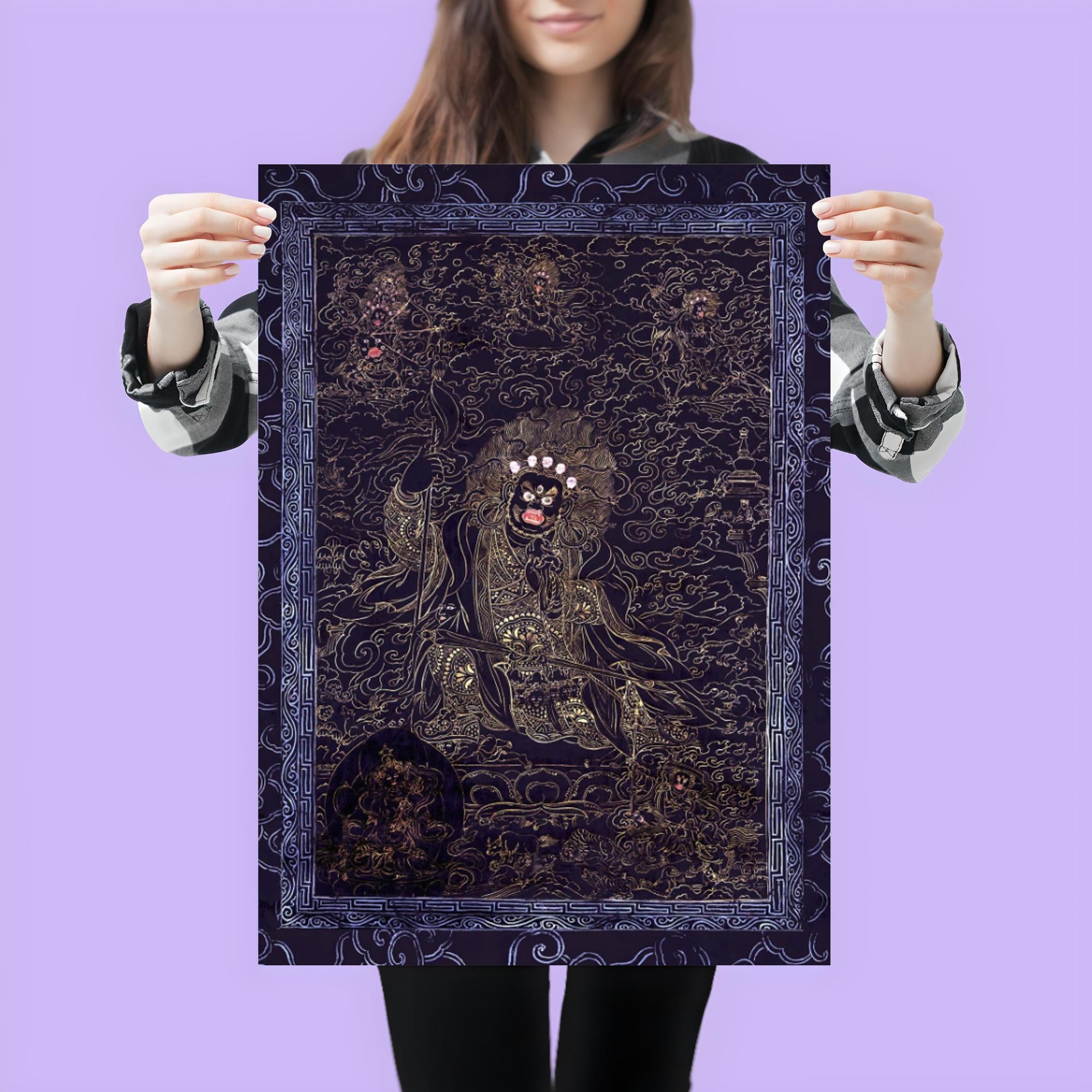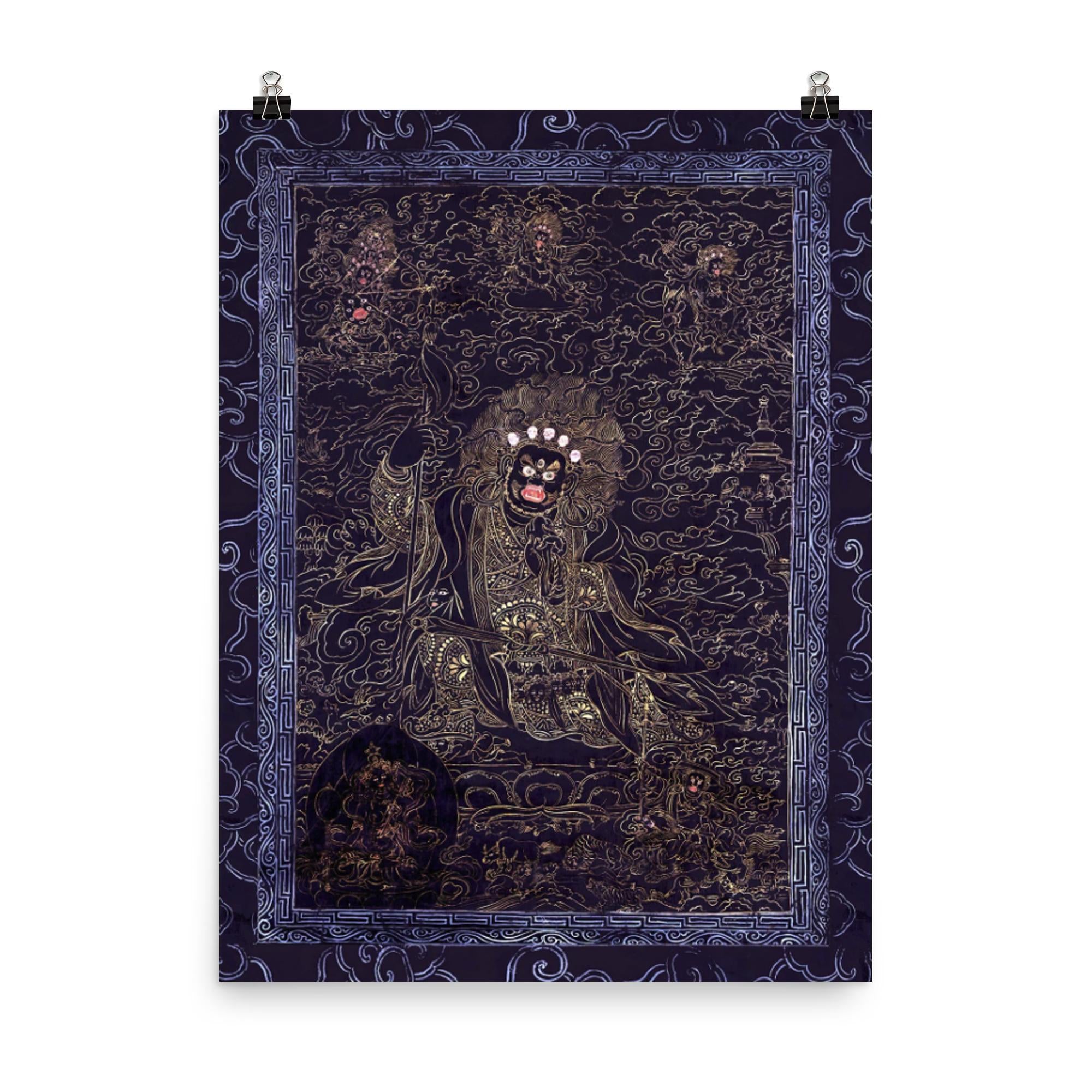 Elevate your space with the serene power of the Cobalt and Gold Mahakala - Avalokiteshvara Abitabha poster. This exquisite Tibetan Buddhist artwork captures the compassionate spirit of the Bodhisattva of Compassion, blending rich cobalt hues with radiant gold accents to inspire peace and protection. A timeless piece that invites mindfulness and spiritual calm into any environment.
