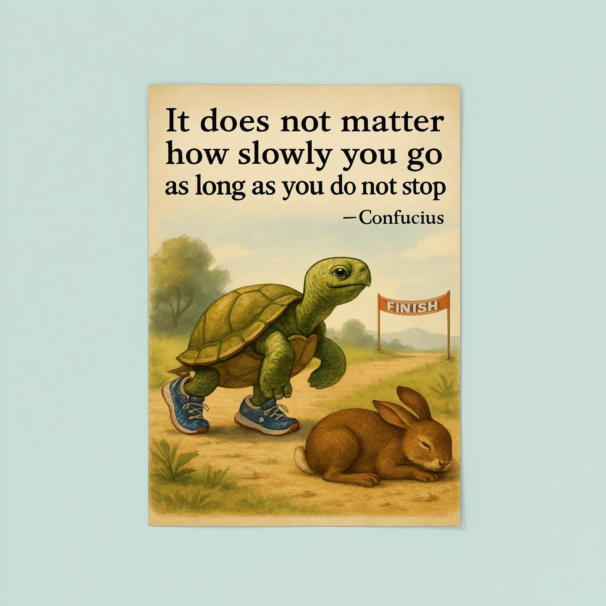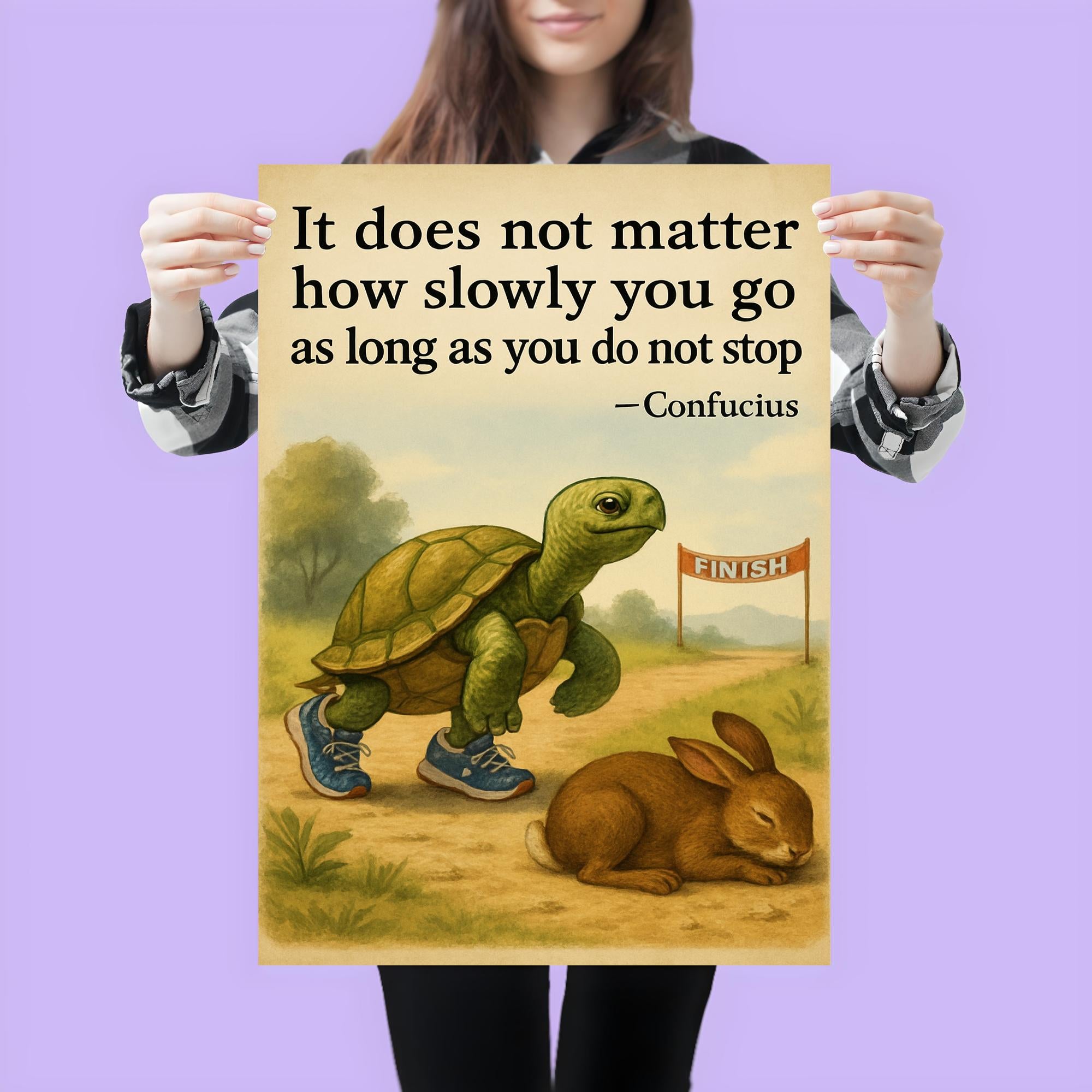 Embrace timeless wisdom with this inspiring poster featuring Confucius' powerful reminder: "Tortoise running, do not stop." It’s a perfect motivator to keep moving forward steadily and persistently, no matter the pace. A subtle yet profound encouragement to persevere, this piece will uplift any space where determination and patience are valued.