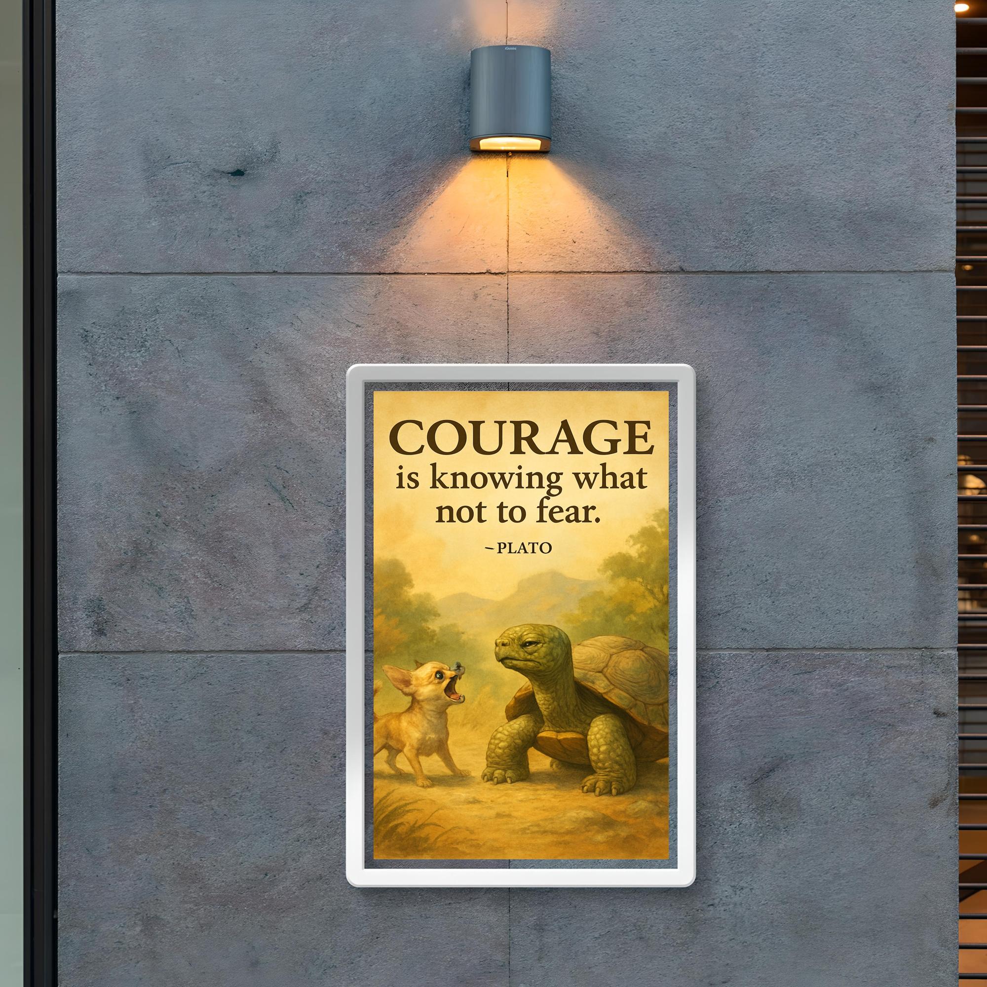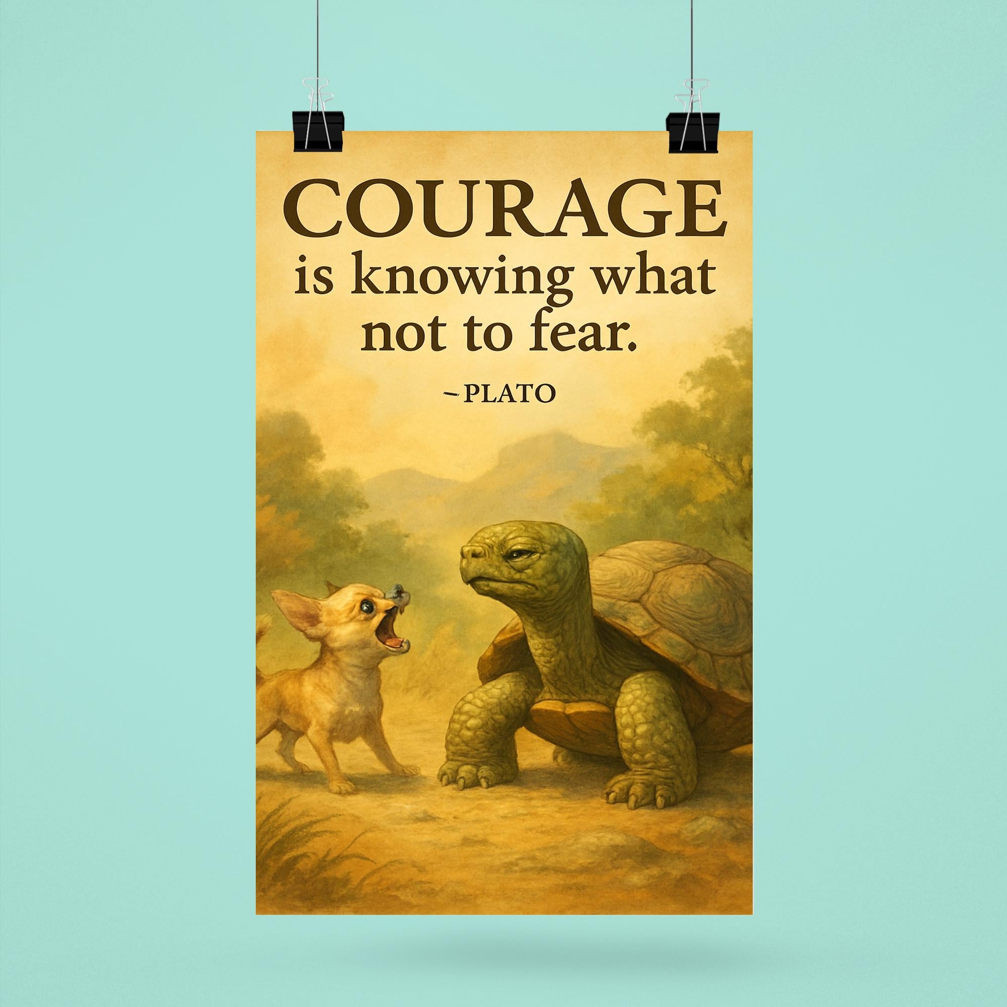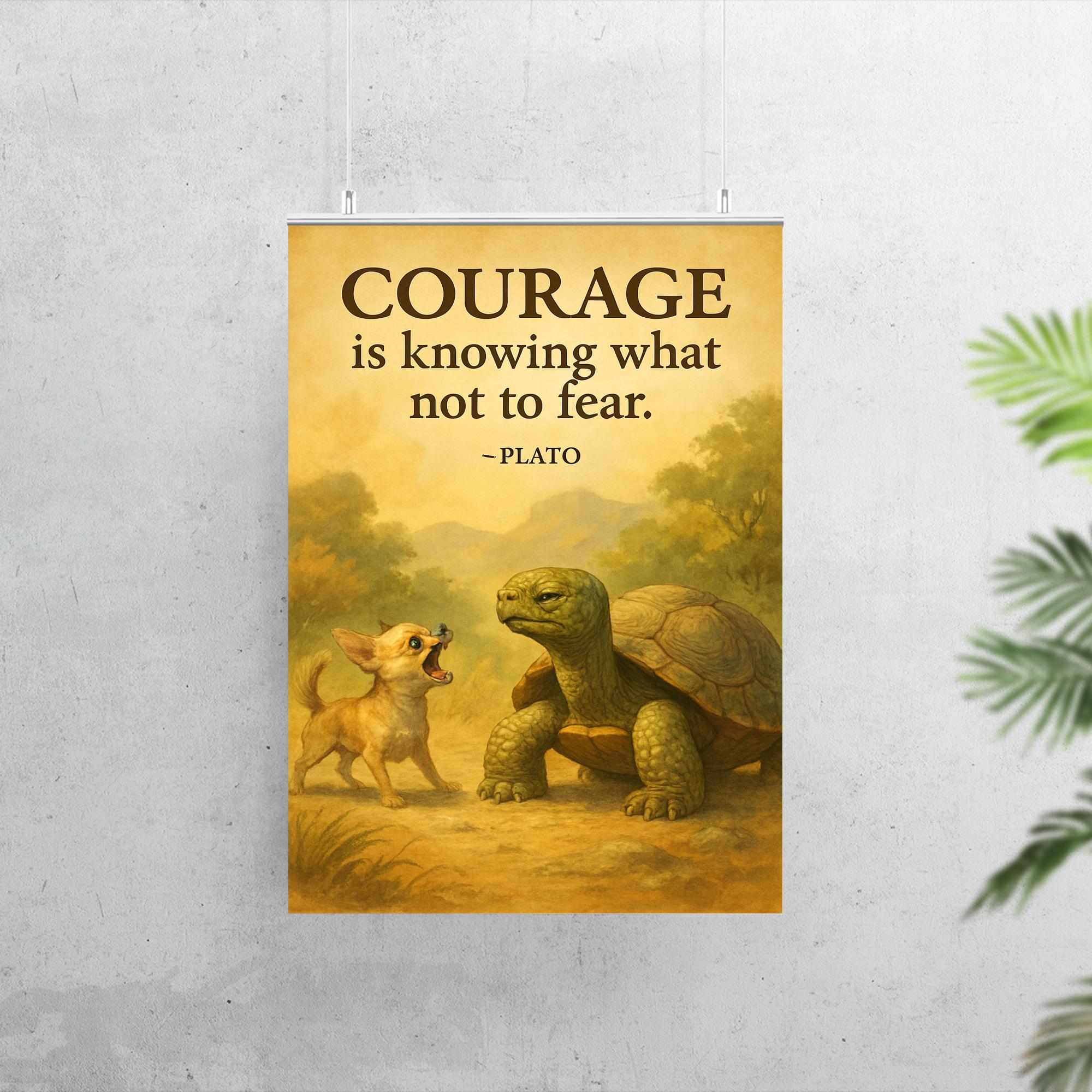 Embrace the timeless wisdom of Plato with this inspiring poster featuring the mantra, "Courage is knowing what not to fear." Perfectly captured through the calm presence of a wise old turtle confidently ignoring a barking Chihuahua, it’s a powerful reminder to face life’s challenges with steady resolve and discernment. Elevate your space with this thought-provoking piece that encourages bravery grounded in wisdom.