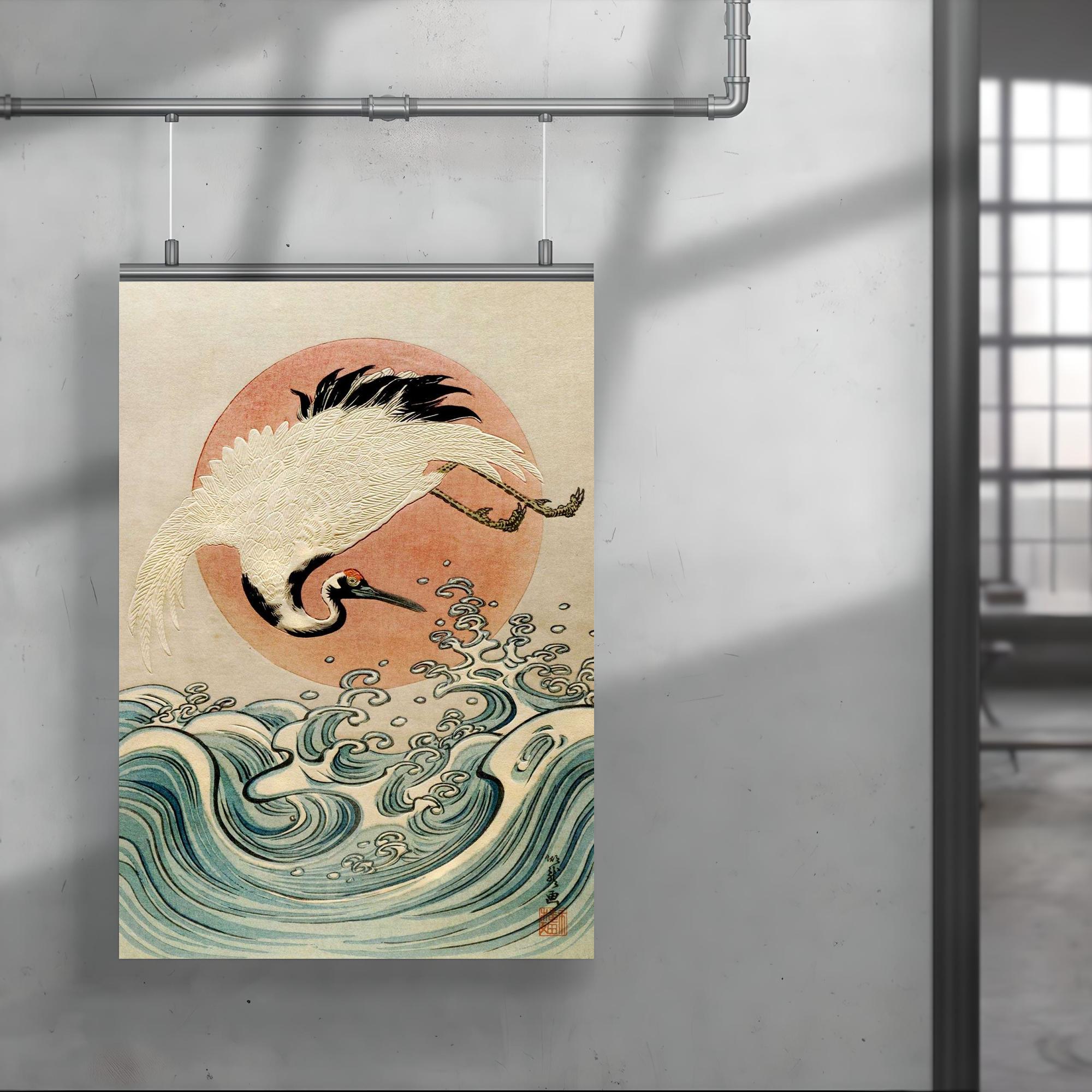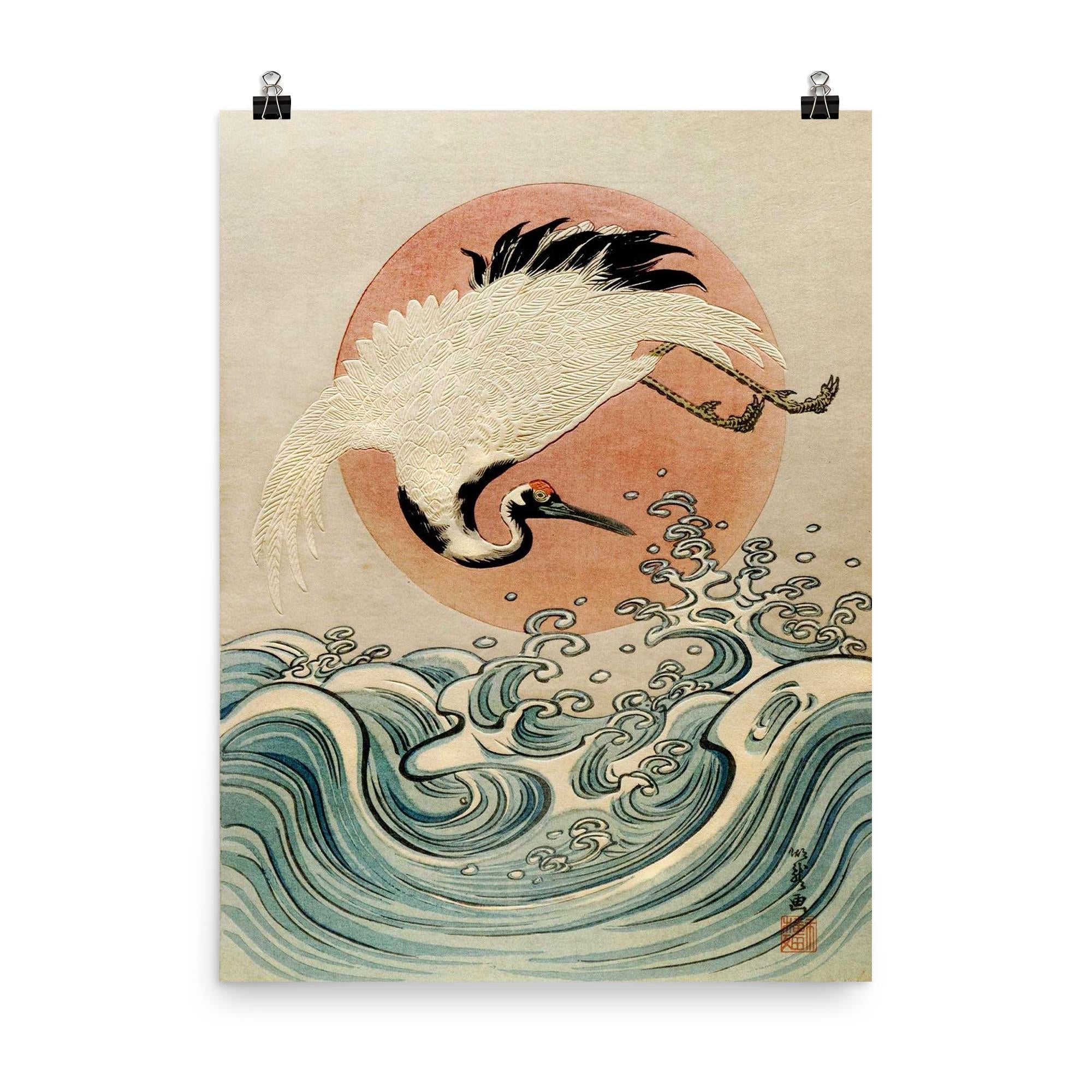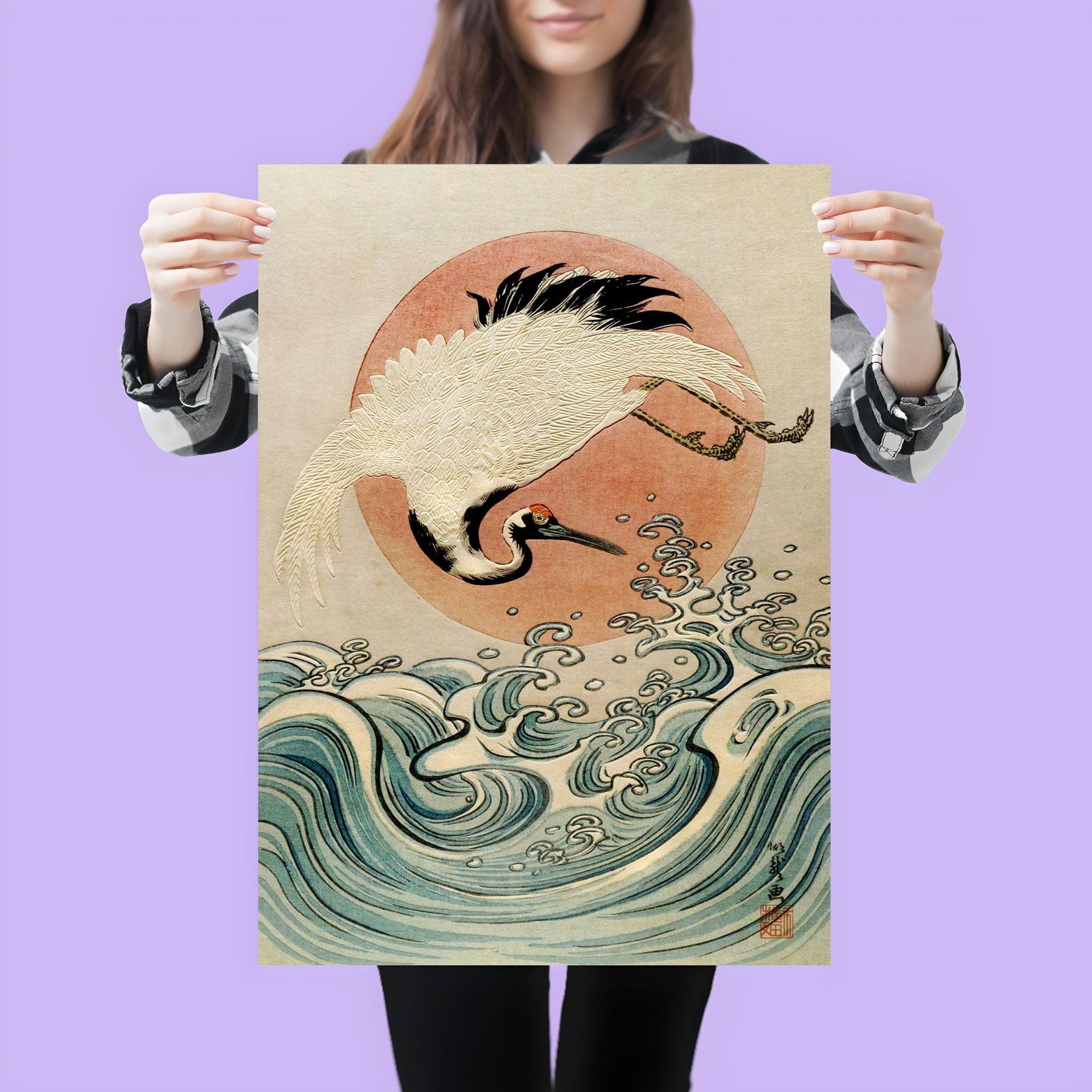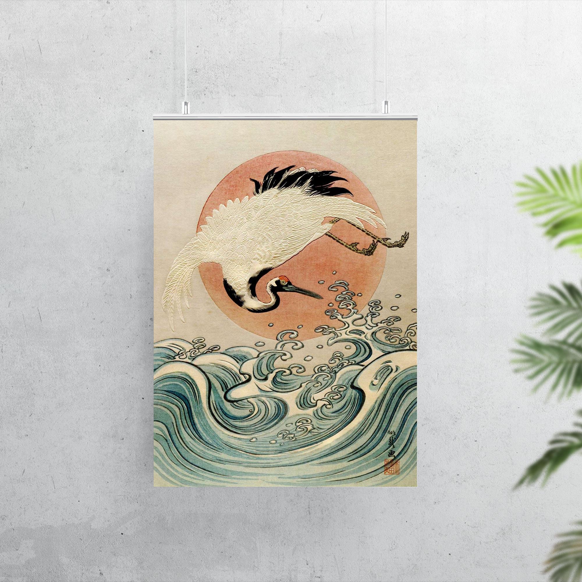 Isoda Koryusai Ukiyo-e Poster Print – Crane, Waves & Rising Sun Edo Era Japanese Wall Art