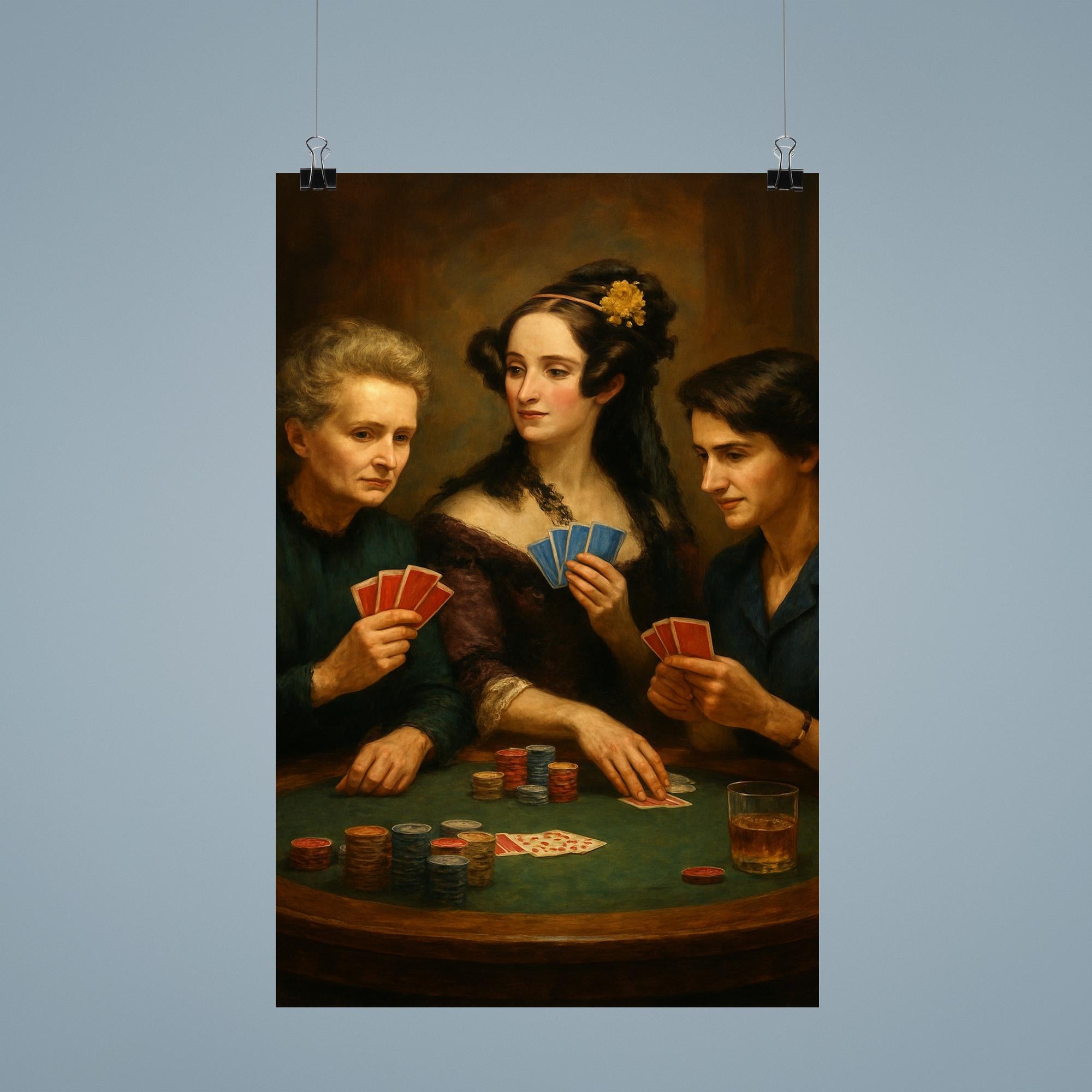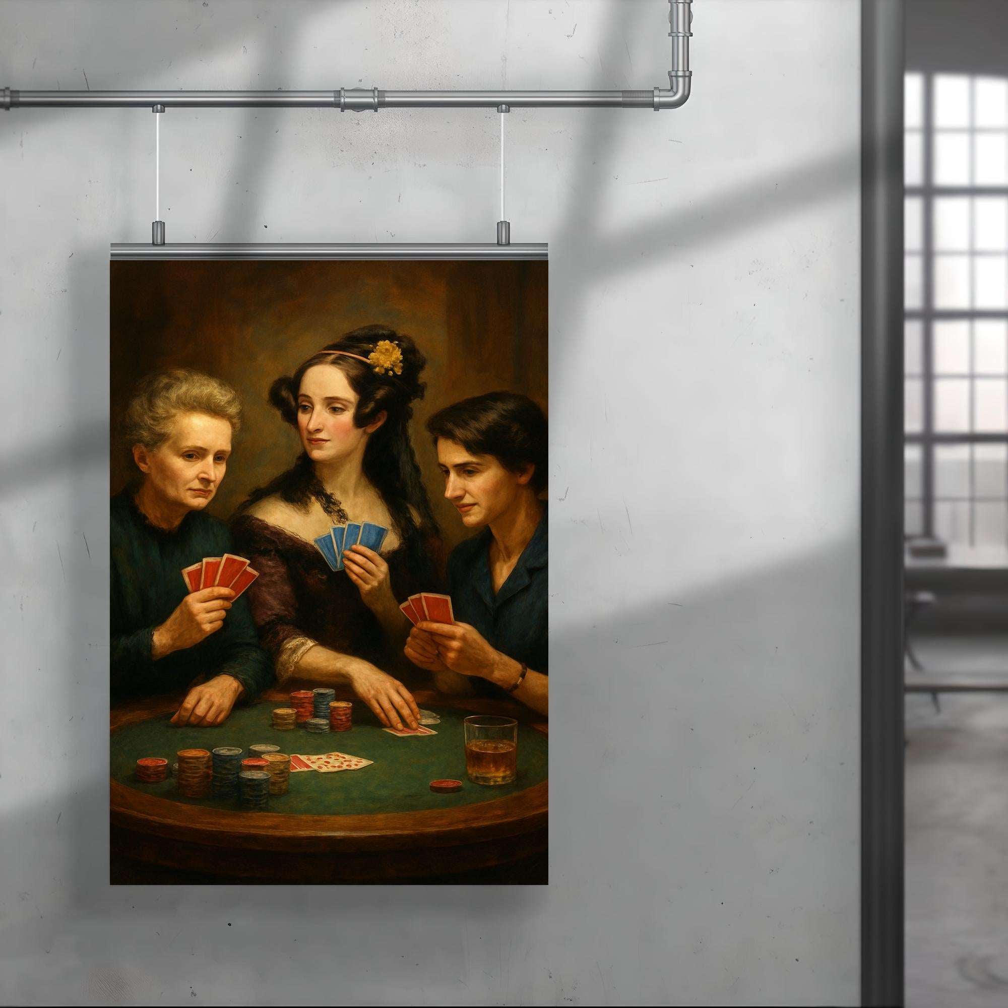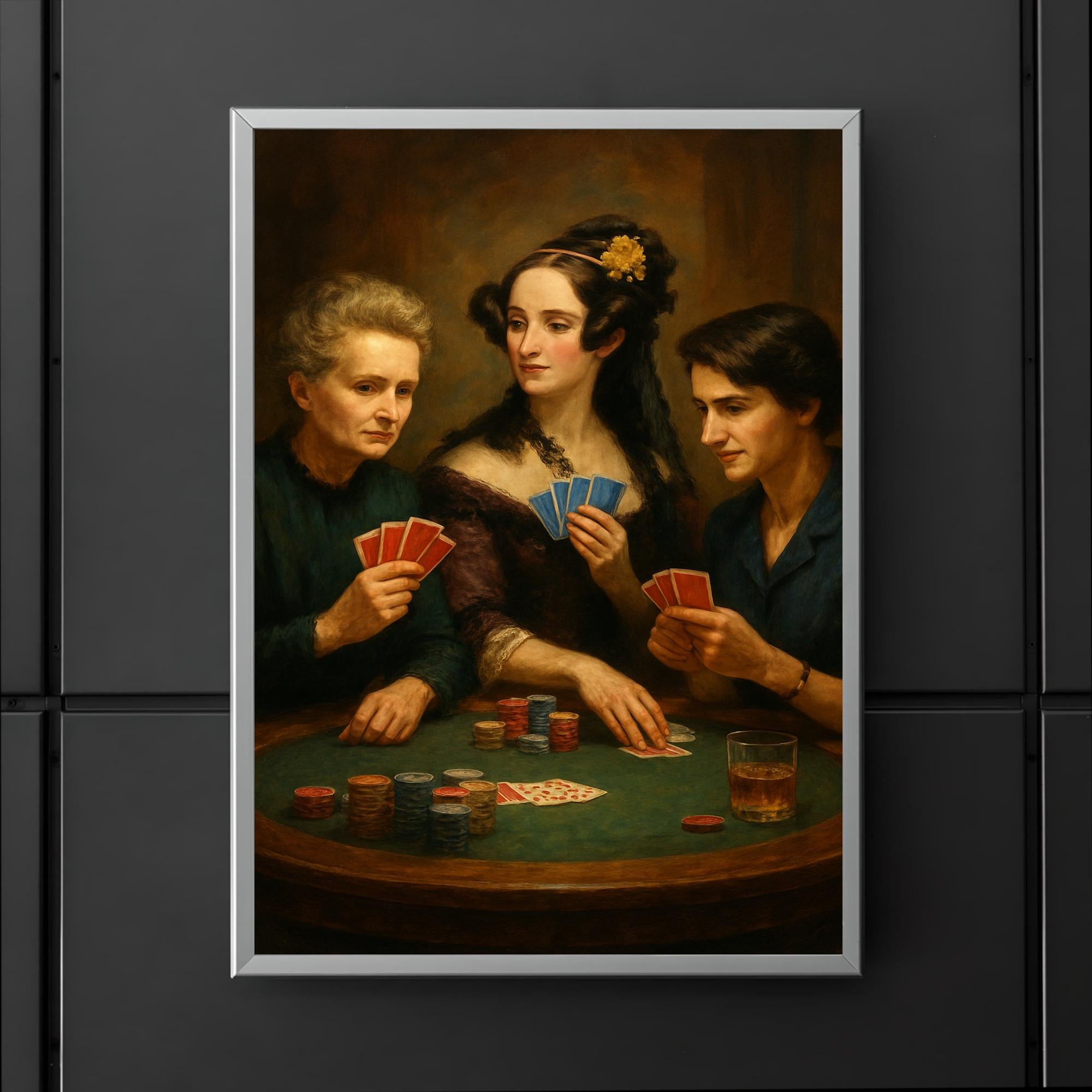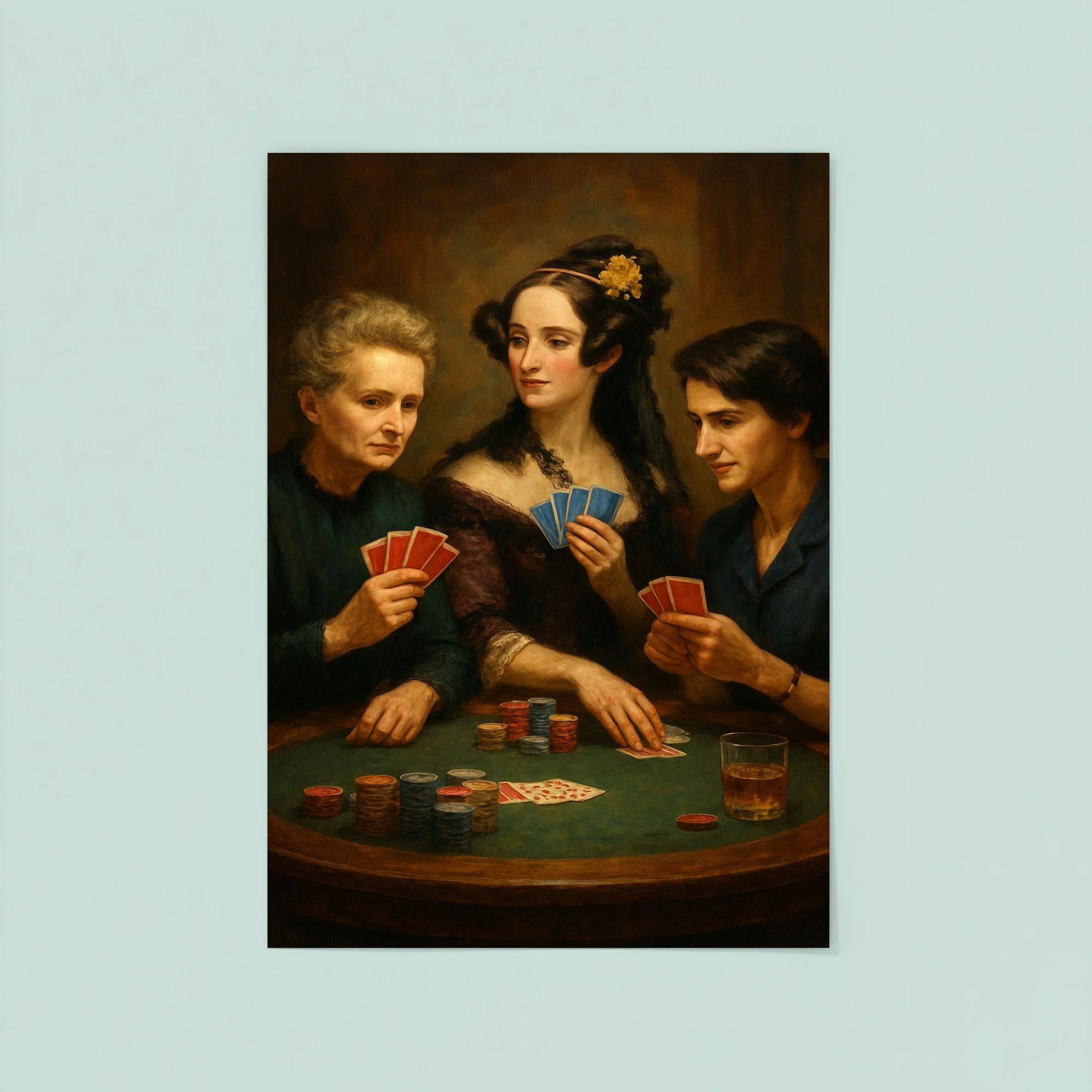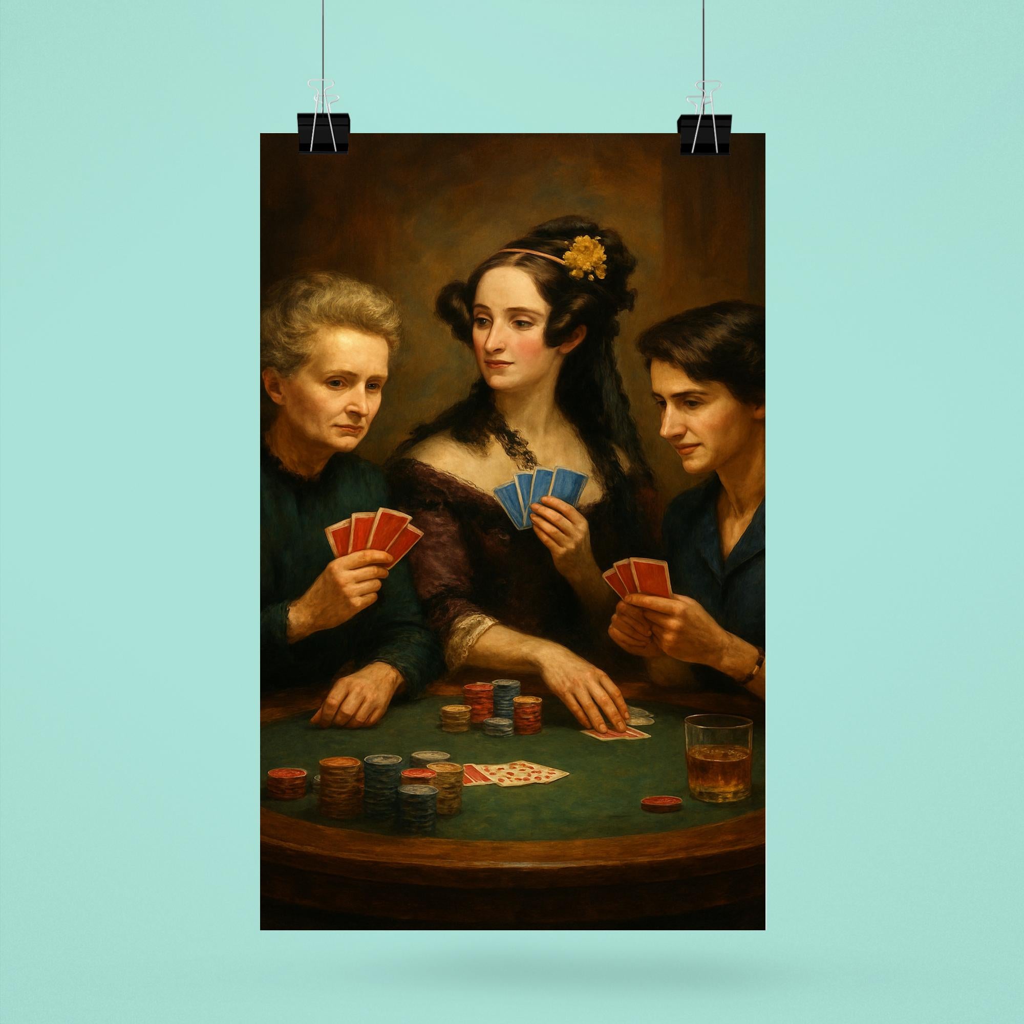 Step into a world where brilliance meets wit with this striking poster of Curie, Lovelace, and Franklin engrossed in a game of poker. Celebrate the genius and camaraderie of these iconic pioneers as their legendary minds converge in a playful, timeless moment. Perfect for sparking inspiration and conversation, this artwork transforms any space into a tribute to intellect and creativity.