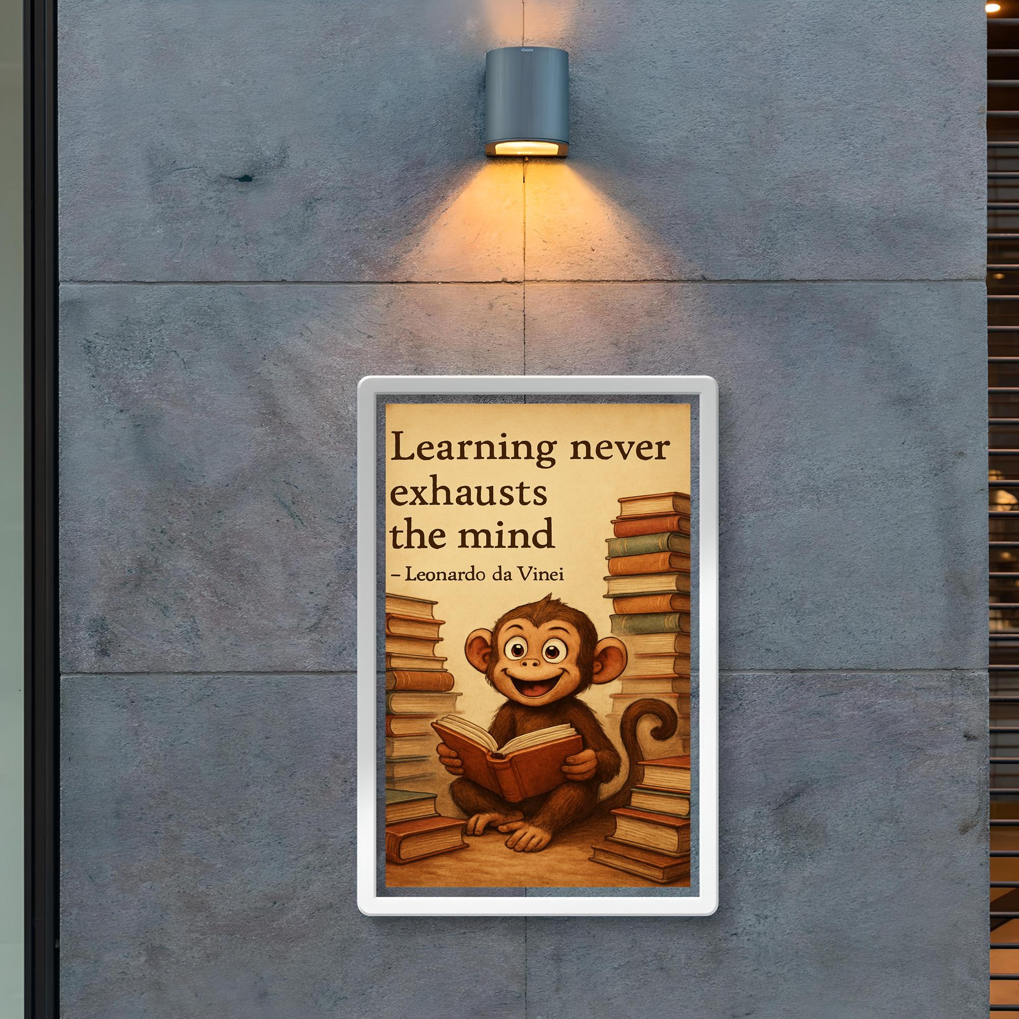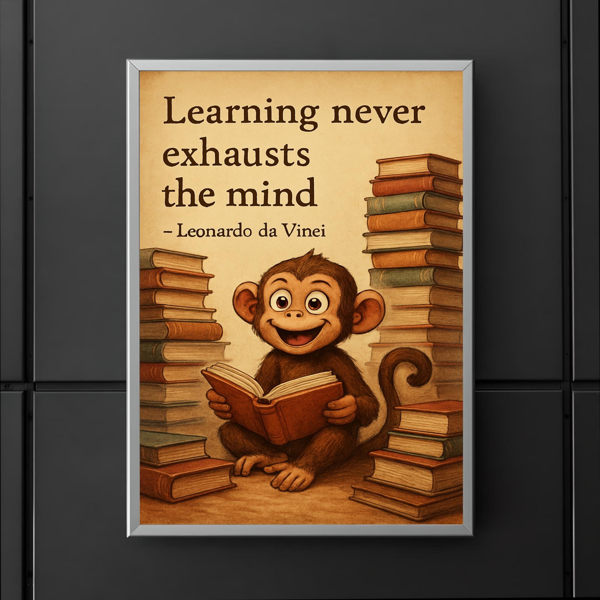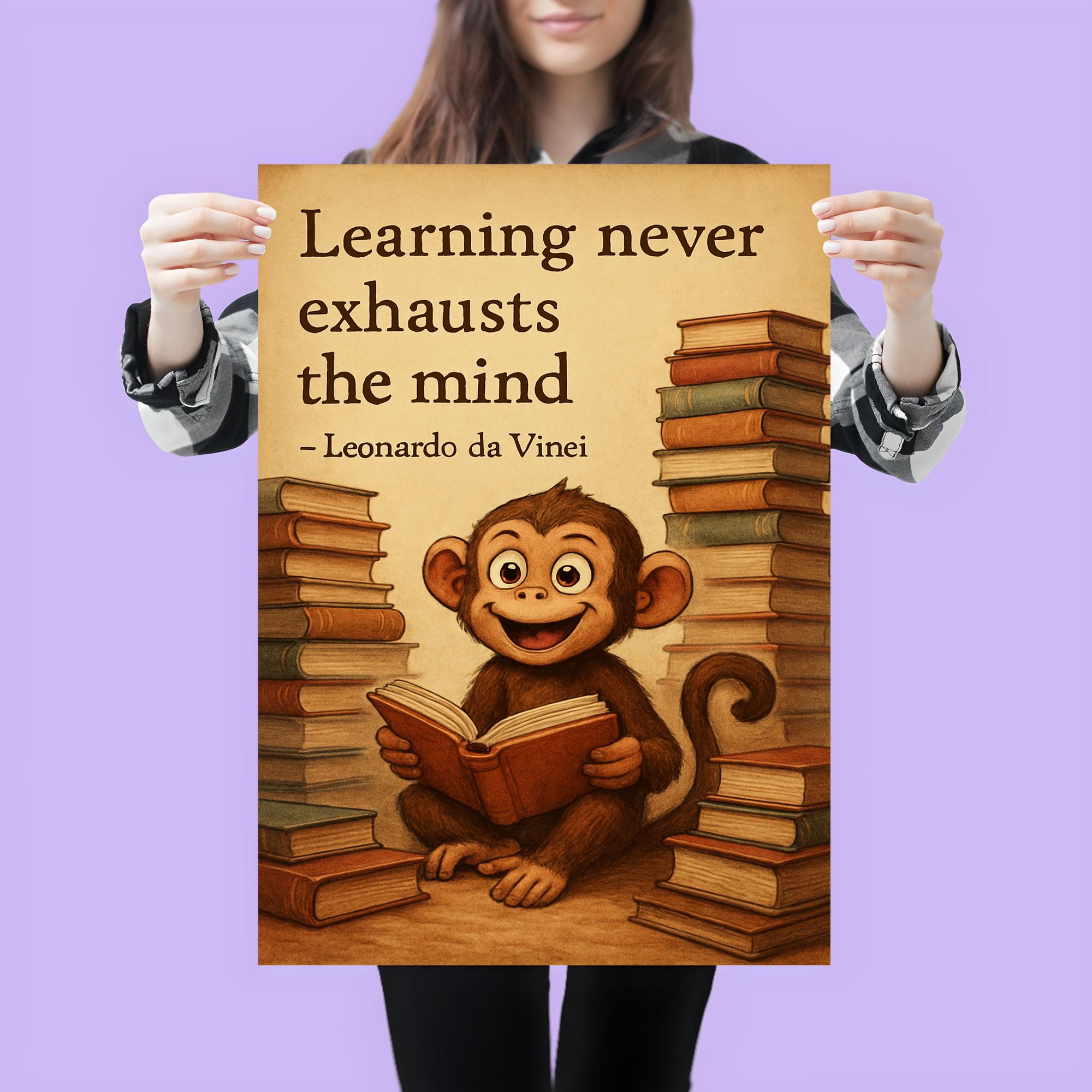 Curious Monkey with Books Wall Art Poster Print Inspired by Leonardo da Vinci Quote – Unique Educational Decor for Home & Office