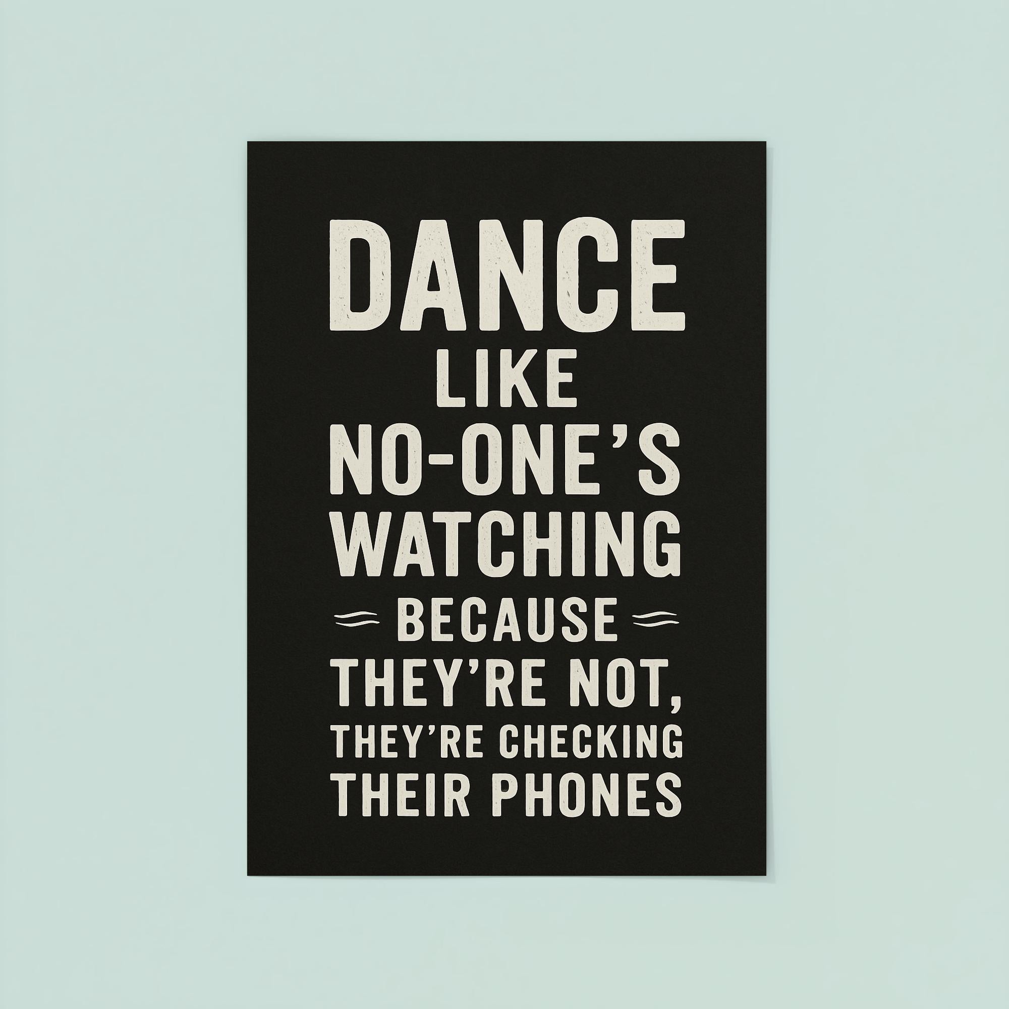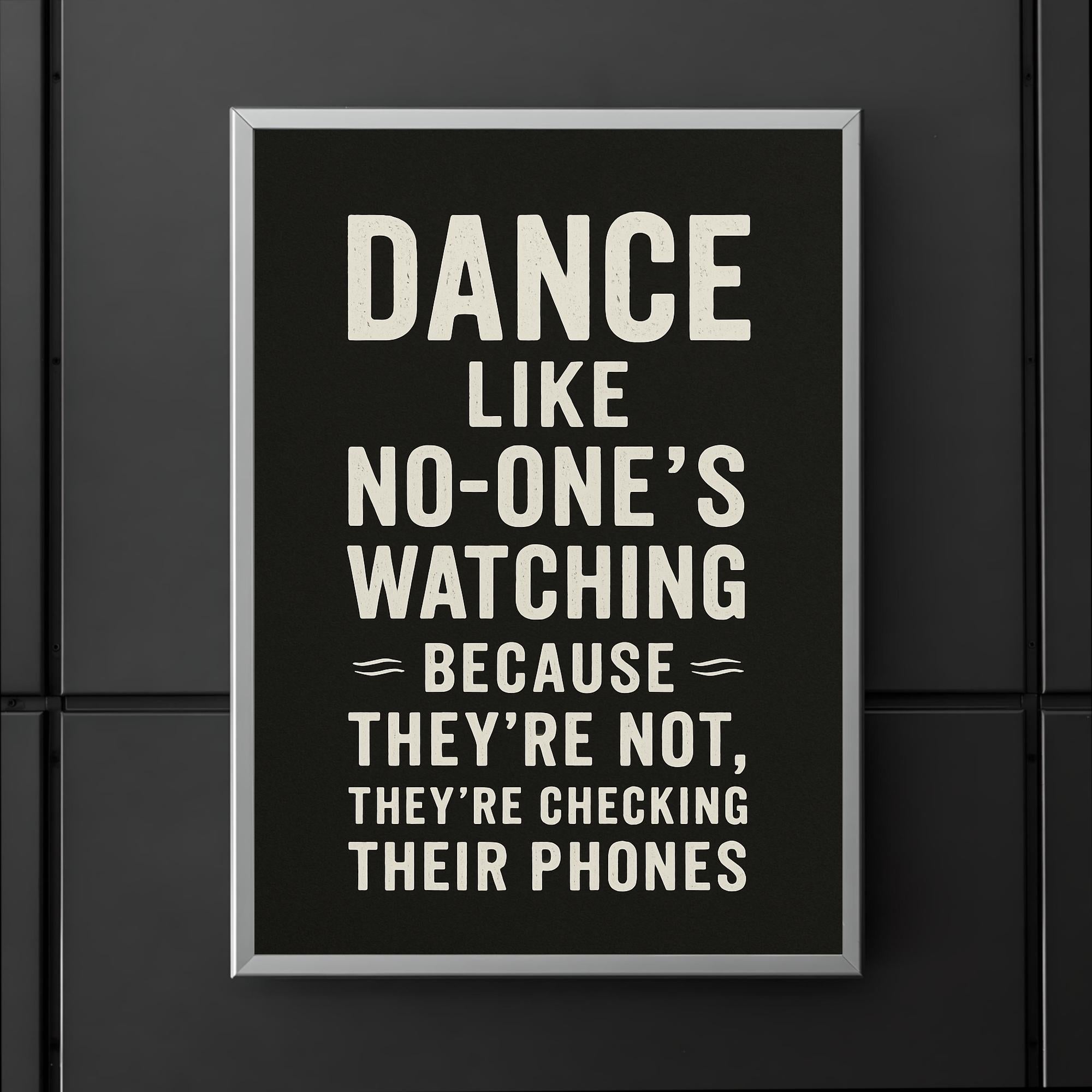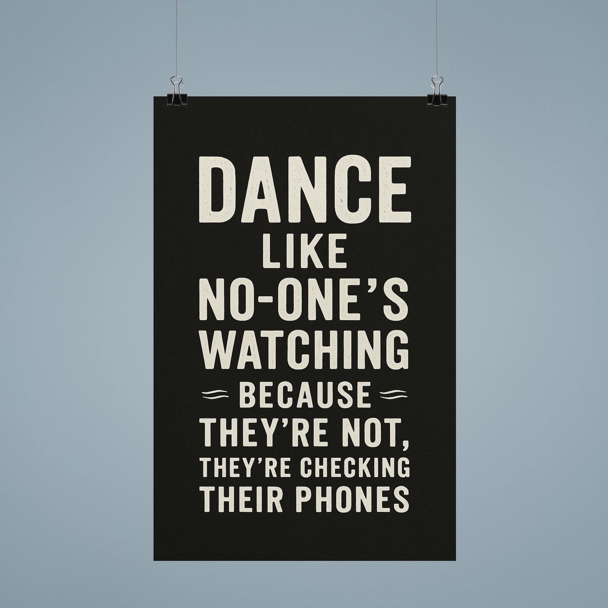 Ignite your space with a playful reminder to embrace your true self! This poster turns the classic advice on its head, encouraging you to dance freely—because honestly, everyone’s too busy staring at their phones. Perfect for living rooms, studios, or anywhere you need a burst of fun and freedom. Let it inspire confidence and a little cheeky humor every day!