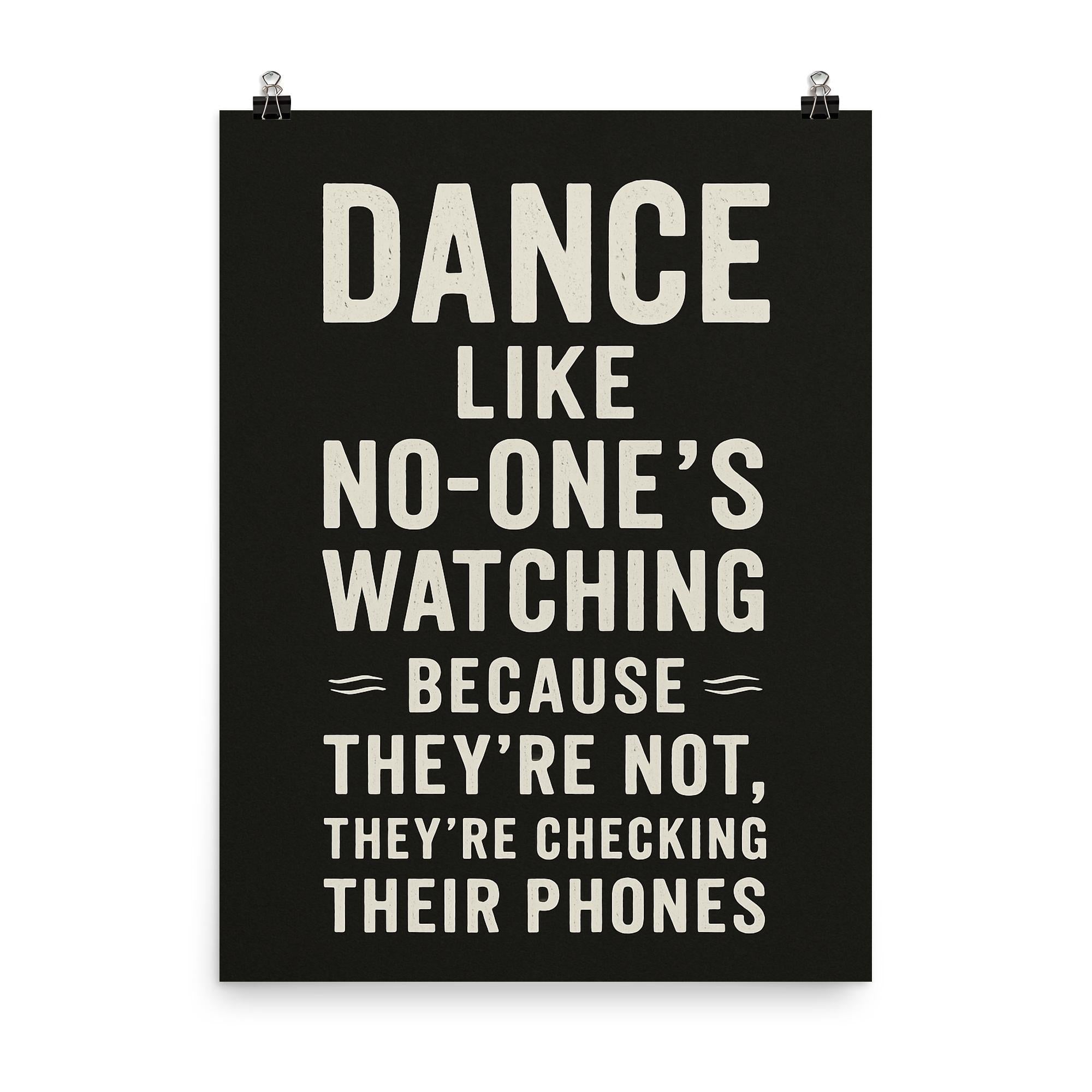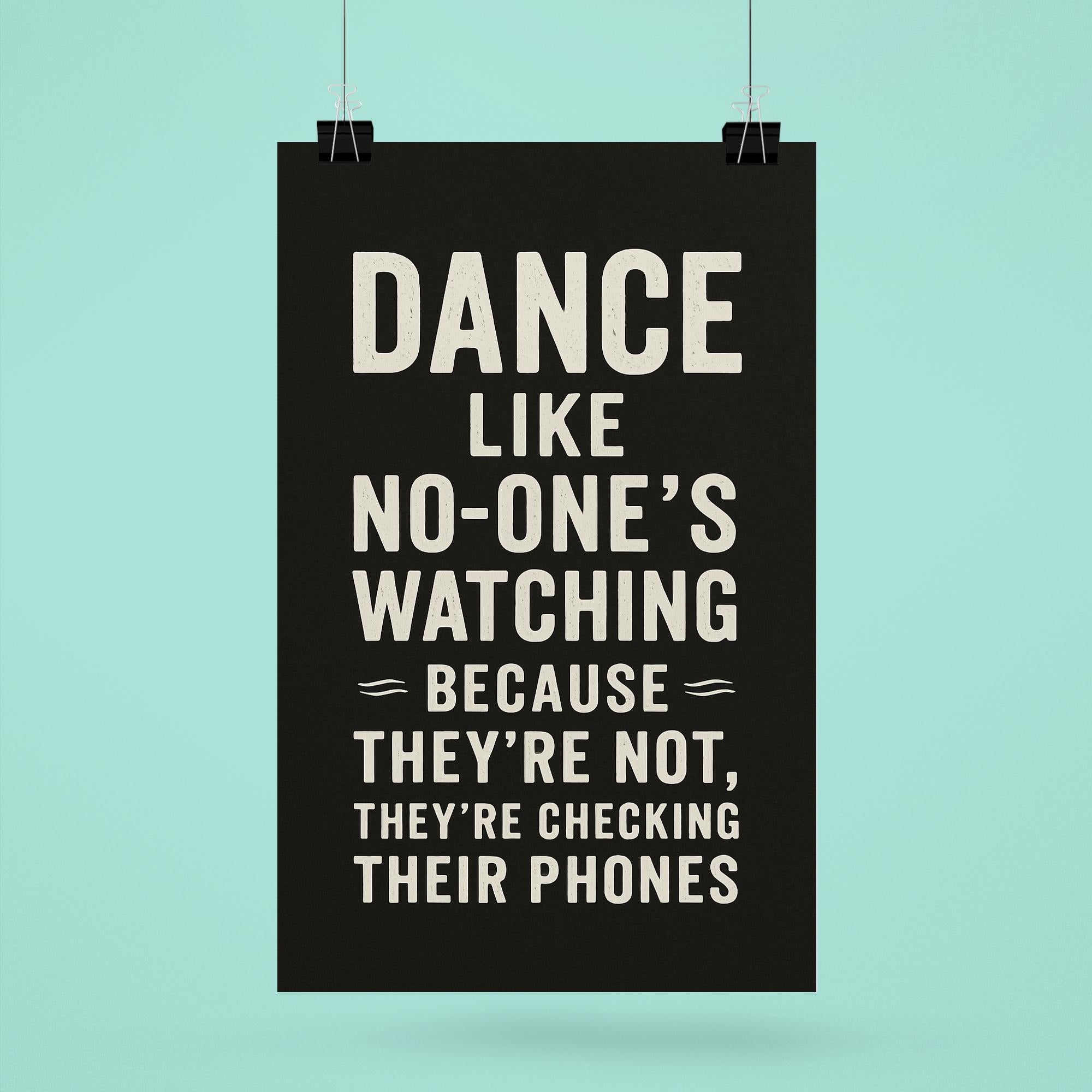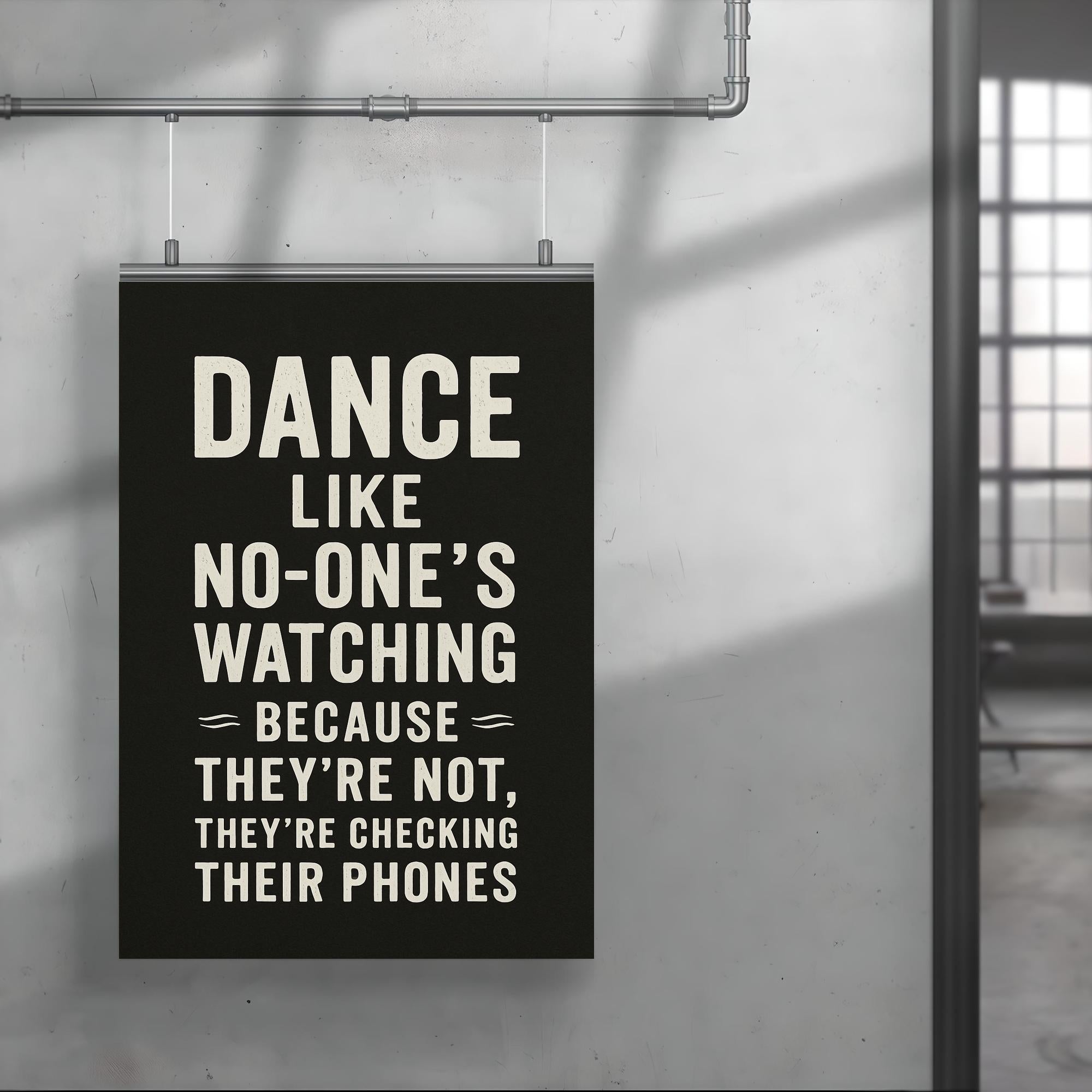 Ignite your space with a playful reminder to embrace your true self! This poster turns the classic advice on its head, encouraging you to dance freely—because honestly, everyone’s too busy staring at their phones. Perfect for living rooms, studios, or anywhere you need a burst of fun and freedom. Let it inspire confidence and a little cheeky humor every day!