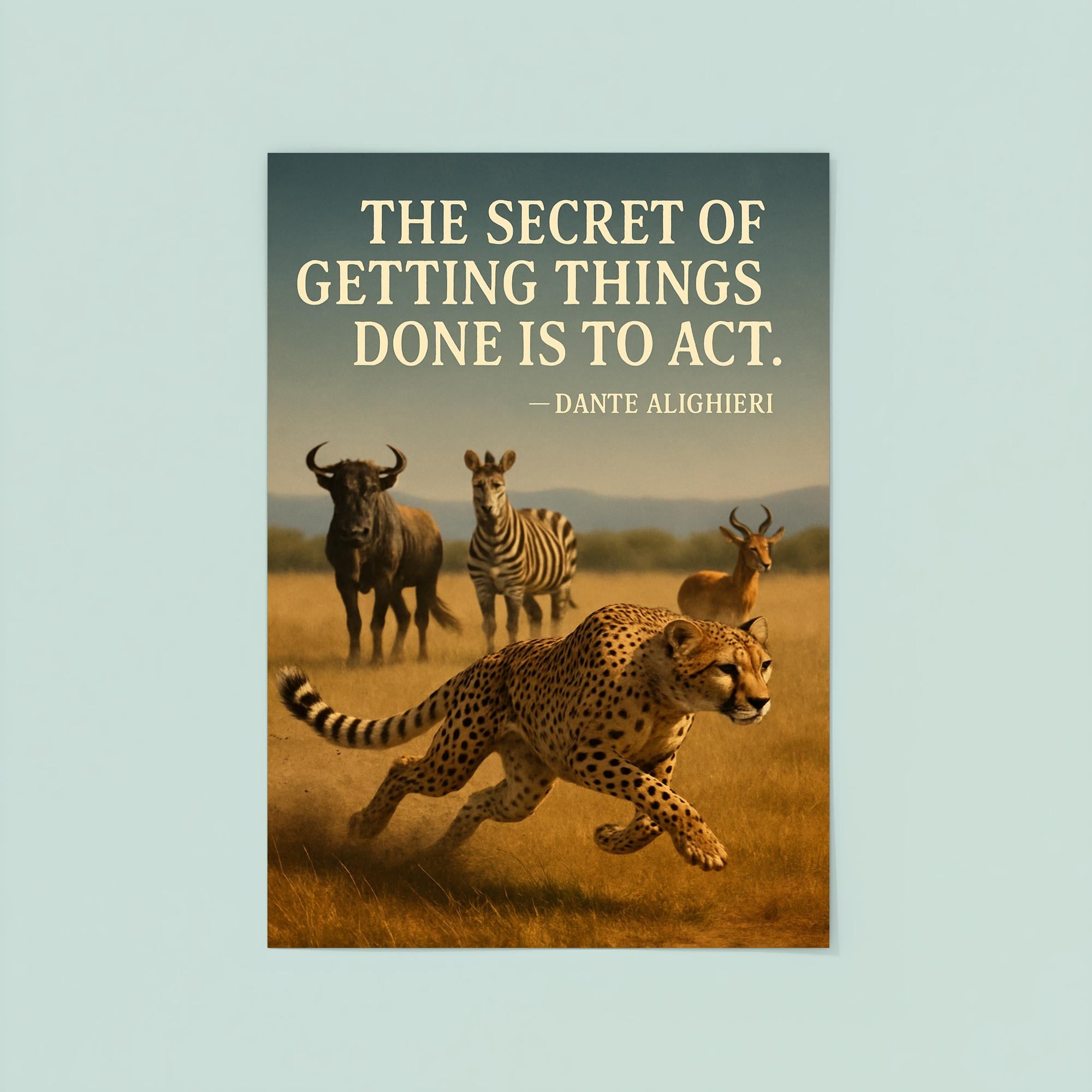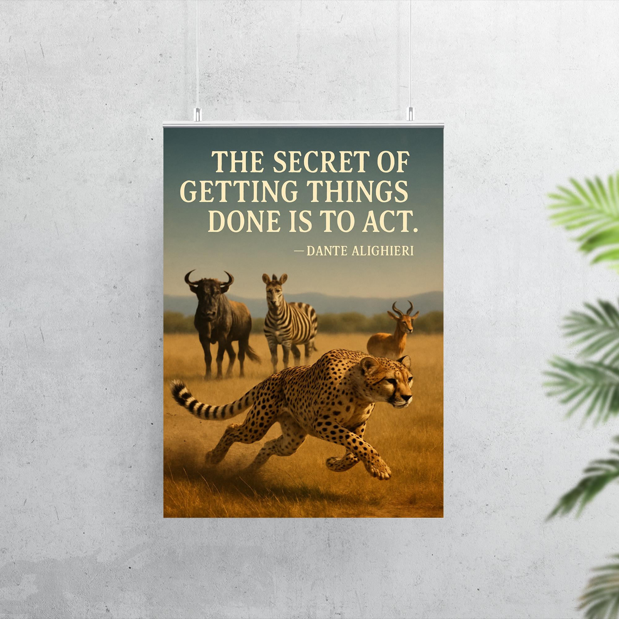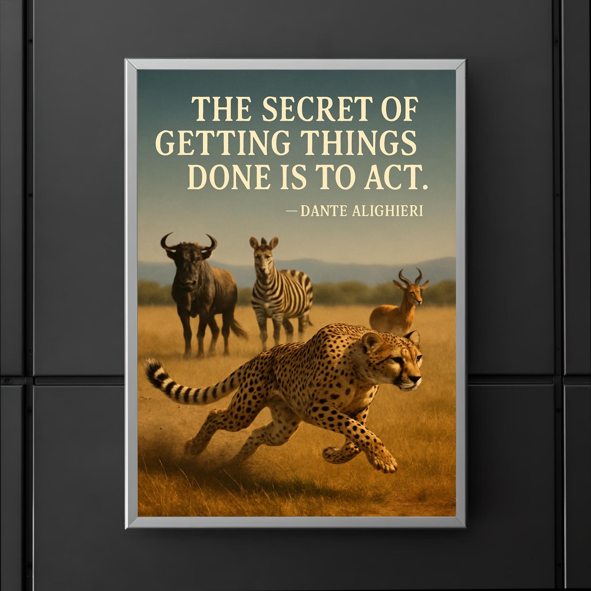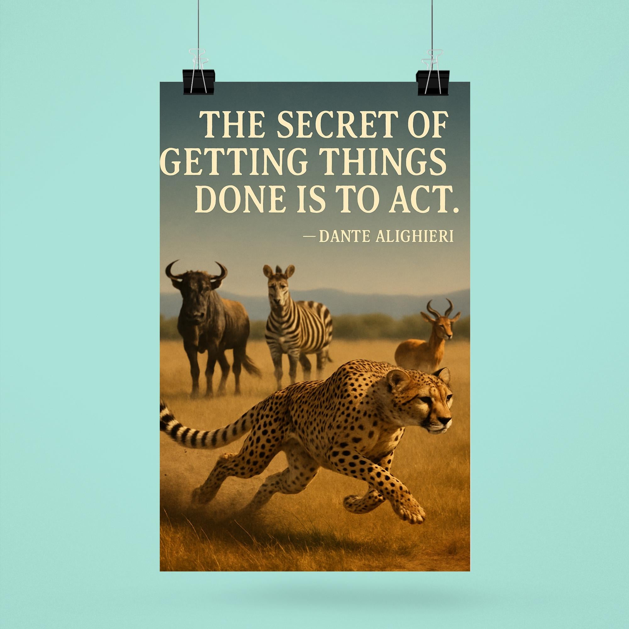 Capture the unstoppable spirit of ambition with this striking Dante Alighieri quote poster, paired perfectly with the dynamic energy of a cheetah in motion. Designed to inspire focus and determination, it’s a bold reminder to chase your goals with relentless speed and grace. Elevate your space with motivation that moves you forward every day.