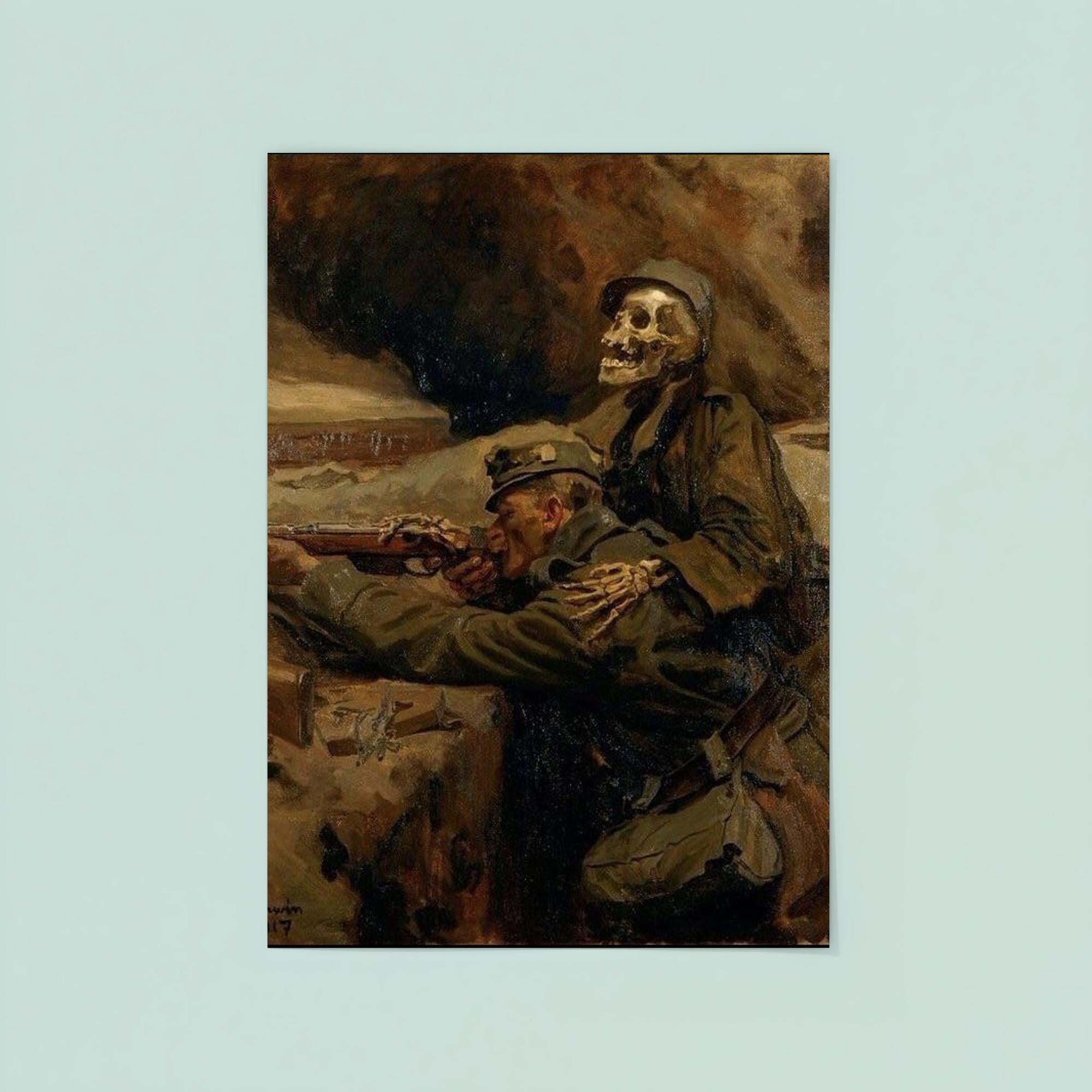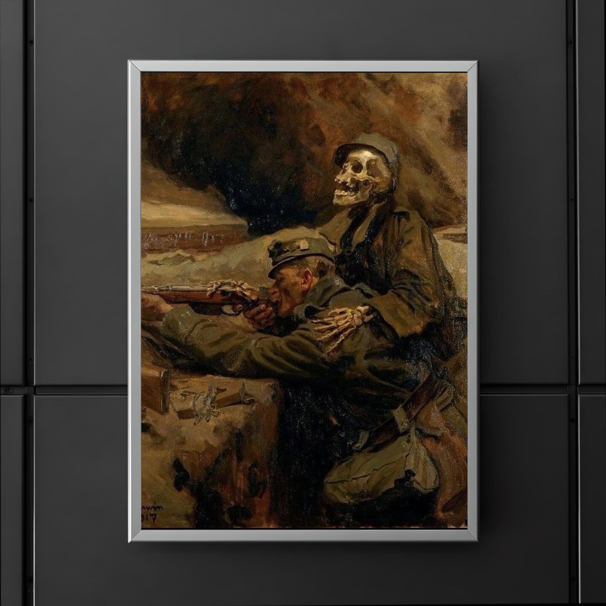 Capture a powerful moment in history with this striking poster of *Death and the Soldier* by Hans Larwin, created in 1917. This evocative piece offers a poignant glimpse into the profound themes of war and mortality, rendered with haunting intensity. Perfect for those who appreciate impactful art that tells a compelling story, it brings a timeless reminder of sacrifice and the human condition to any space.