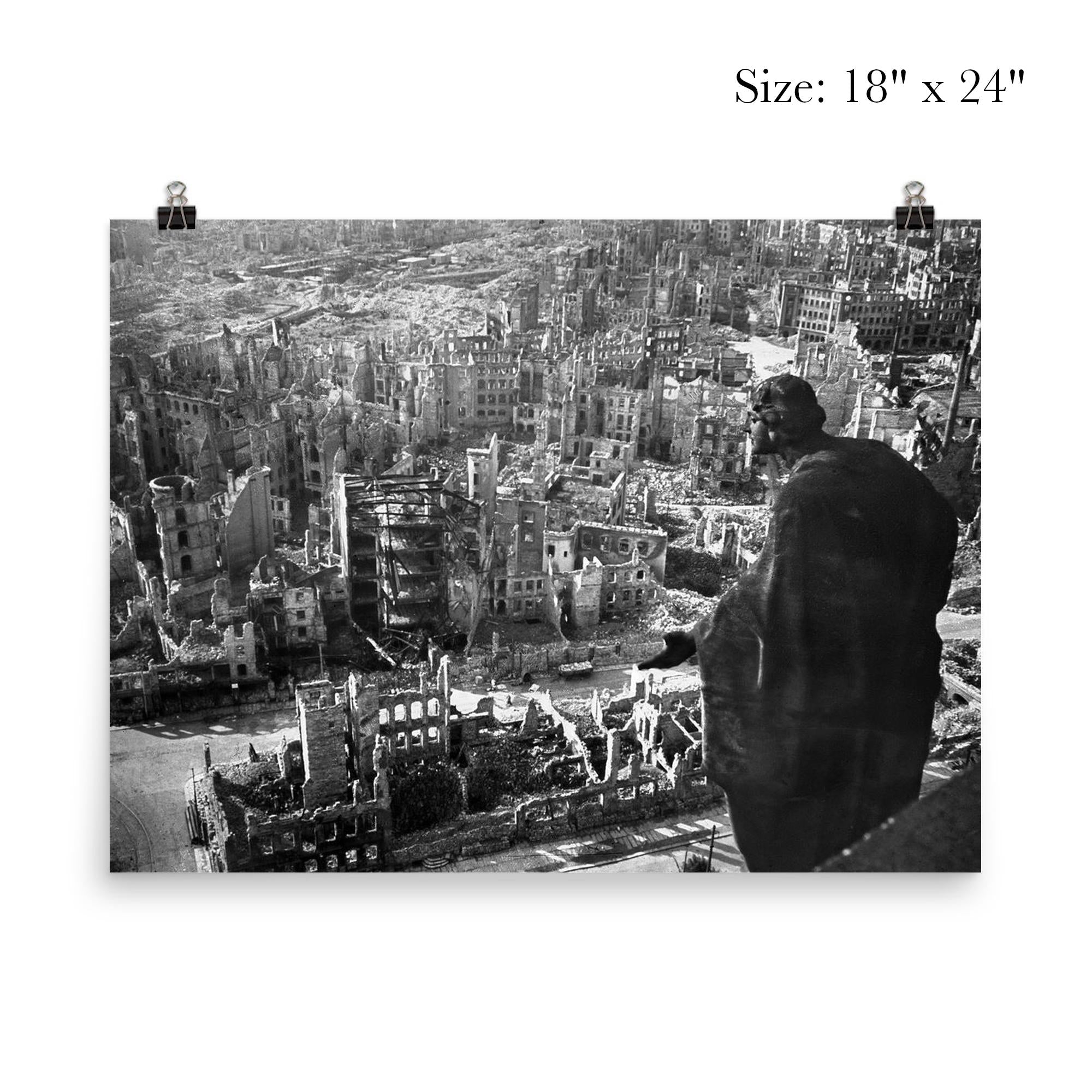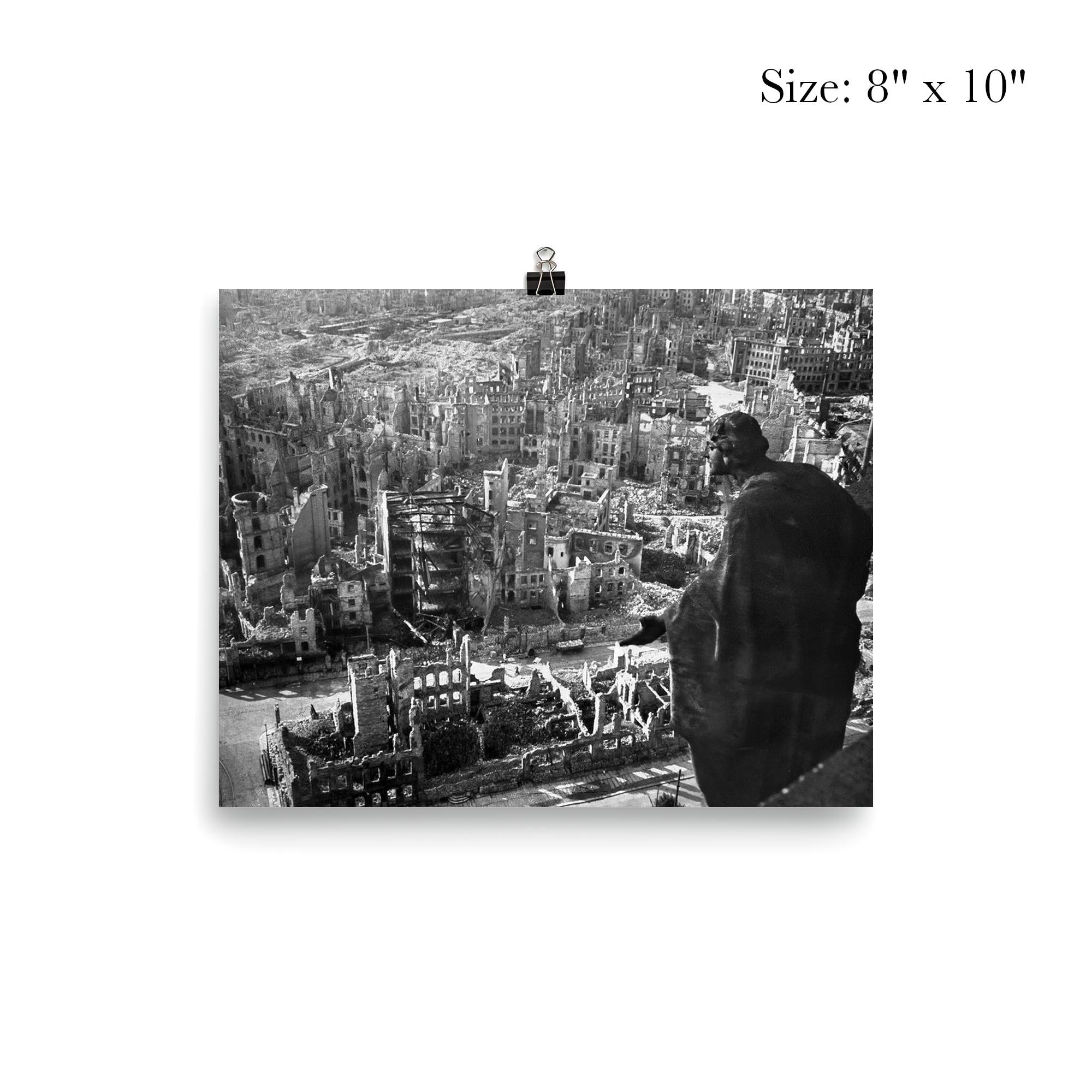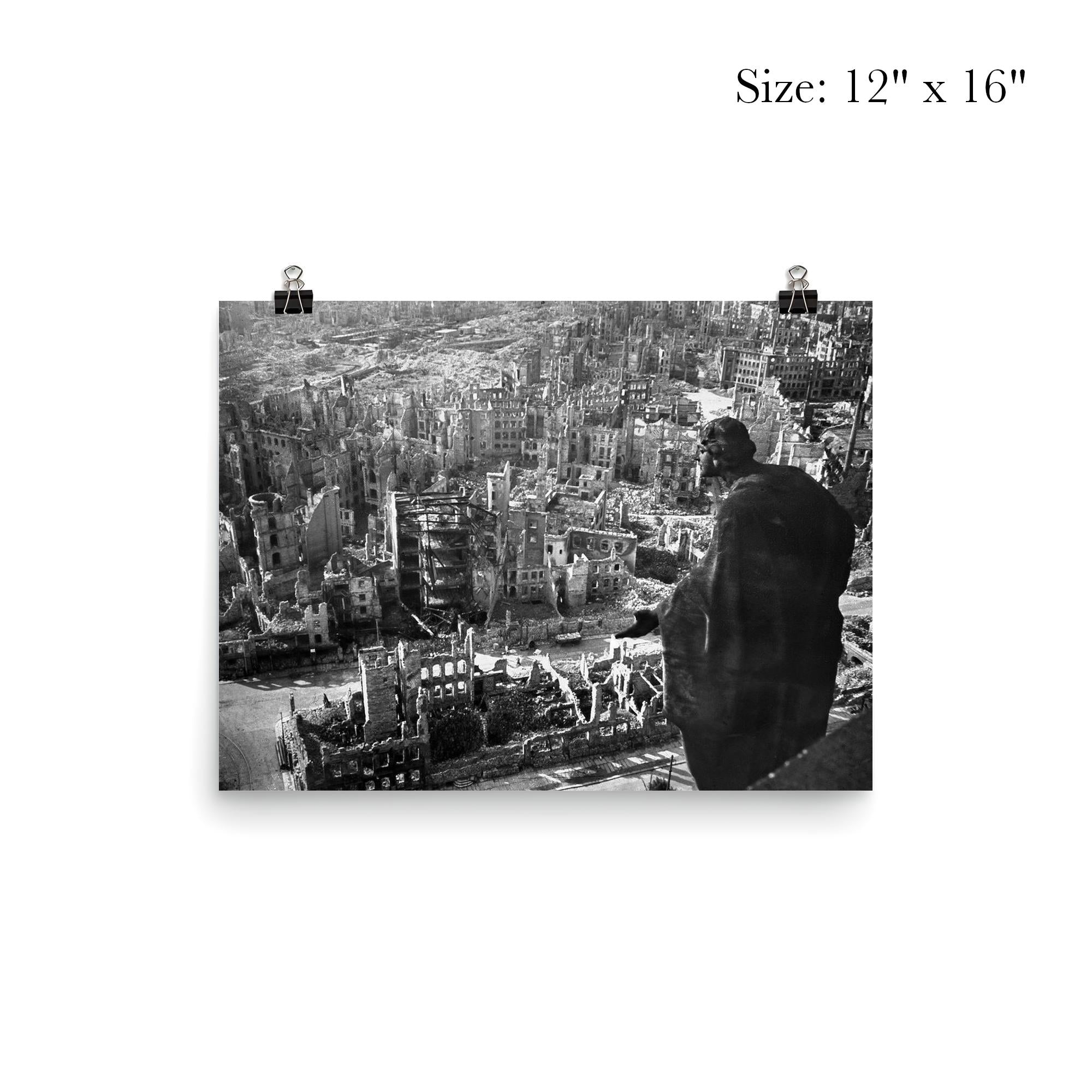 Capture a profound moment in history with this striking poster of Destruction in Old Town Dresden, taken from the Town Hall Tower on 15 February 1945. The image powerfully conveys the scale of devastation endured during that fateful night, inviting reflection on resilience amid destruction. Perfect for history enthusiasts and collectors, this poster serves as a solemn reminder of the past and a tribute to the enduring spirit of Dresden.