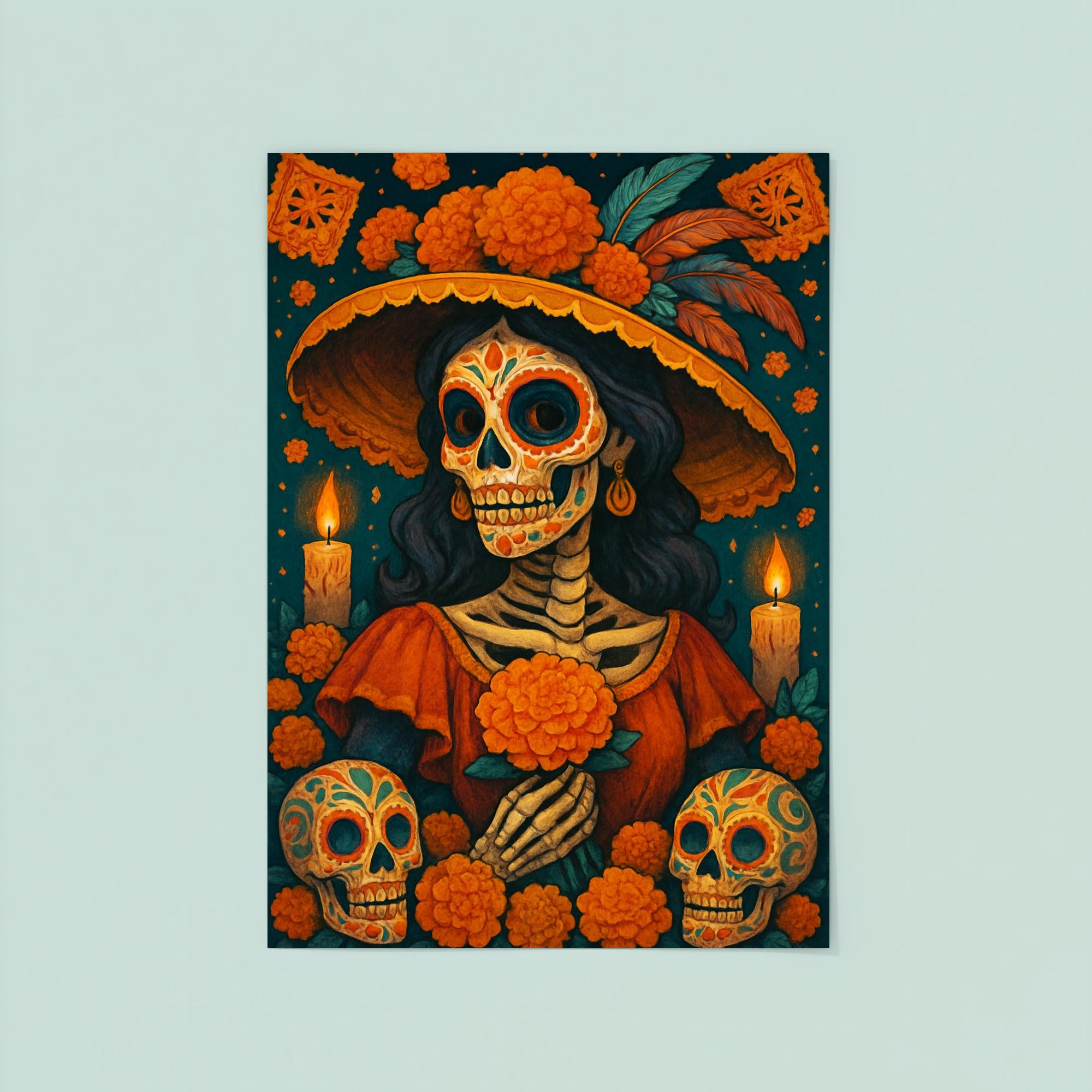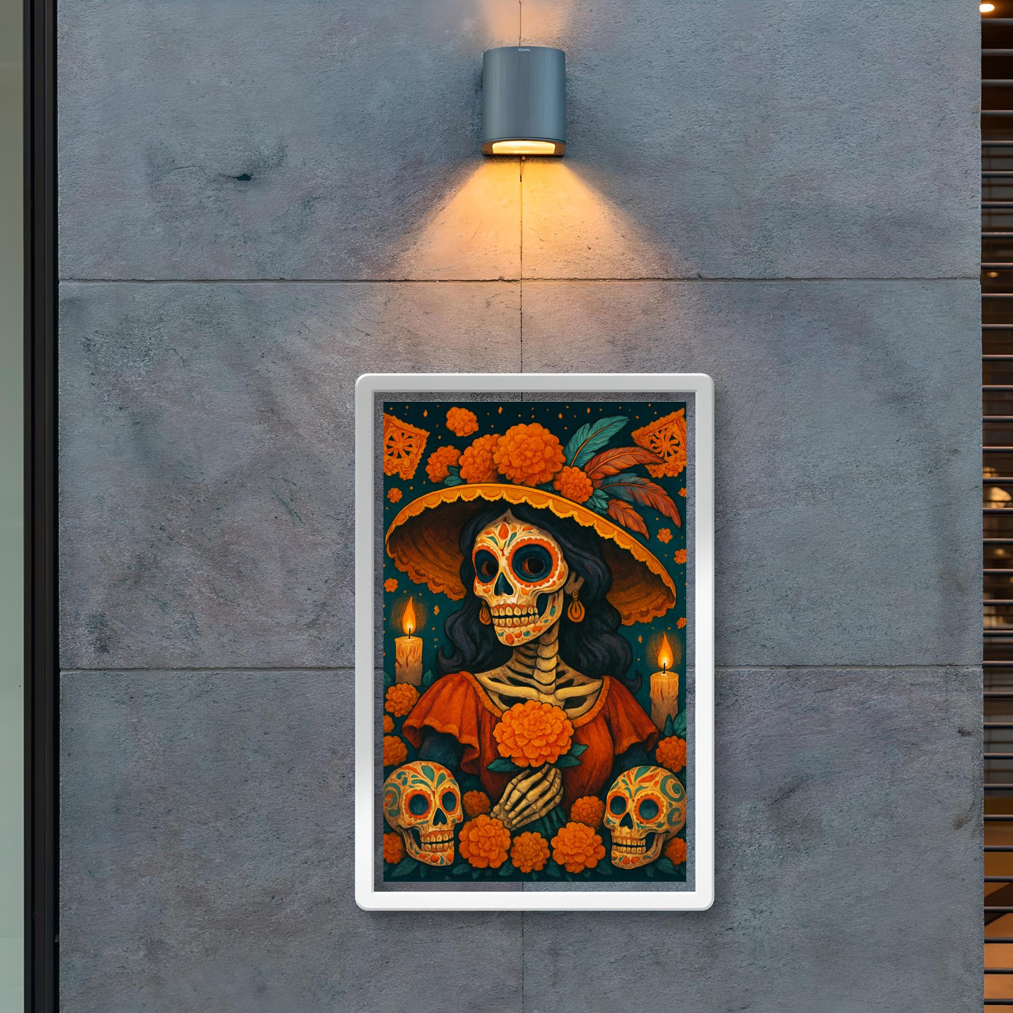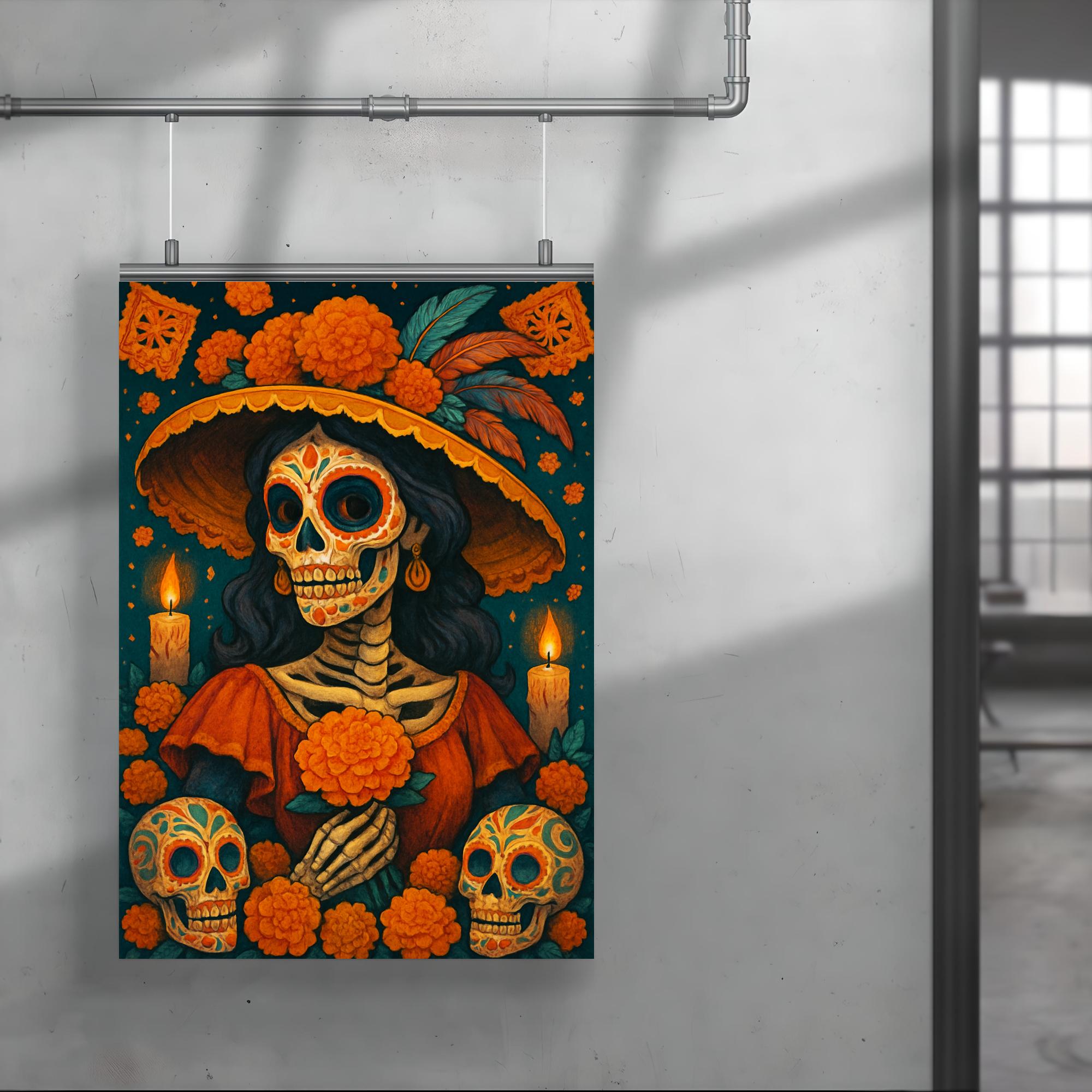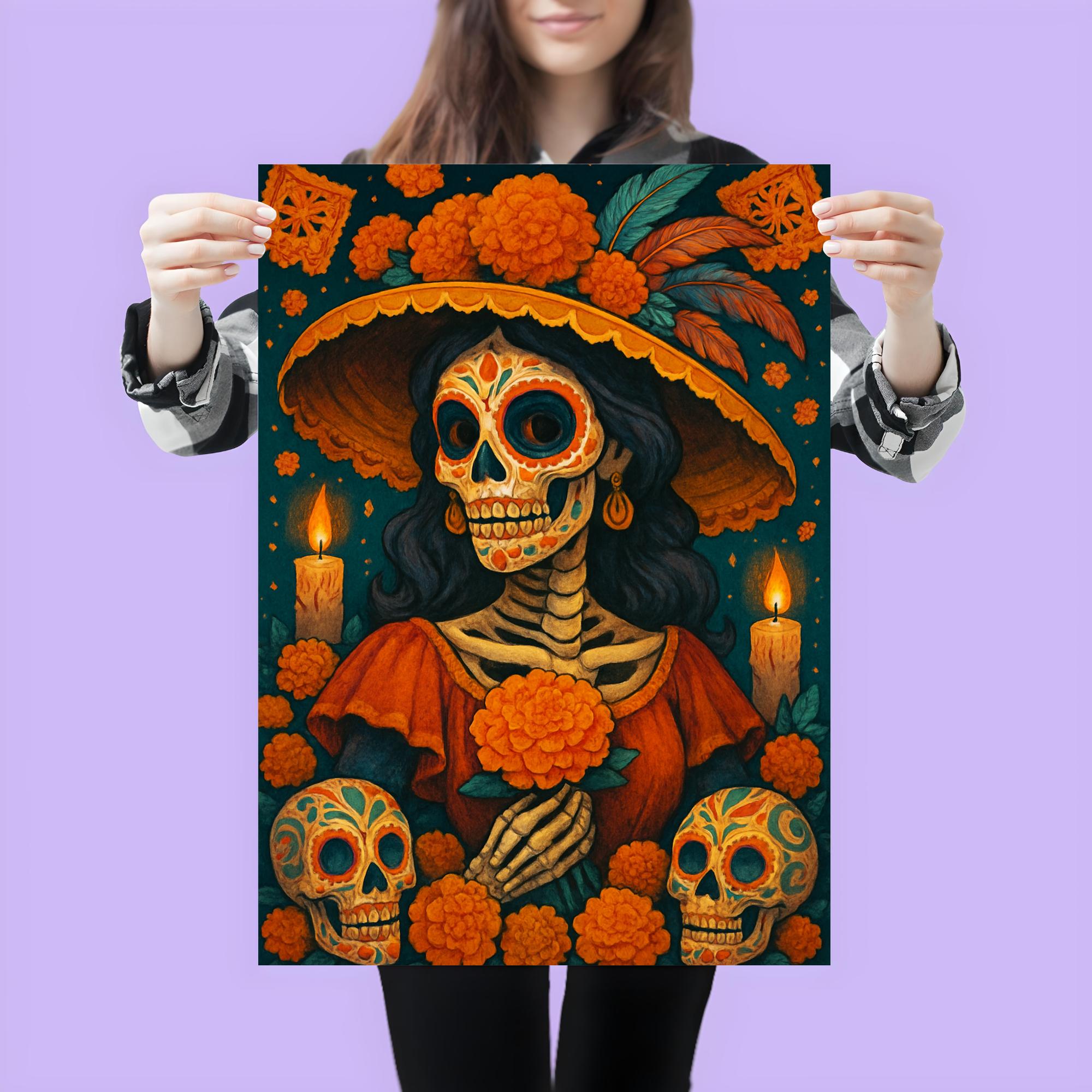 Celebrate the vibrant spirit of Dia de Muertos with this stunning poster that honors tradition and remembrance. Perfect for adding a heartfelt touch to your space, it captures the essence of this cherished Mexican holiday with rich cultural significance. Bring color, meaning, and celebration to your home or event with this beautiful tribute to life and memory.