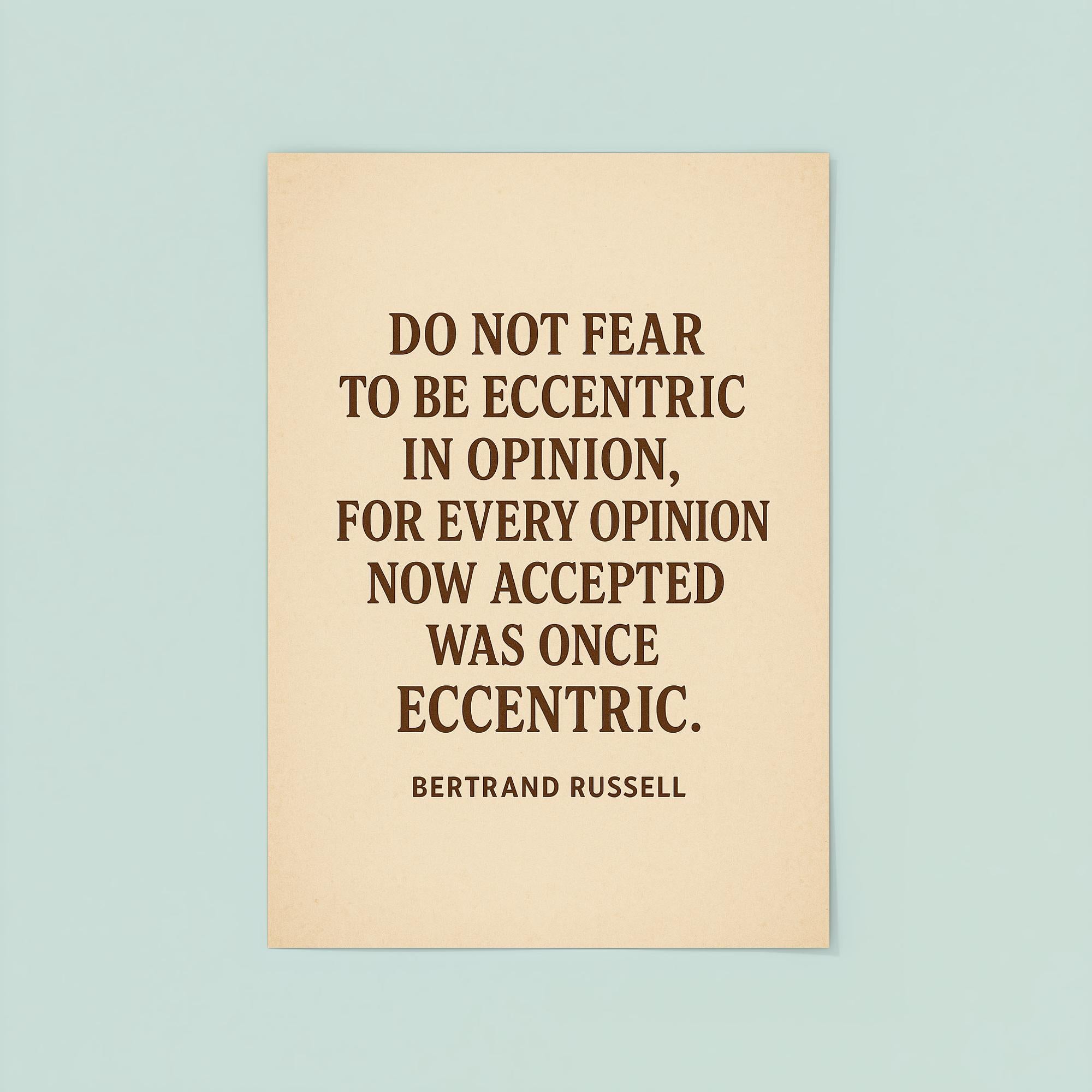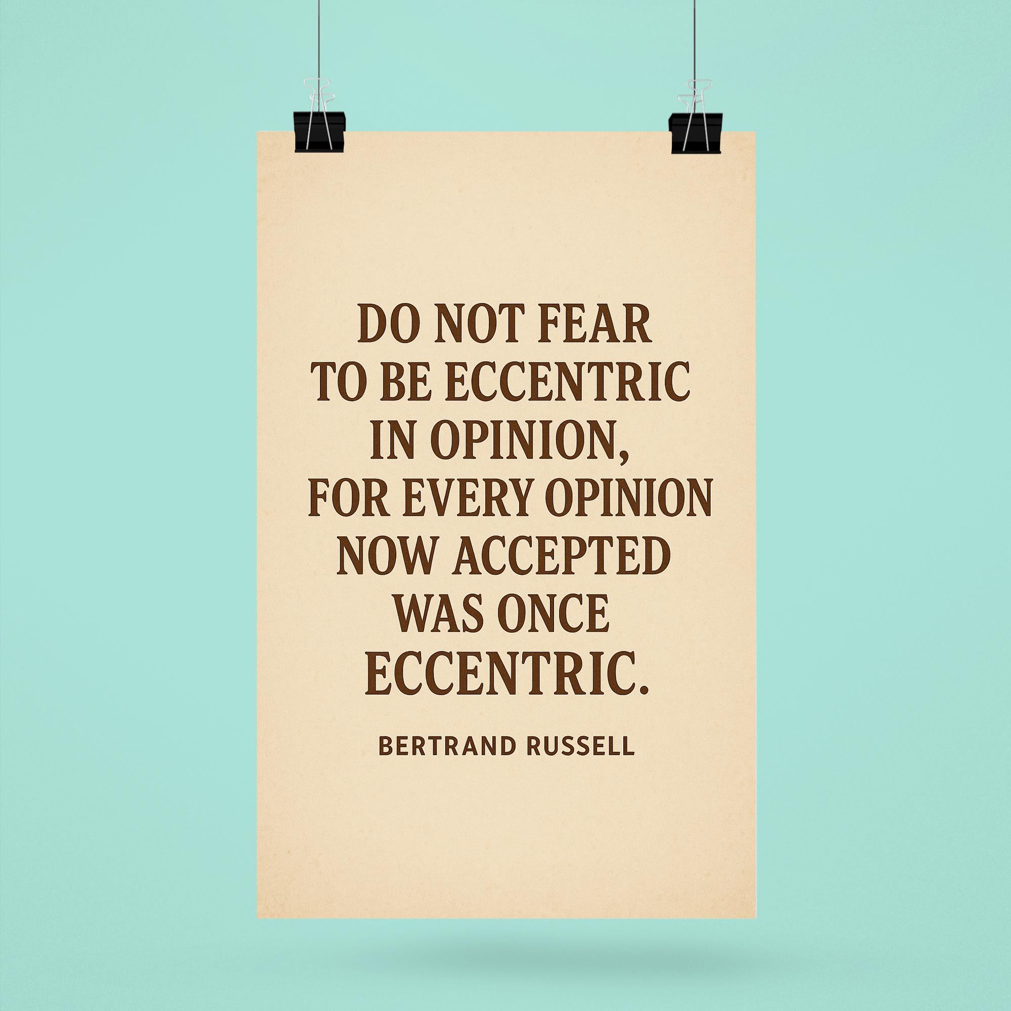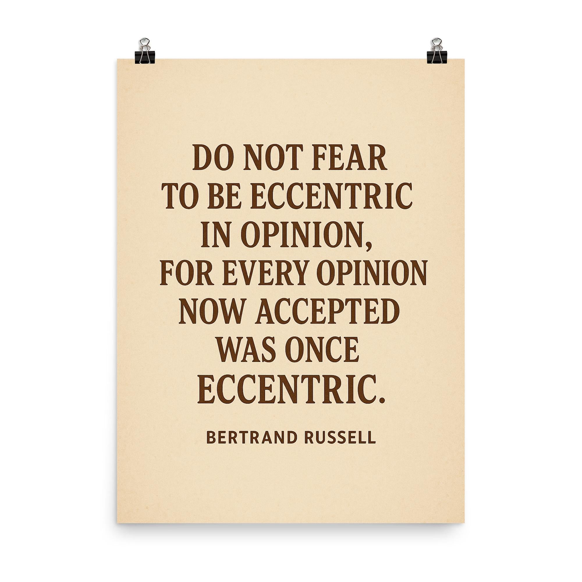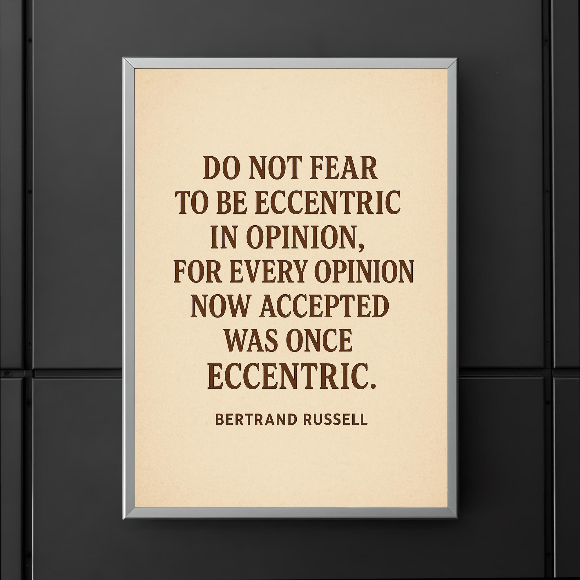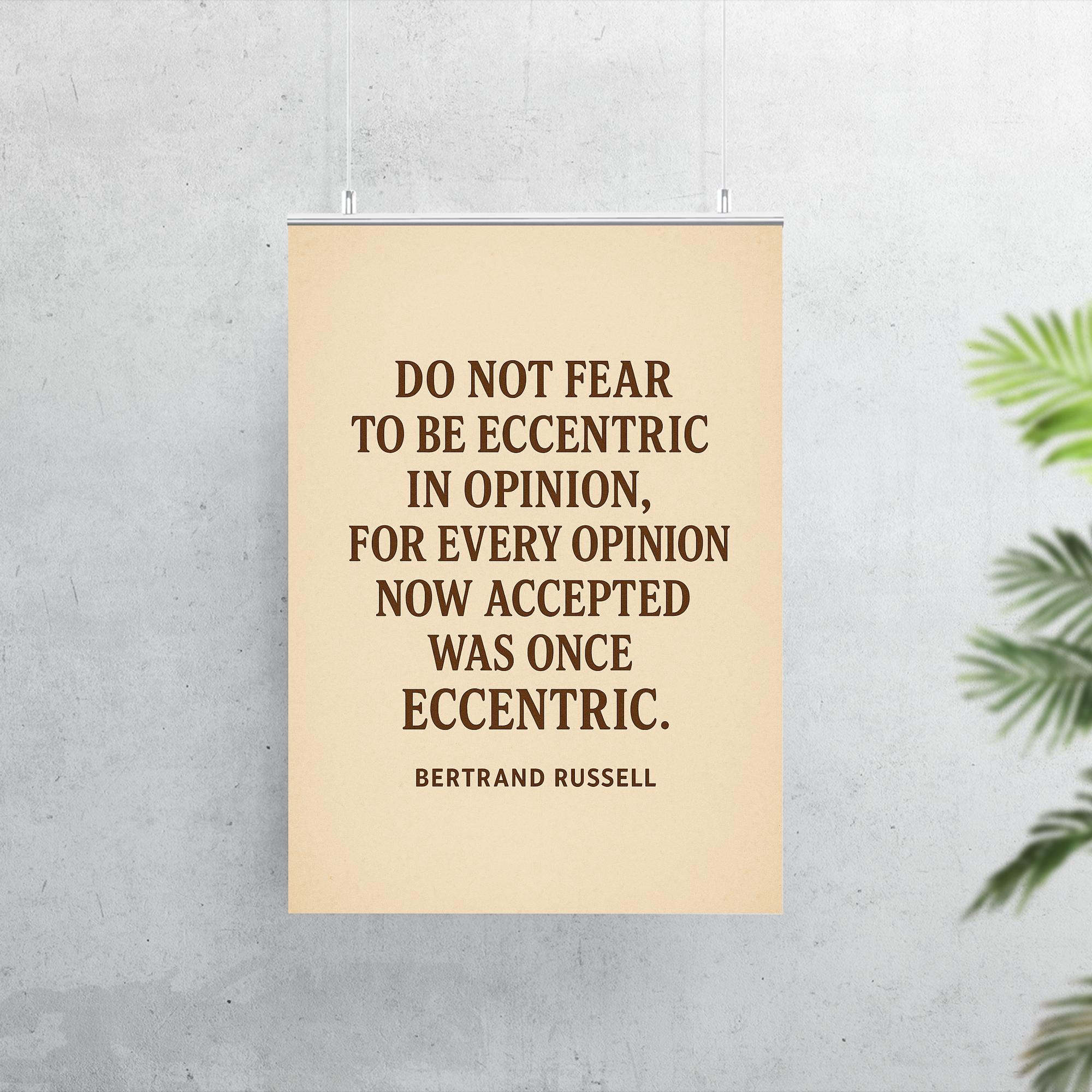 Invite bold thinking into your space with this powerful Bertrand Russell quote: “Do not fear to be eccentric in opinion for every opinion now accepted was once eccentric.” A daily reminder that every groundbreaking idea was once unconventional, this poster inspires you—at home, at work, or in class—to stand by your unique voice and embrace originality. Empower yourself or someone you care for to think courageously and never shy away from new perspectives.