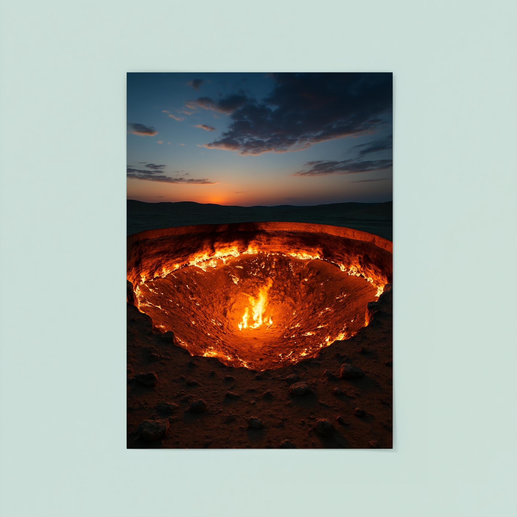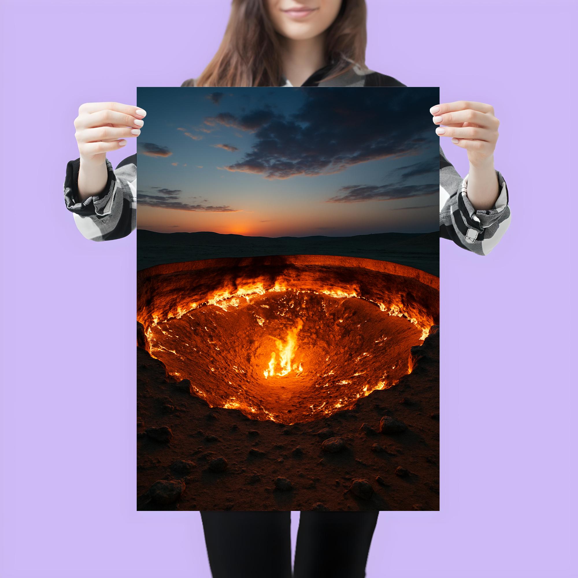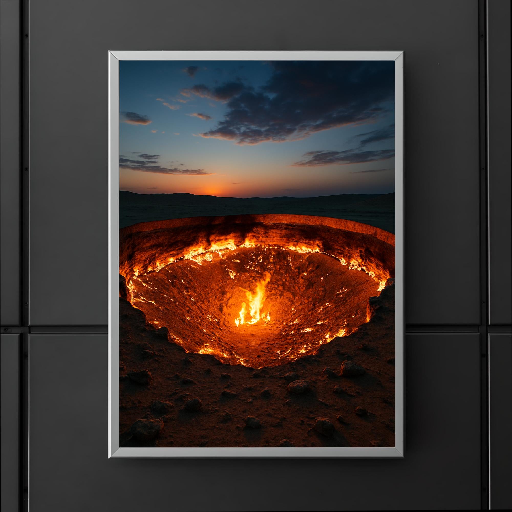 Ignite your space with the awe-inspiring Door to Hell poster, capturing the raw power and mystery of Darvaza, Turkmenistan’s legendary burning crater. This striking image brings the hypnotic flames and otherworldly glow of a natural wonder straight to your walls, perfect for adventurers and dreamers alike. Let the eternal fire spark your imagination every day.