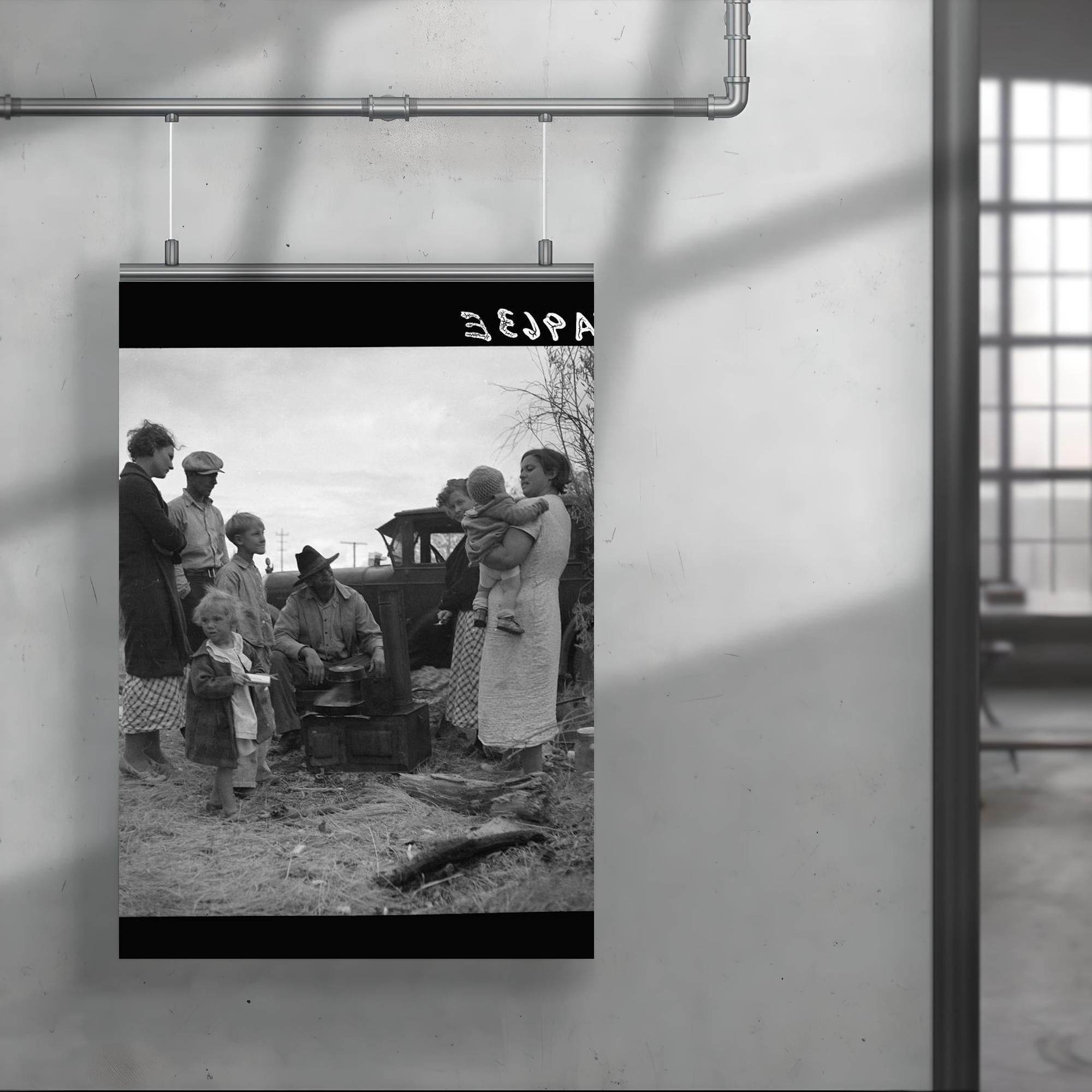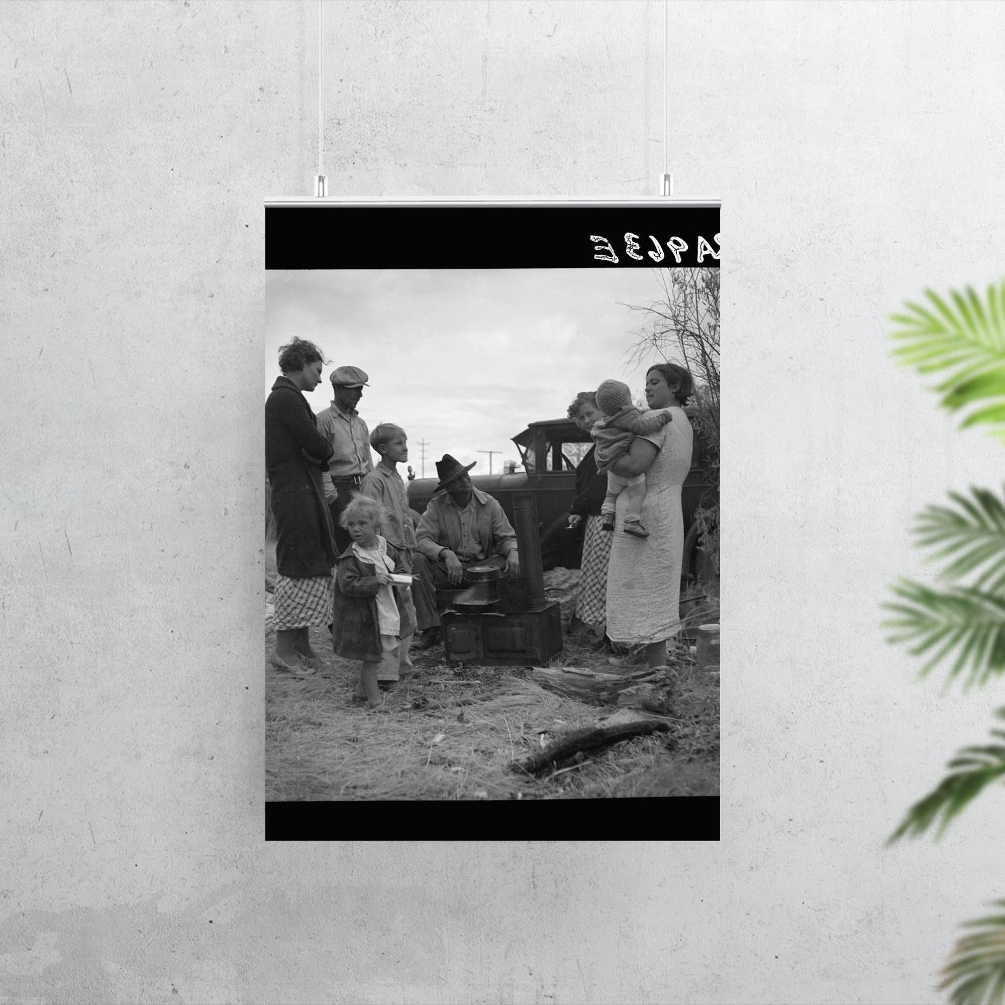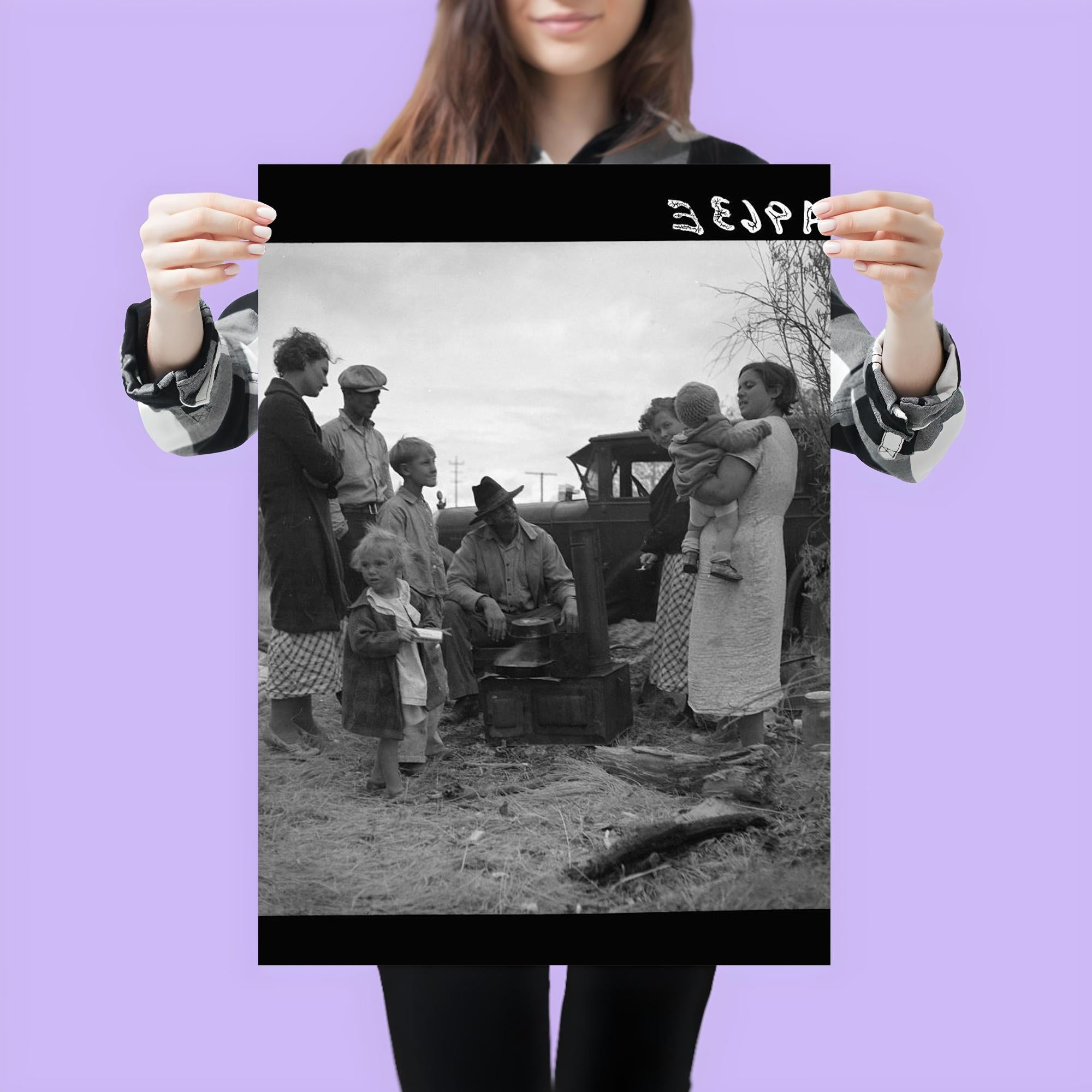 Capture a powerful moment in history with this striking poster featuring Dorothea Lange’s iconic image of Dust Bowl refugees along a highway near Bakersfield, California. The raw emotion and resilience etched on their faces evoke a poignant story of struggle and hope during a challenging era. Perfect for history enthusiasts and art lovers alike, this poster brings a timeless narrative into your space with unforgettable impact.
