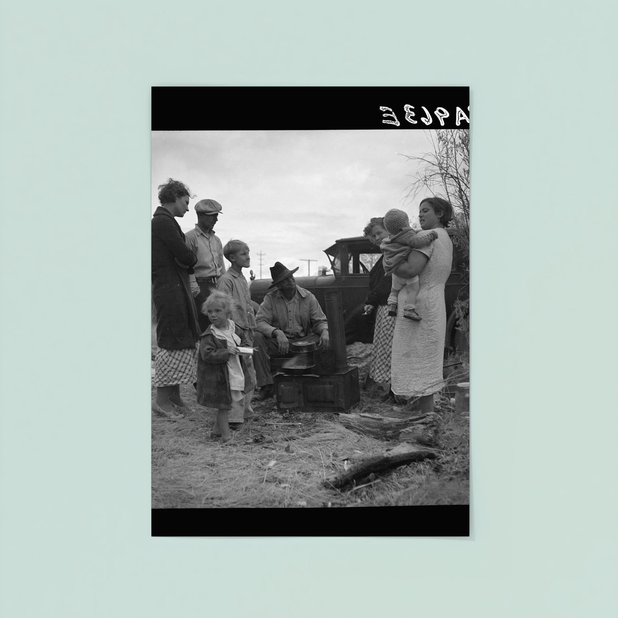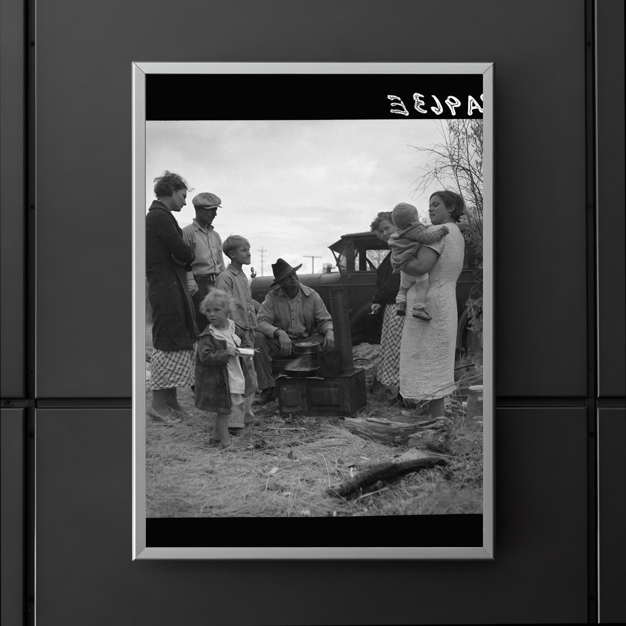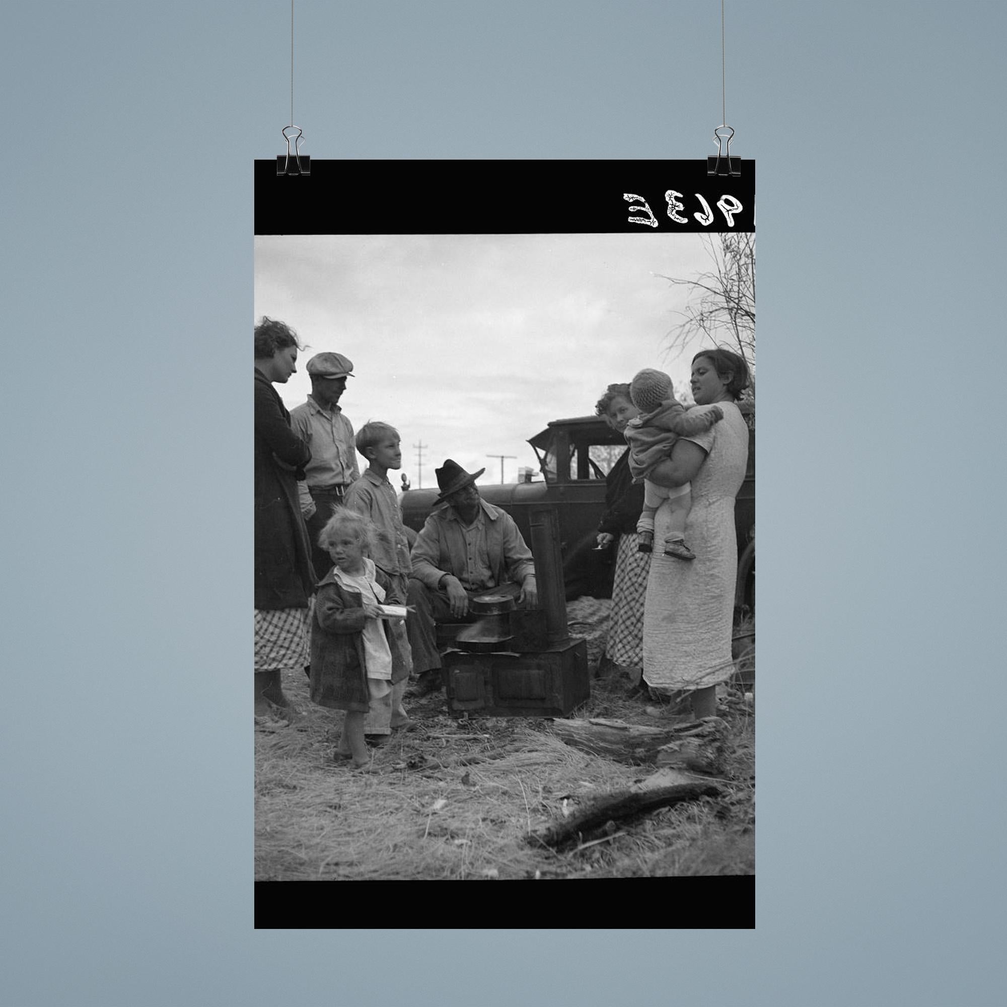 Capture a powerful moment in history with this striking poster featuring Dorothea Lange’s iconic image of Dust Bowl refugees along a highway near Bakersfield, California. The raw emotion and resilience etched on their faces evoke a poignant story of struggle and hope during a challenging era. Perfect for history enthusiasts and art lovers alike, this poster brings a timeless narrative into your space with unforgettable impact.