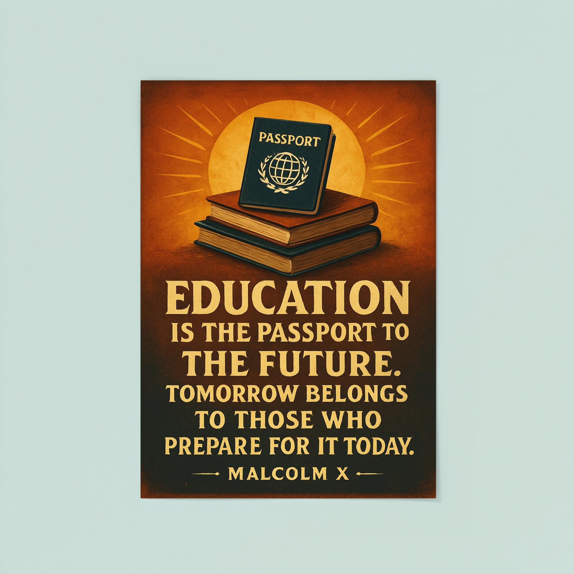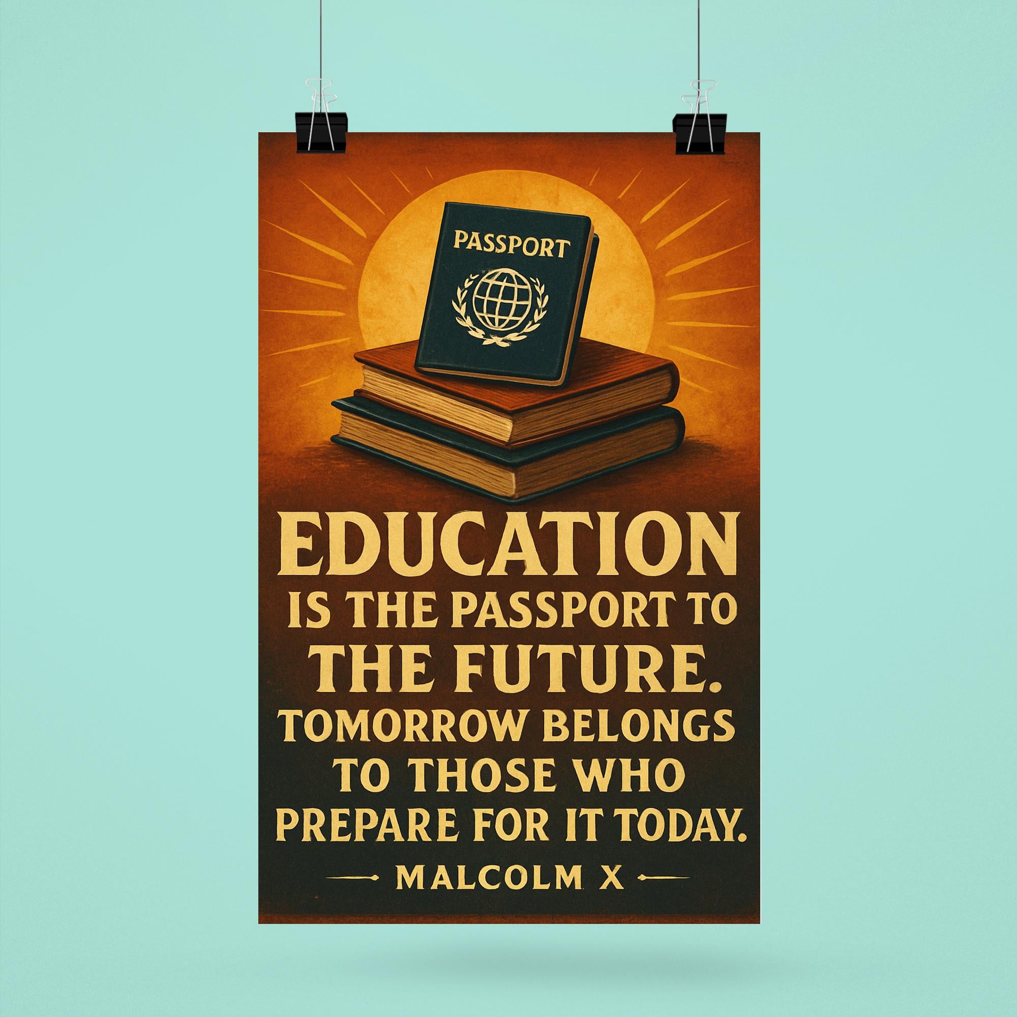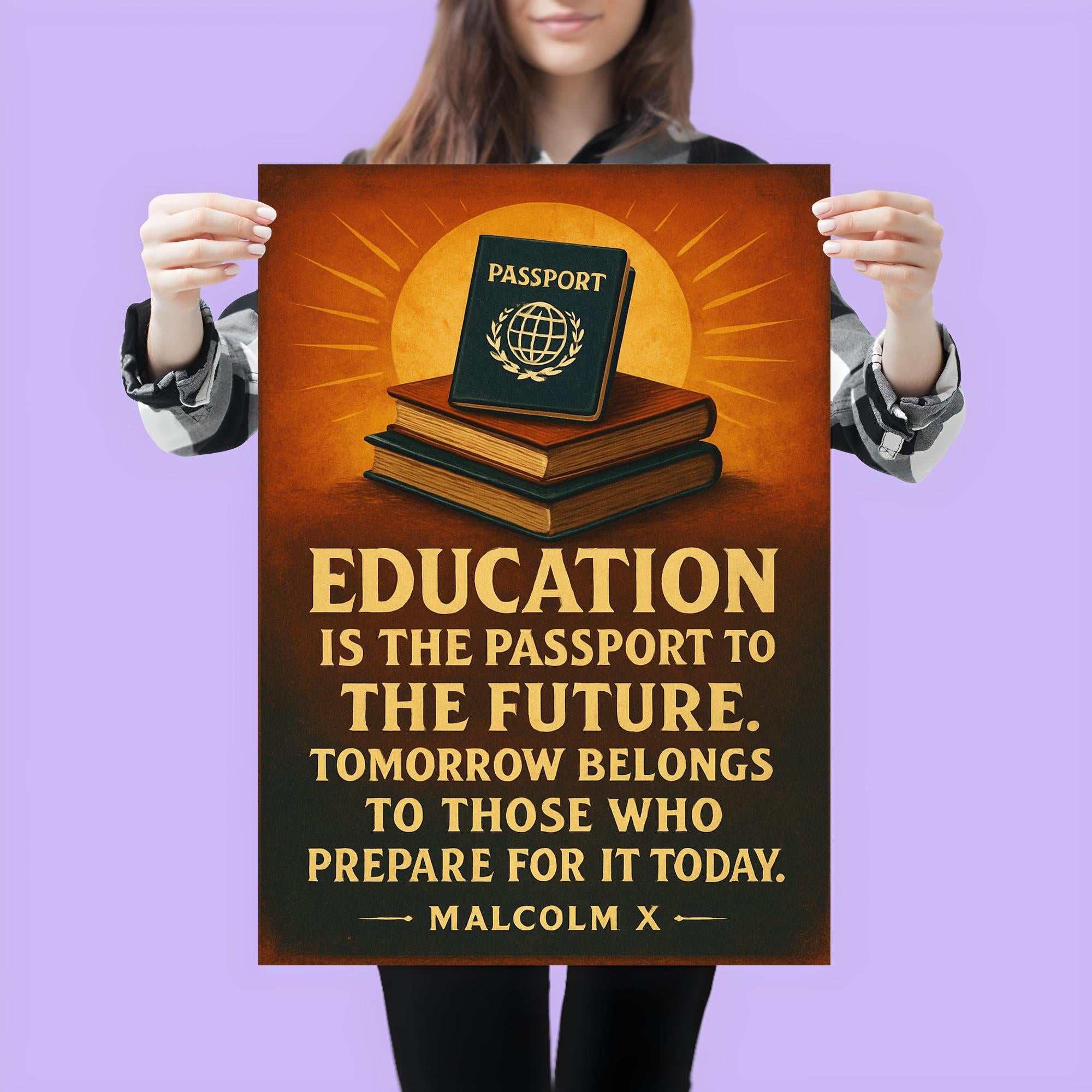 Inspire daily motivation with this powerful poster featuring Malcolm X’s timeless quote: “Education is the passport to the future.” Perfect for classrooms, offices, or personal spaces, it serves as a constant reminder of the transformative power of learning and the boundless opportunities it unlocks. Elevate your environment and fuel your ambition with a message that resonates far beyond the walls.