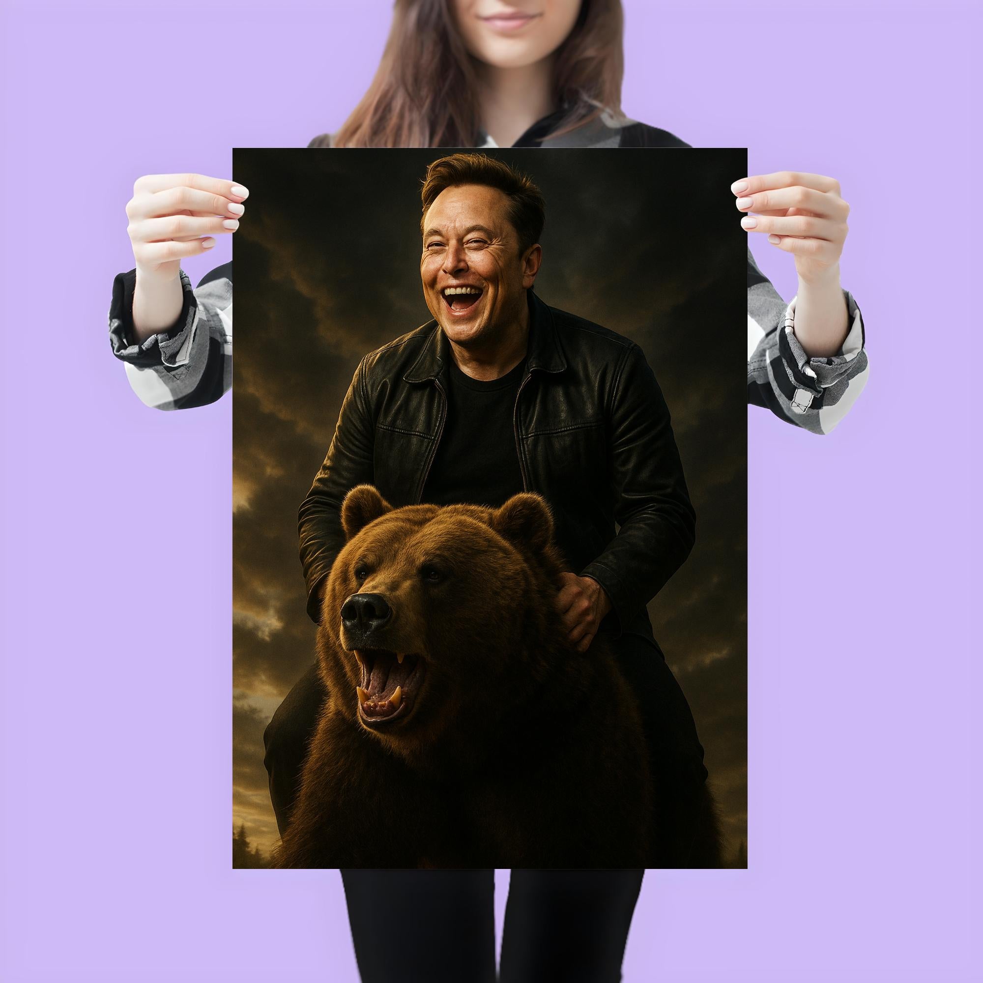 Unleash the spirit of bold innovation with this striking poster featuring Elon Musk astride a powerful grizzly bear. It’s a dynamic blend of fearless ambition and raw nature, perfect for inspiring visionaries who dare to challenge the impossible. Make your space a testament to unstoppable drive and daring adventure.