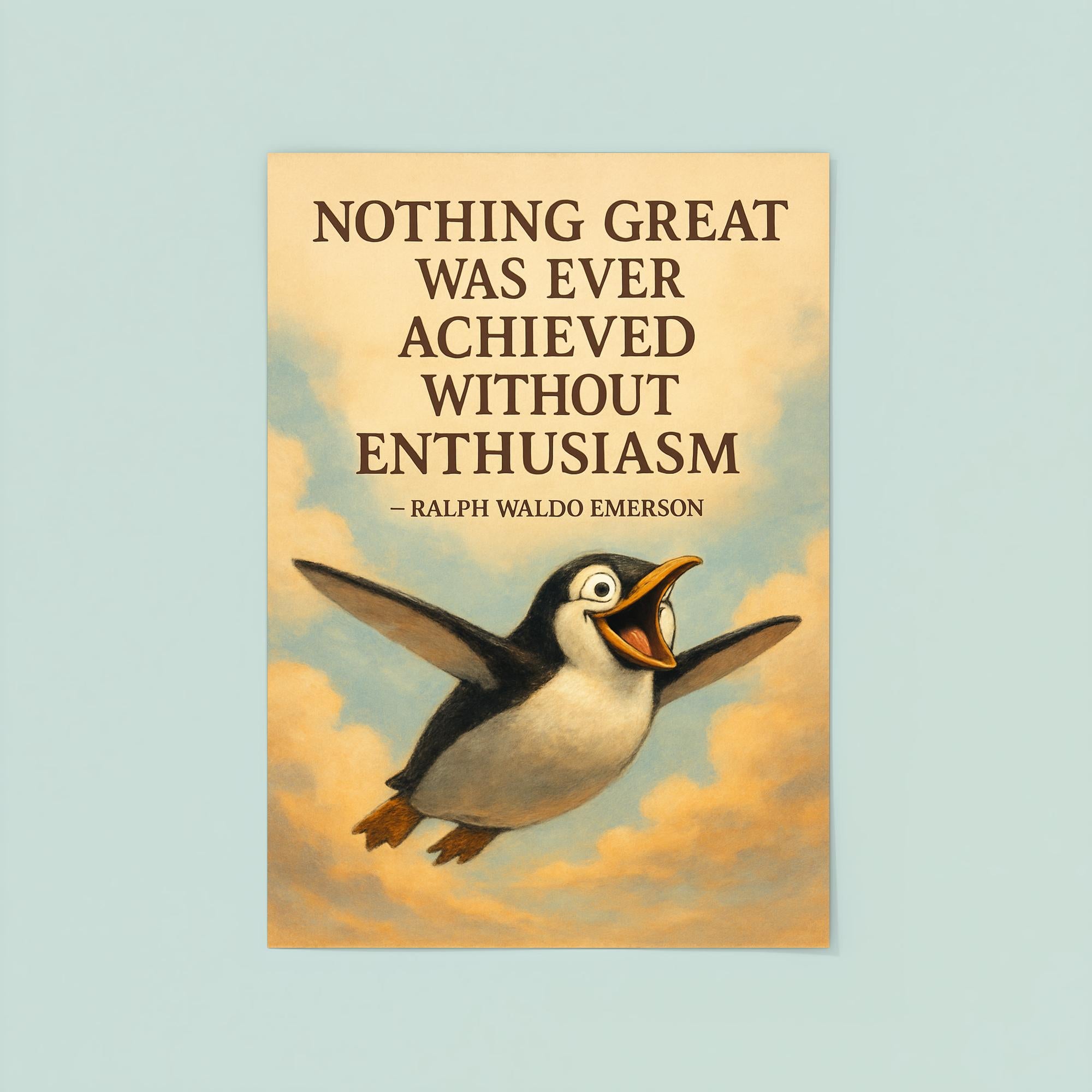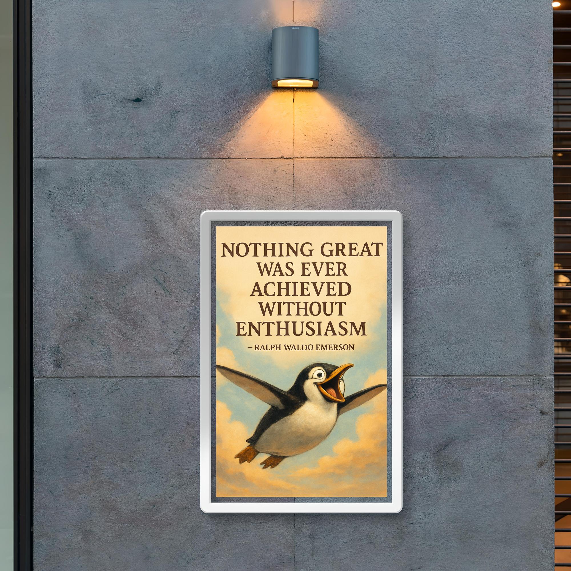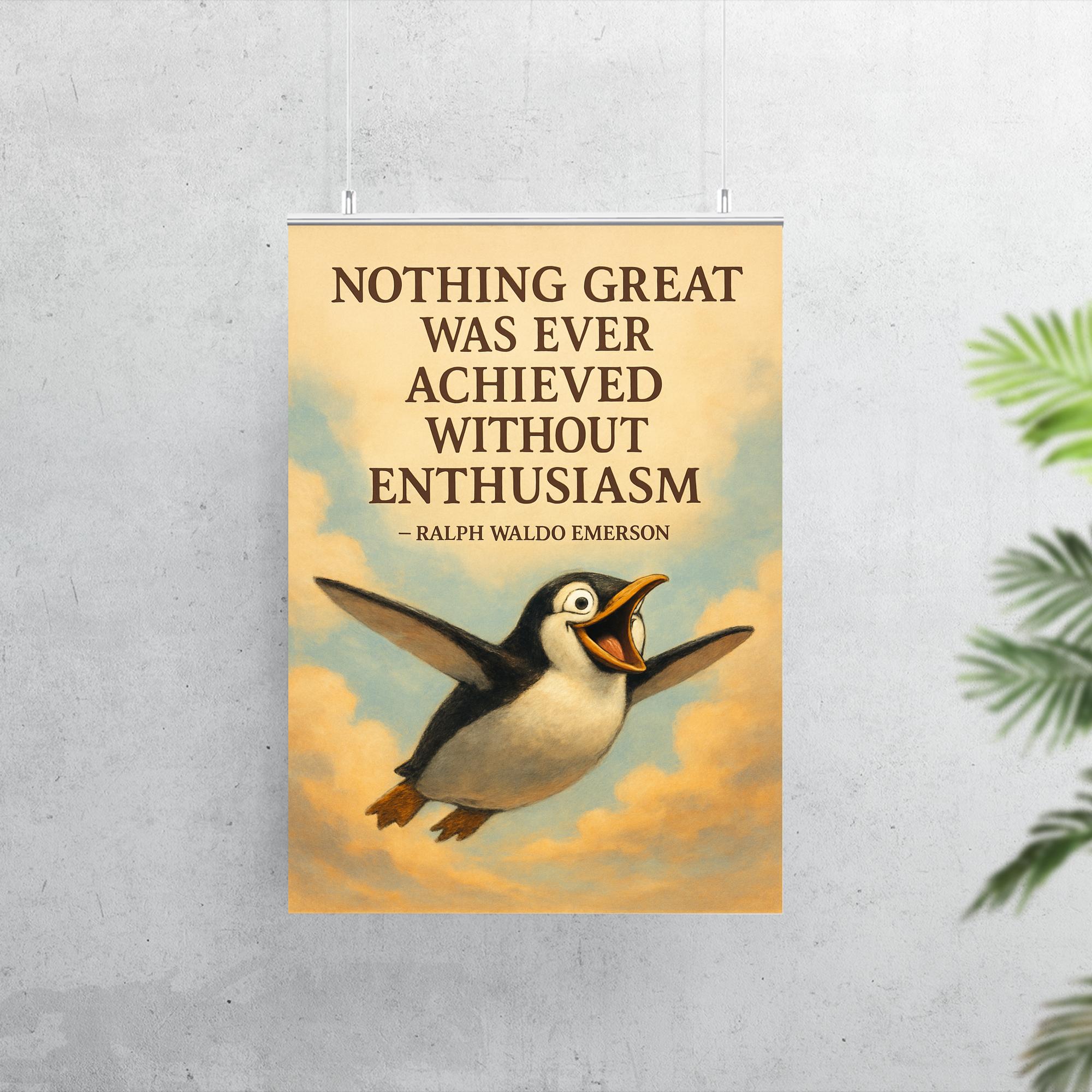 Ignite your passion every day with this inspiring poster featuring Ralph Waldo Emerson's timeless quote, "Nothing great was ever achieved without enthusiasm." Perfect for fueling motivation and uplifting any space, this piece celebrates the power of spirited determination and the soaring spirit symbolized by the penguin’s flight. Elevate your surroundings with a bold reminder that enthusiasm is the key to greatness.