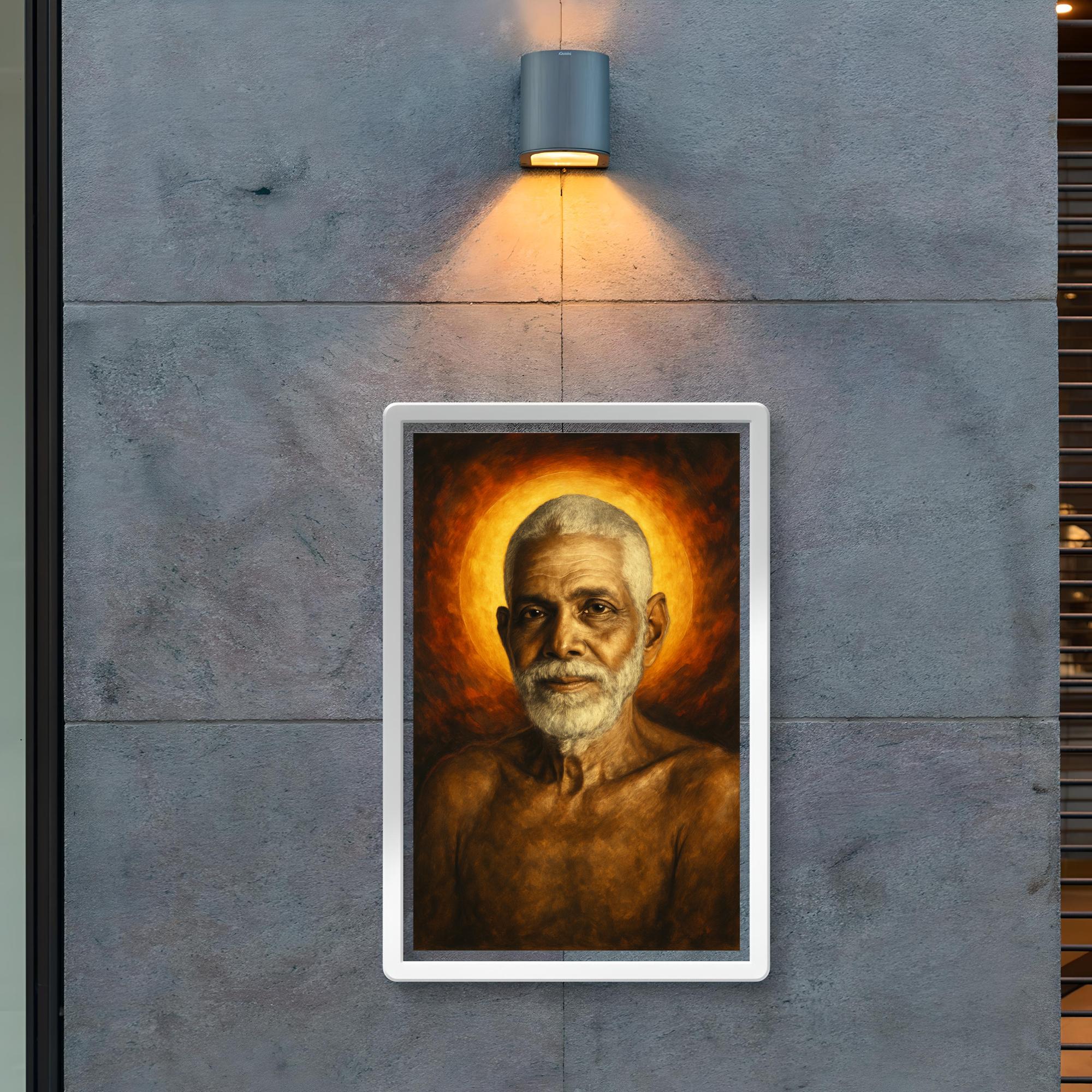 Elevate your space with this striking portrait of Ramana Maharshi, capturing the serene presence of one of spiritual history’s most revered sages. Perfect for meditation rooms, living spaces, or anywhere you seek calm and inspiration, this poster invites you to pause and reflect on the timeless wisdom he embodied. Let his peaceful gaze transform your environment into a sanctuary of inner stillness.