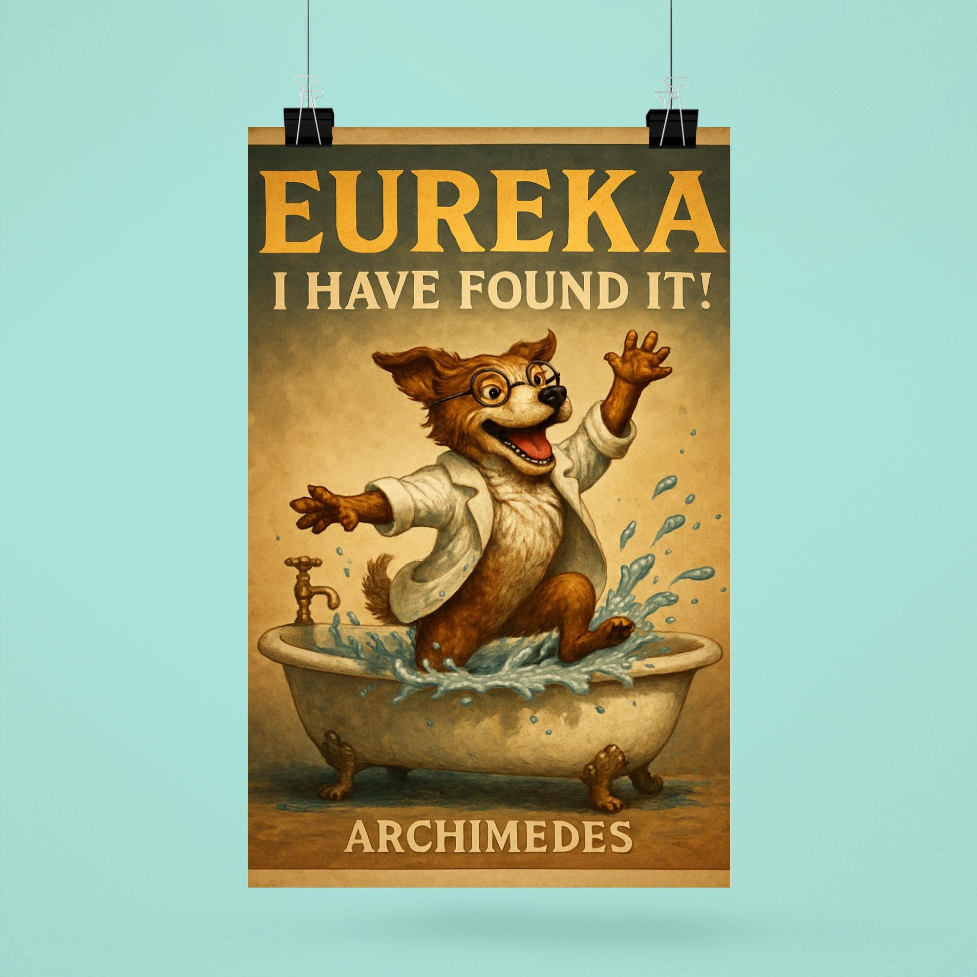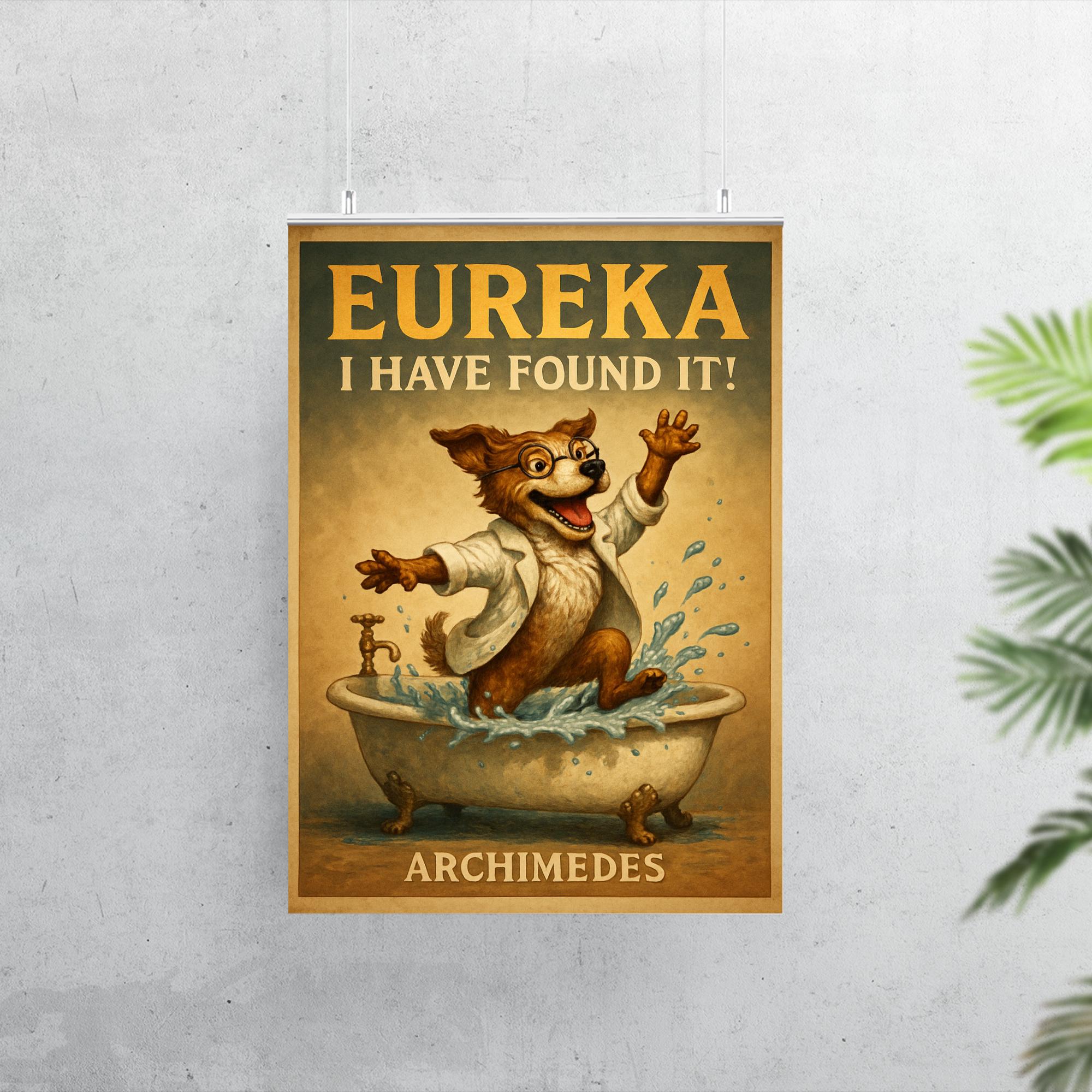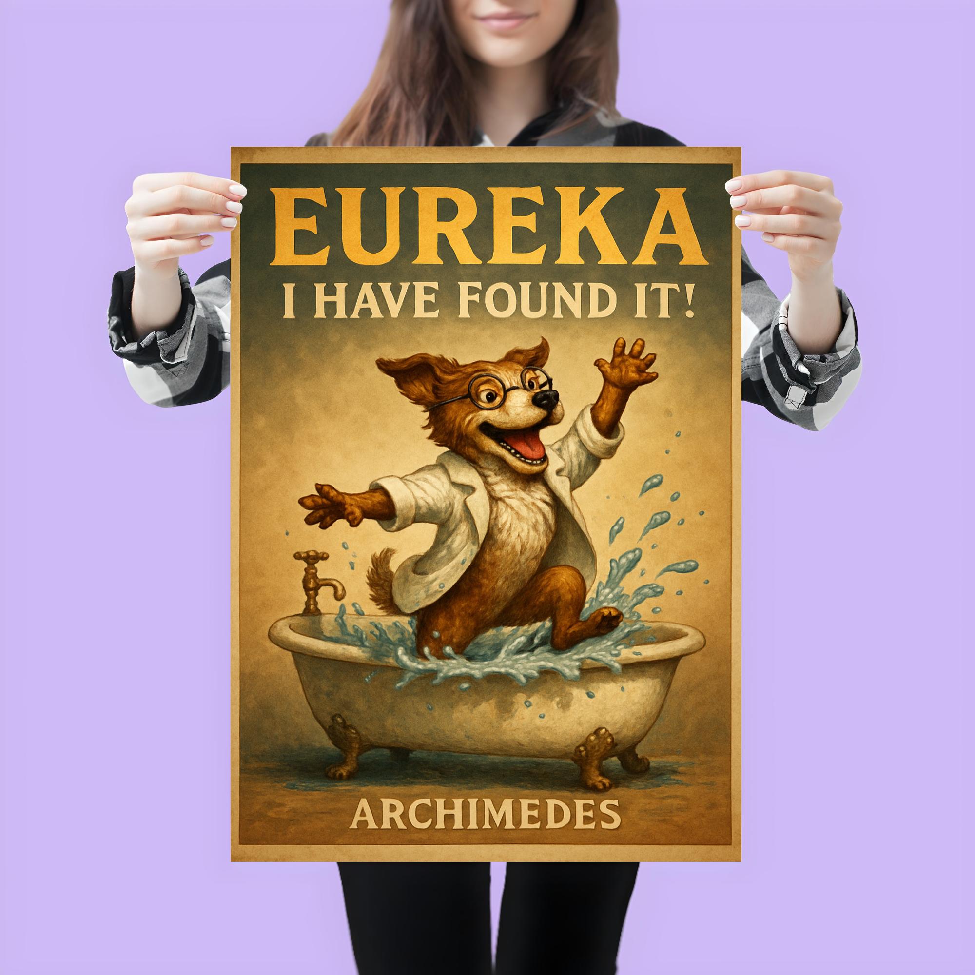 Capture the thrilling spark of discovery with this electrifying poster featuring a scientist dog leaping from a bathtub, shouting “Eureka!” Just like Archimedes' moment of genius, this playful image brings a burst of inspiration and joy to any space, reminding us that breakthrough ideas can strike when we least expect them. Perfect for creative minds eager to embrace curiosity and delight in the thrill of aha moments.