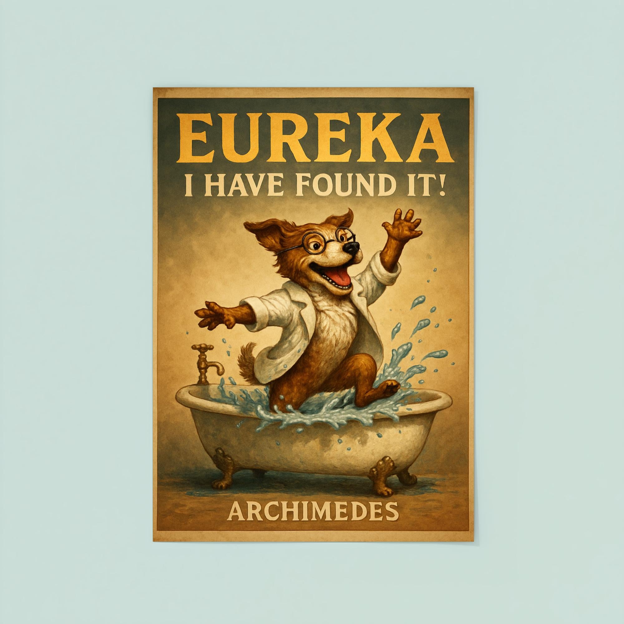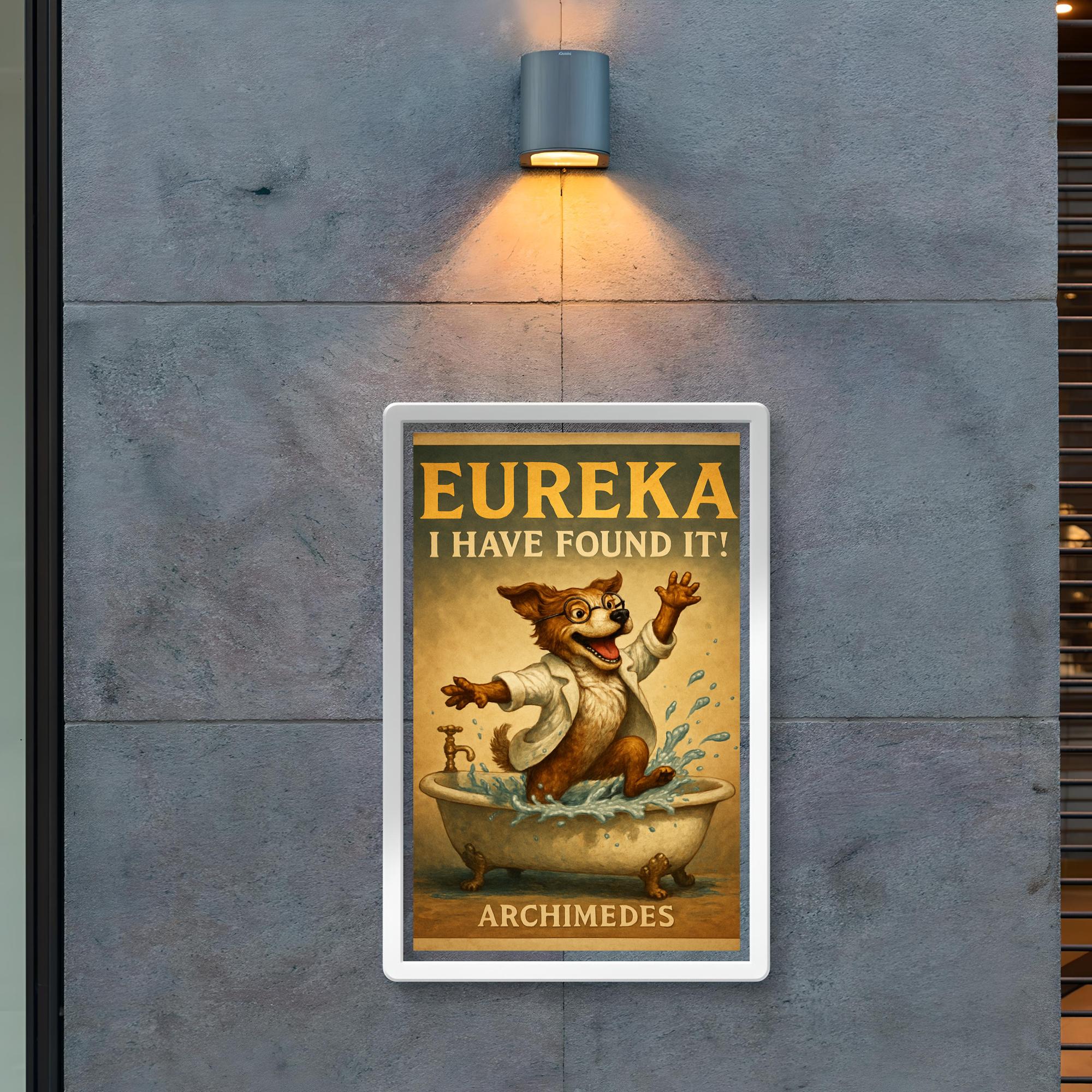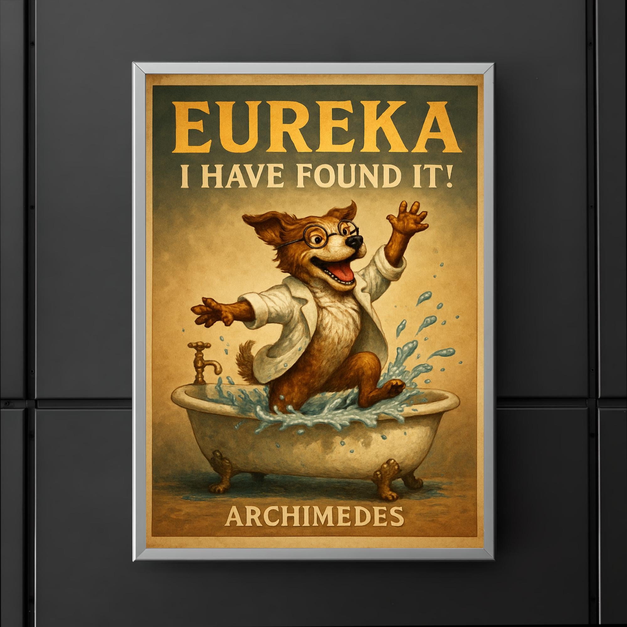 Capture the thrilling spark of discovery with this electrifying poster featuring a scientist dog leaping from a bathtub, shouting “Eureka!” Just like Archimedes' moment of genius, this playful image brings a burst of inspiration and joy to any space, reminding us that breakthrough ideas can strike when we least expect them. Perfect for creative minds eager to embrace curiosity and delight in the thrill of aha moments.