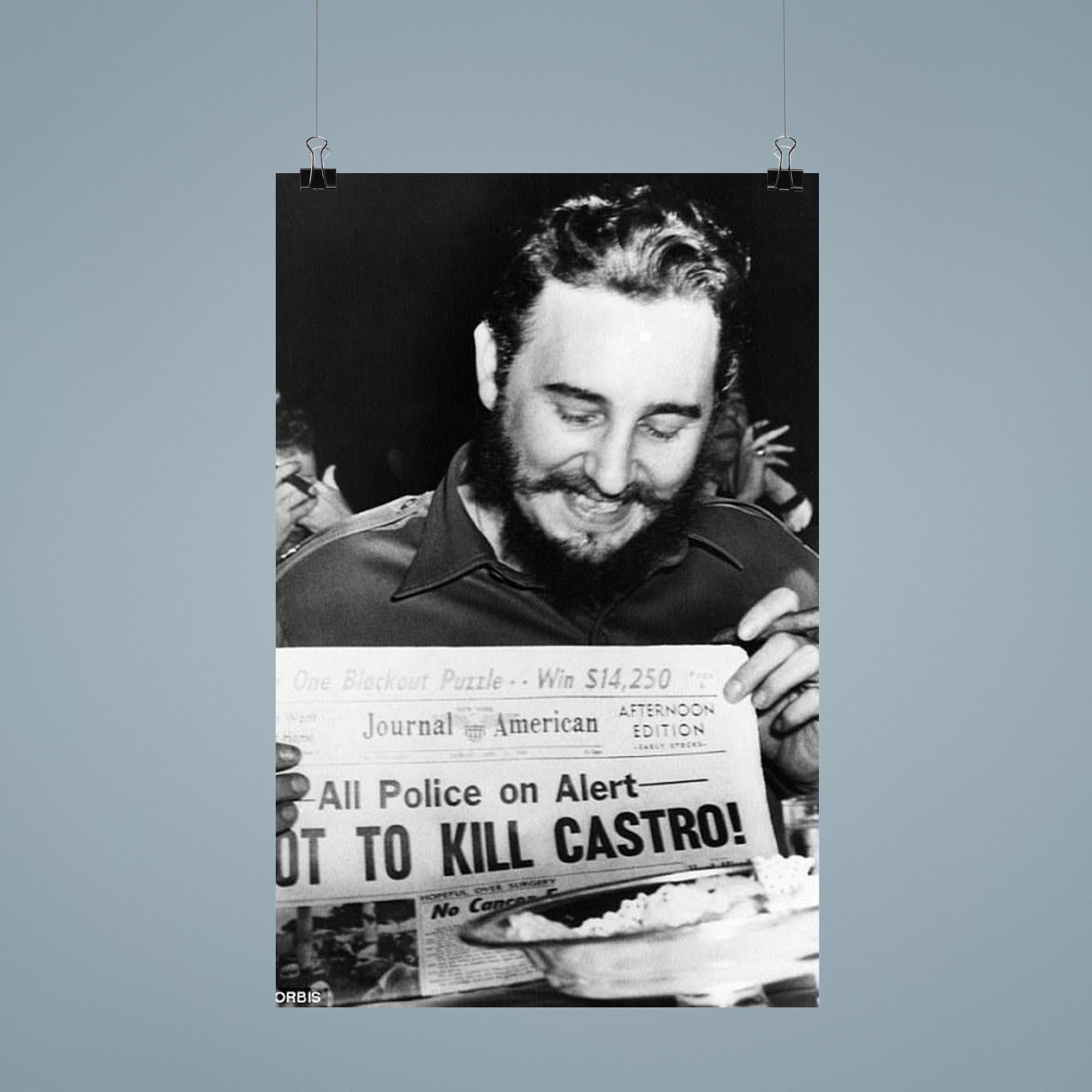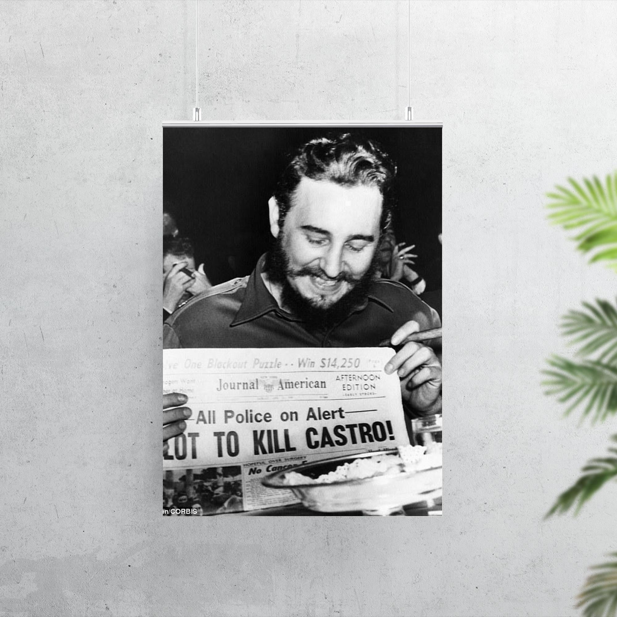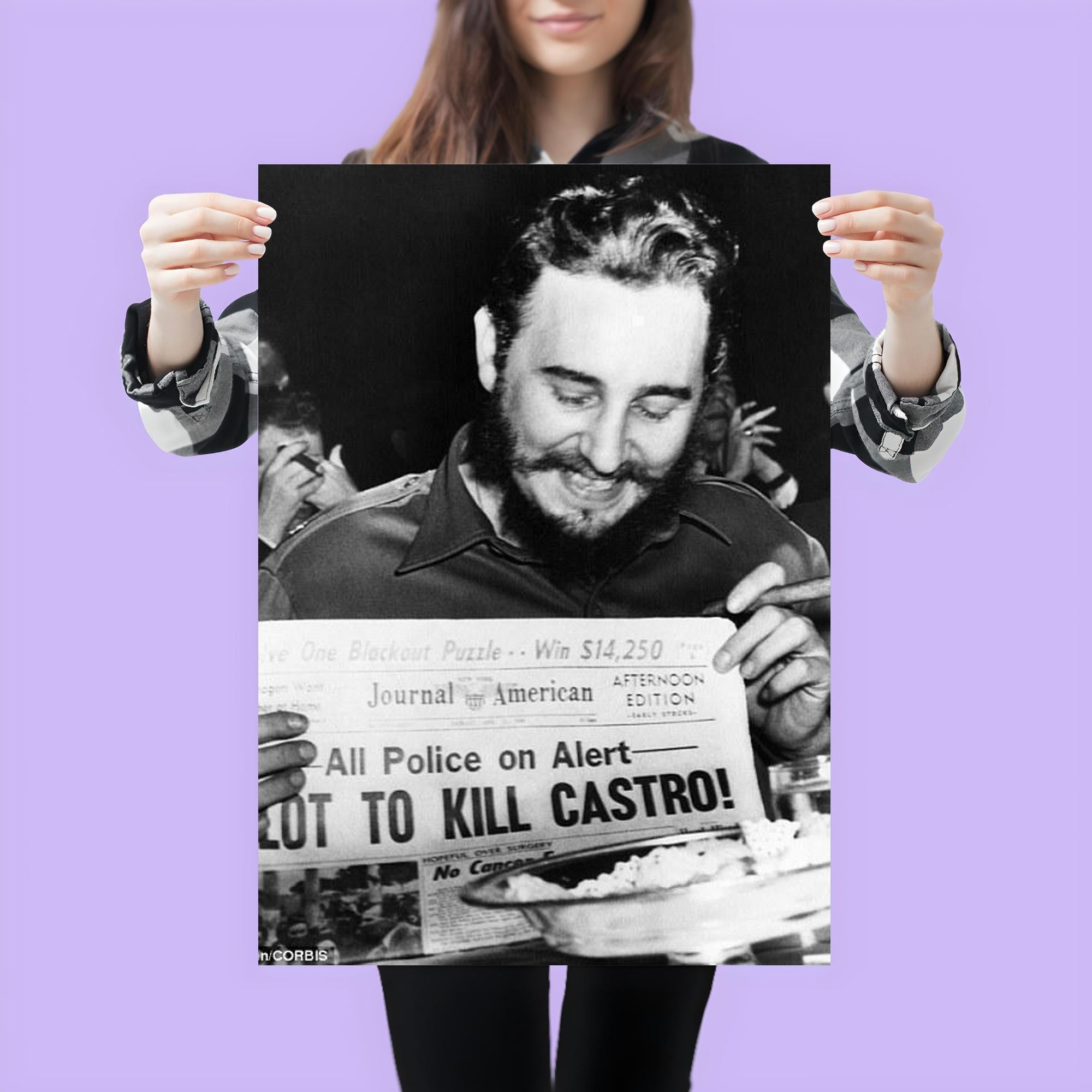 Capture a striking moment in history with this iconic poster of Fidel Castro laughing at a newspaper headline in New York, 1959. This powerful image reflects a rare glimpse of levity amid a defining era, making it a compelling addition to any collection or living space. Perfect for those who appreciate historical depth and bold statements in their decor.