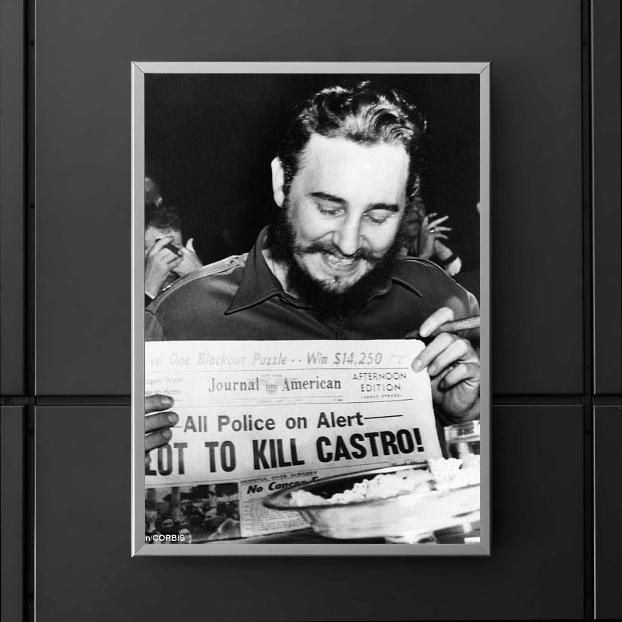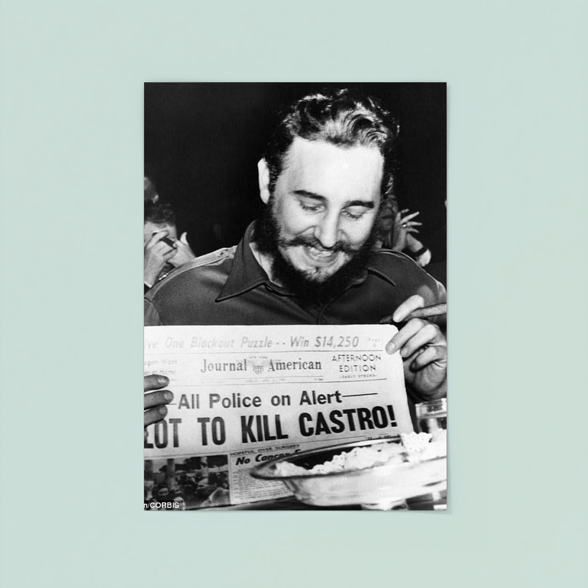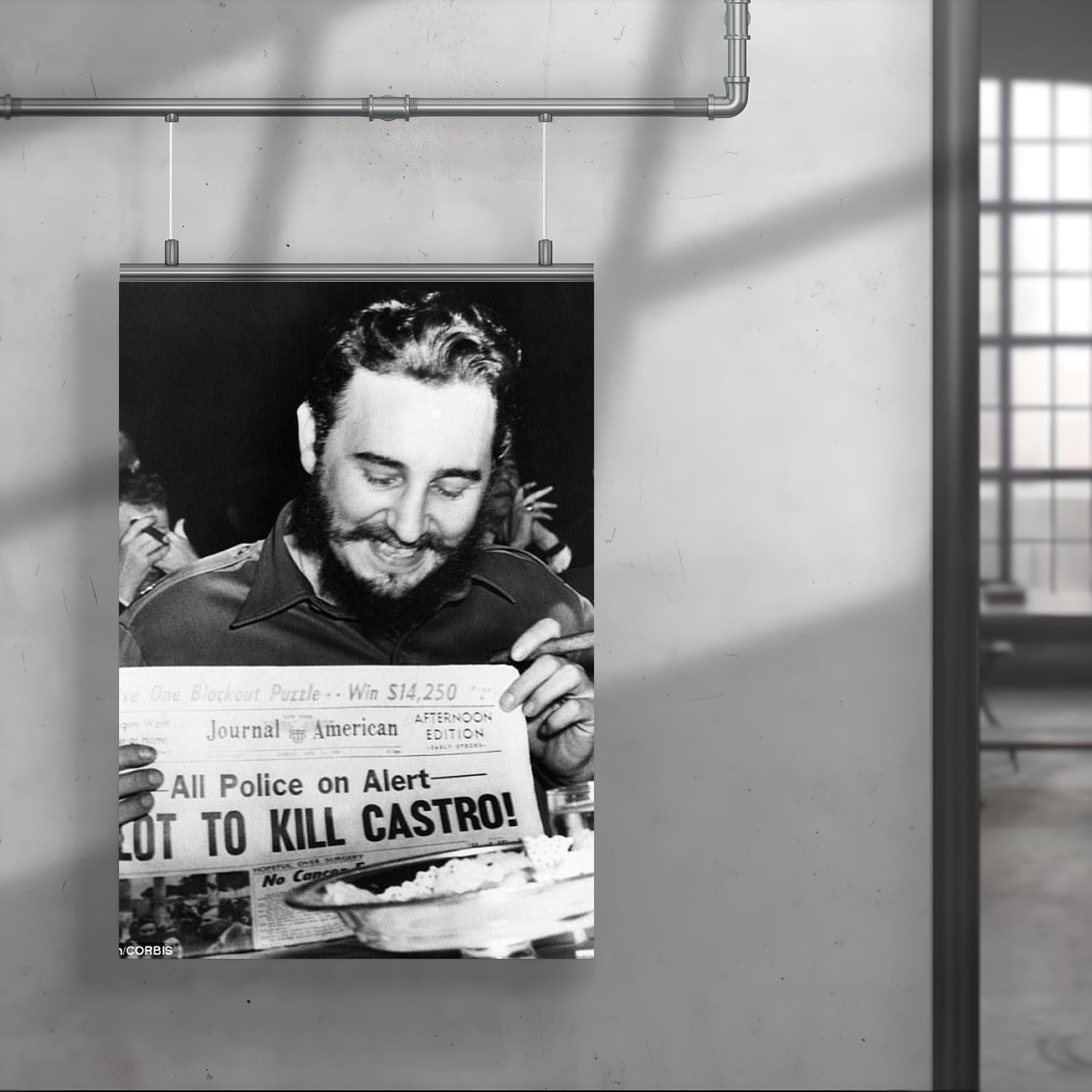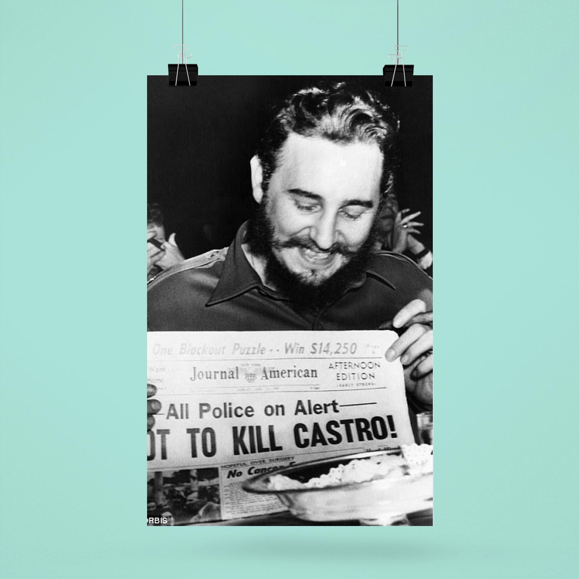 Capture a striking moment in history with this iconic poster of Fidel Castro laughing at a newspaper headline in New York, 1959. This powerful image reflects a rare glimpse of levity amid a defining era, making it a compelling addition to any collection or living space. Perfect for those who appreciate historical depth and bold statements in their decor.