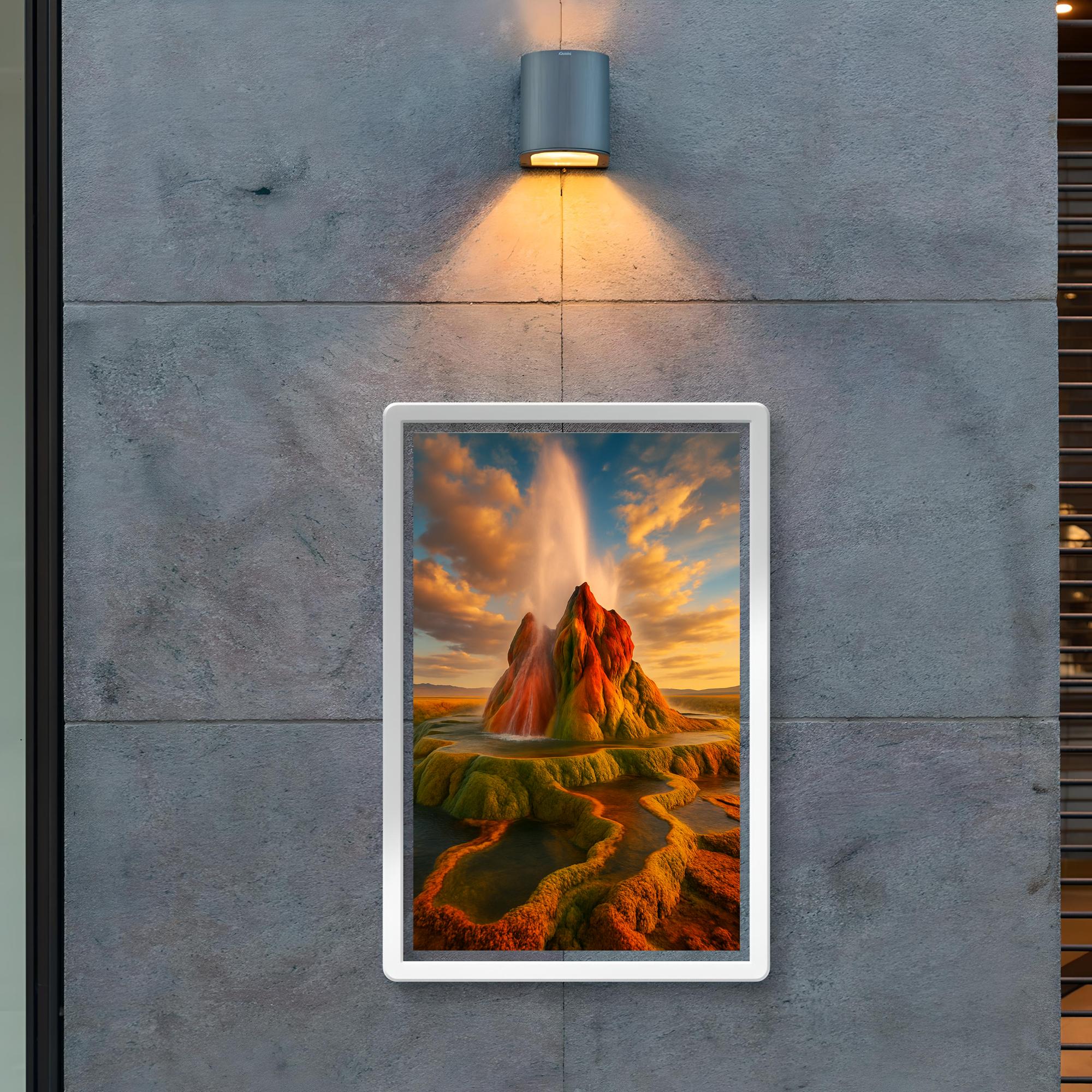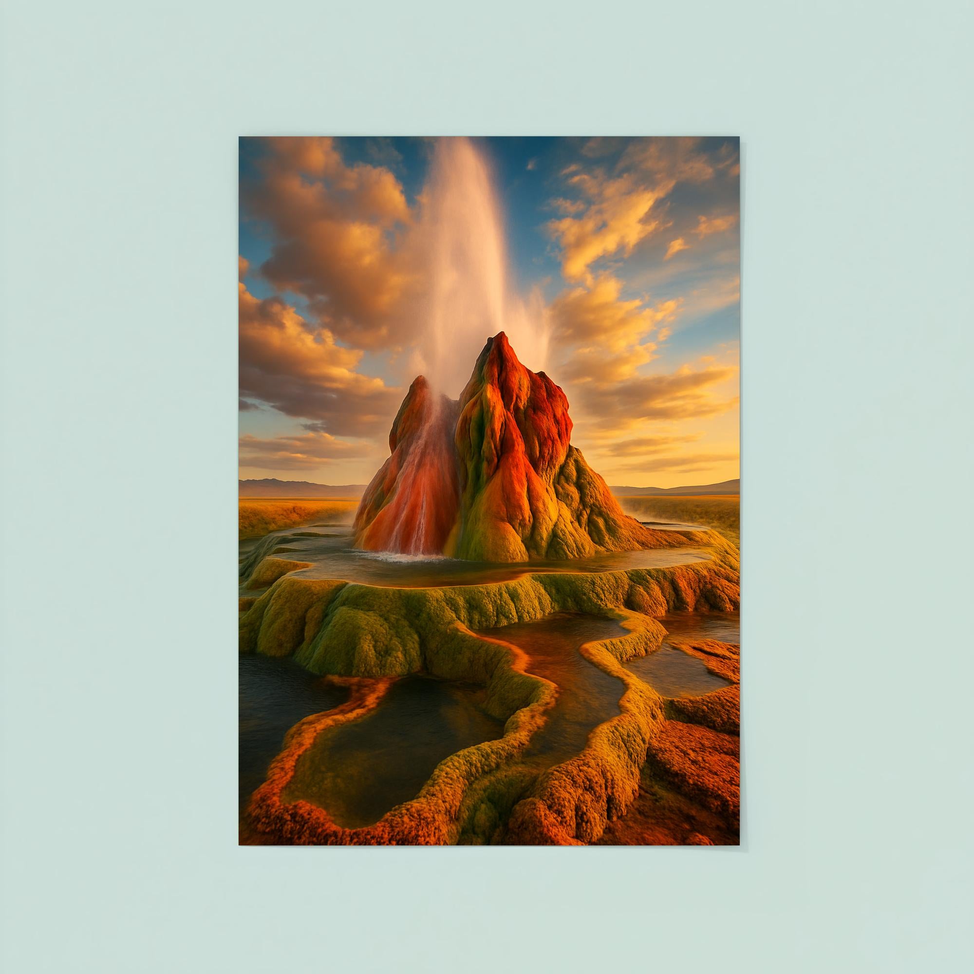 Transform your space with this stunning poster of Fly Geyser, Nevada—a natural wonder that captures the raw beauty and vibrant energy of one of the West’s most unique geothermal marvels. Perfect for adventurers and nature lovers alike, this artwork invites the spirit of the desert’s surreal landscape right into your home or office.